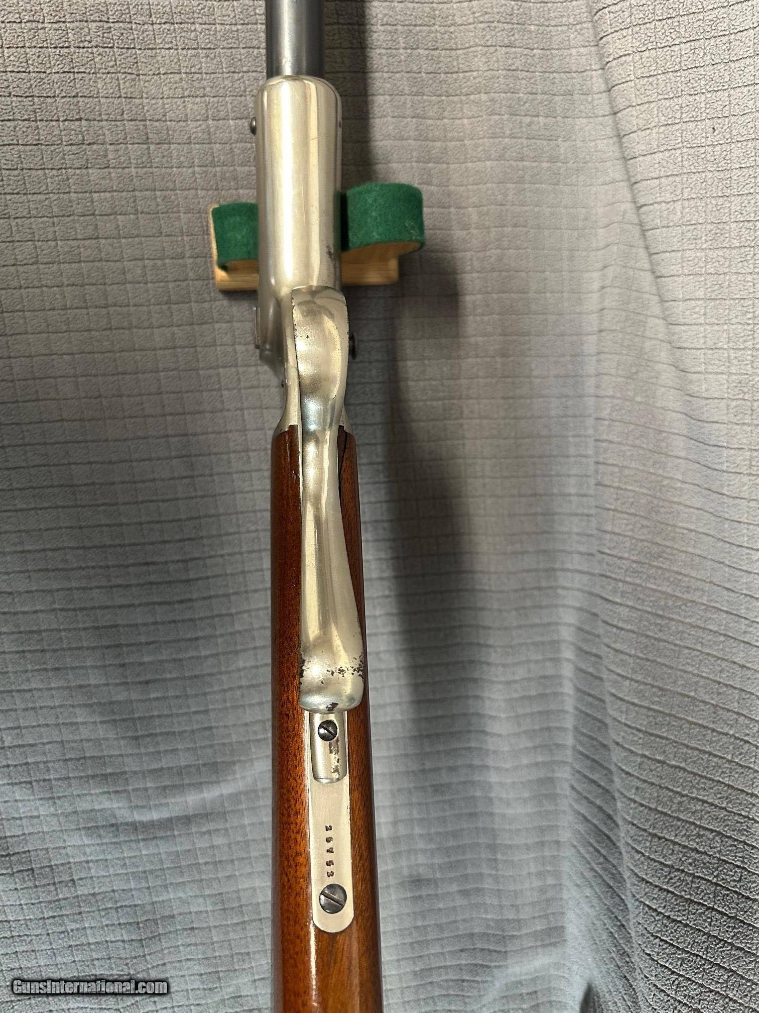Description: *VERY NICE* Stevens #1 Tip-Up Rifle without forearm, in .22 Rimfire.( S/L/LR). Circa 1880's. This piece is in wonderful condition for 130years old. Gun functions as it should. 24" half octagon barrel with excellent bore. Sharp rifling and no pitting. Tang sight as well as rear barrel sight and fold down globe front. Some flaking of nickel finish on lever and right side of receiver, but quite minimal overall. Blueing is quite good, but may be an old reblue, based only on the loss of most of the address line under the J. Stevens on barrel flat. Wood finish looks original and is overall very good, There is a small crack at receiver on top left side of tang(see pic). also a fine crack coming off bottom of top tang on right side. Otherwise this old relic is superb. Stock is tight and solid. A very neat old antique piece in great shape. No FFL needed for this one. $50.00 Shipping & Insurance(lower 48) Thanks for looking. SOLD Antique: Yes |