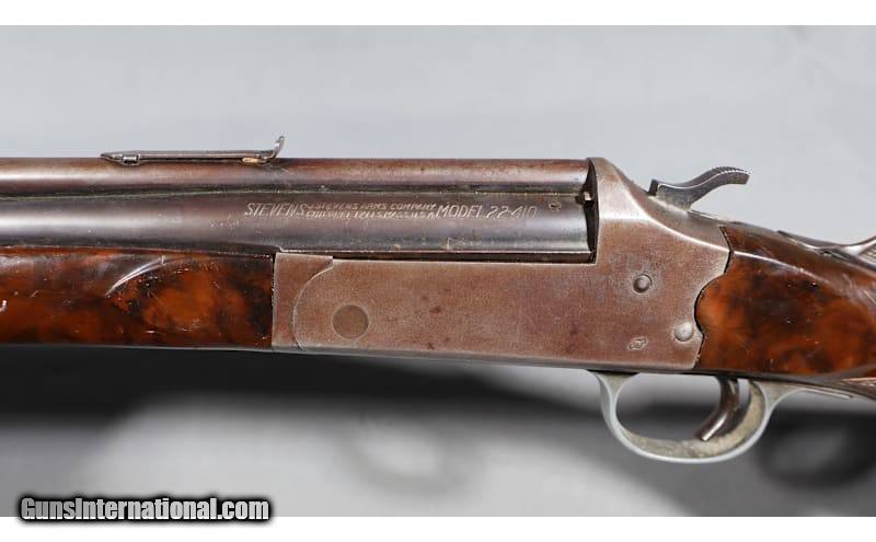 Description: For your consideration, we have a Stevens 22-410, over & under firearm to offer. A kids dream gun with .22 caliber on top and .410 gauge on the bottom. This 22-410 shows wear but functions well. You may purchase this used firearm on the Bass Pro Shops/Cabelas by adding it to your Cart, or you may contact the Wichita, Kansas Gun Library at (316) 854-0748. Your purchase will be shipped free of charge to the Bass Pro Shops/Cabelas store nearest to your location. Thank You for your interest and for shopping Bass Pro Shops. .22 LR/.243 Win Chambers: .22 LR over 3" .410 gauge Metal Condition: Fair condition Bore Condition: Good condition Barrels: 2" barrels Triggers: Curved trigger with smooth facing Stock Dimensions: 40.5" overall length and a 13.75" LOP Fore End: Plastic forearm stock Butt Pad: Plastic butt stock Weight: 4 lbs Sights: Front fixed and rear adjustable sights Item Location: Wichita, KS Price: $499.99 Contact Seller |