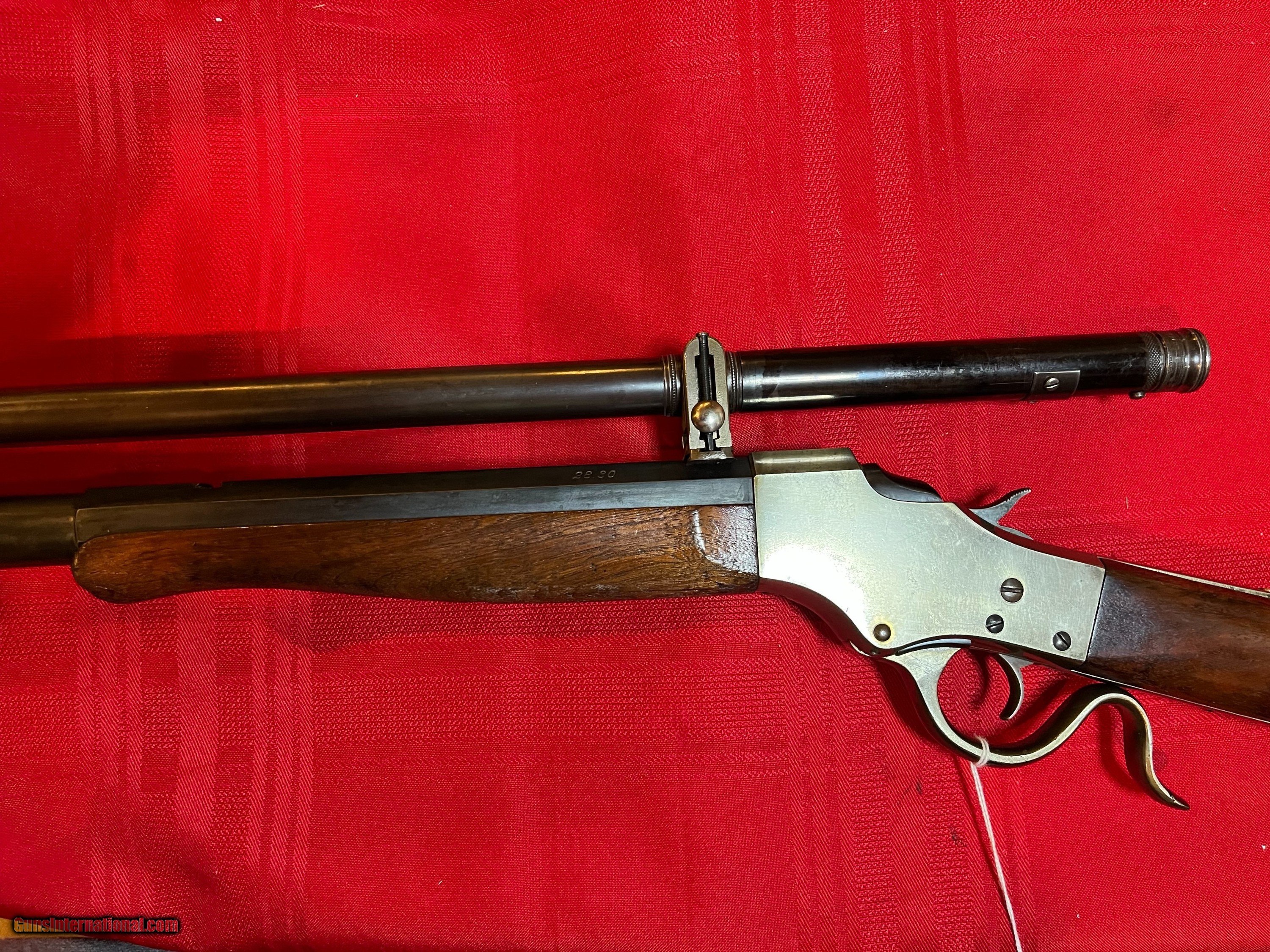 Description: Malcom scoped Stevens 28-30 rifle. Receiver marked 44 1/2, 00. 28" half- round, half- octagon barrel with excellent bore measures 13/16" at muzzle. Original stocks with butt plate. Scope marked "WM MALCOM / SYRACUSE NY" SOLD Curio/Relic: Yes Rifle Caliber: .28-30 Stevens |