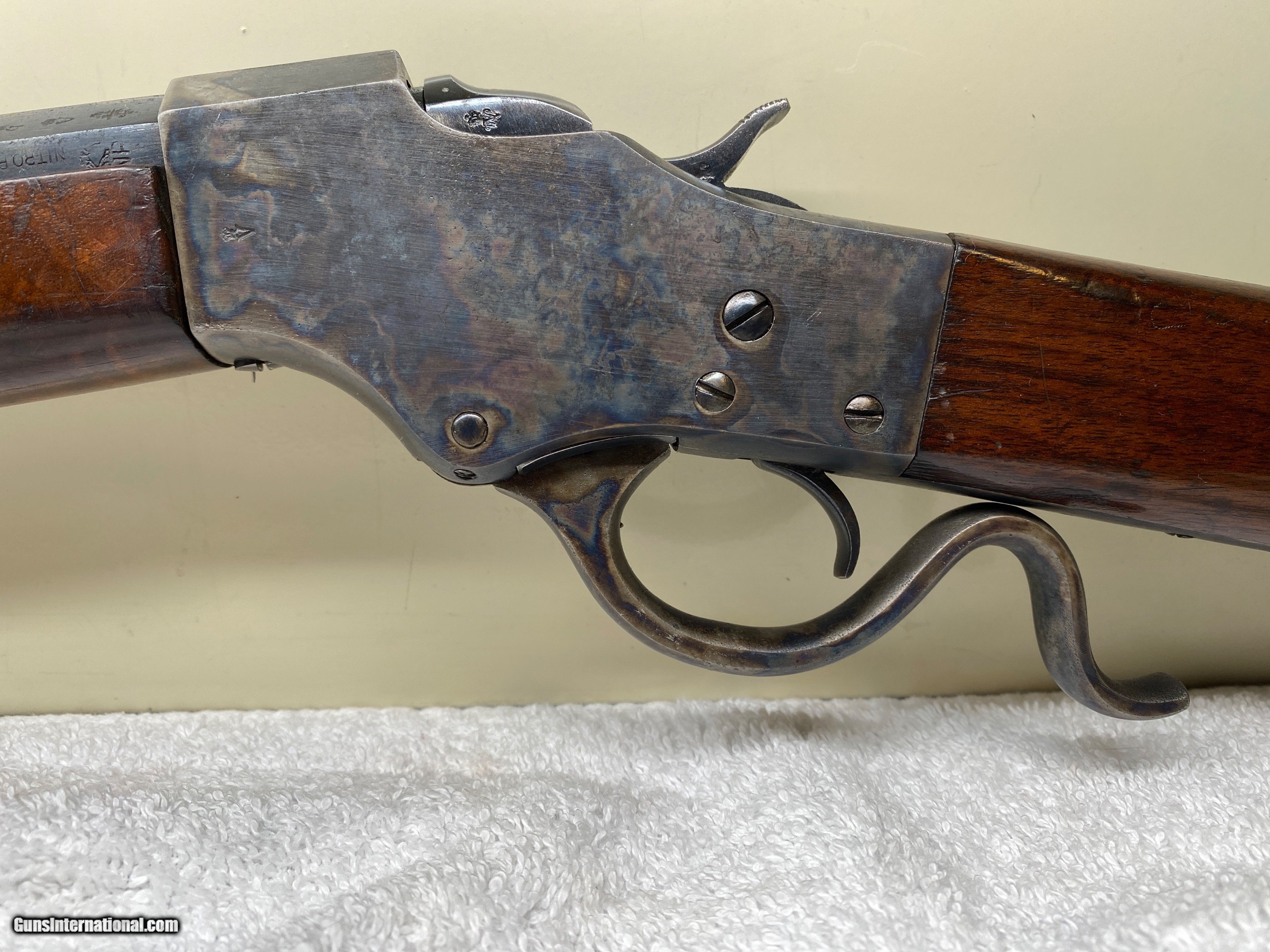 Description: SOLD RARELY SEEN STEVENS IDEAL ENGLISH MODEL 44 1/2 RIFLE 26” rapid taper half octagon barrel with Stevens embossed hard rubber shotgun style butt plate. The “English Model” was made in limited numbers in rim fire calibers and in .25-20 and .32-20 center fire calibers. This particular rifle was originally 25-20 SS, and later professionally re-bored and re-chambered to 32-20 wcf. Examples are few and far between. This is a fine rifle with nearly all the deep blue remaining on the barrel. The receiver retains most of the original case color. Excellent stock and forend with tight wood to metal fit, accurate, excellent bore. Lyman blade/bead front sight. Ladder type rear sight. Tight action, as would be expected on a 44 ½ receiver. English proof marks visible. Money order preferred, $50.00 shipping . SOLD Curio/Relic: Yes Rifle Caliber: .32-20 Winchester Manufacturer: Stevens Model: 44 1/2 Ideal Serial Number: 820 Barrel Length: 26 Bore: 32 Chambers: 32-20 wcf Condition: excellent Metal Condition: excellent Wood Condition: good Bore Condition: excellent Barrel Type: half octagon Action: falling block Triggers: original Stock: walnut Weight: 6# Manufacture Date: 1900-10 Item Location: Northern New York Proof:Nitro: english |