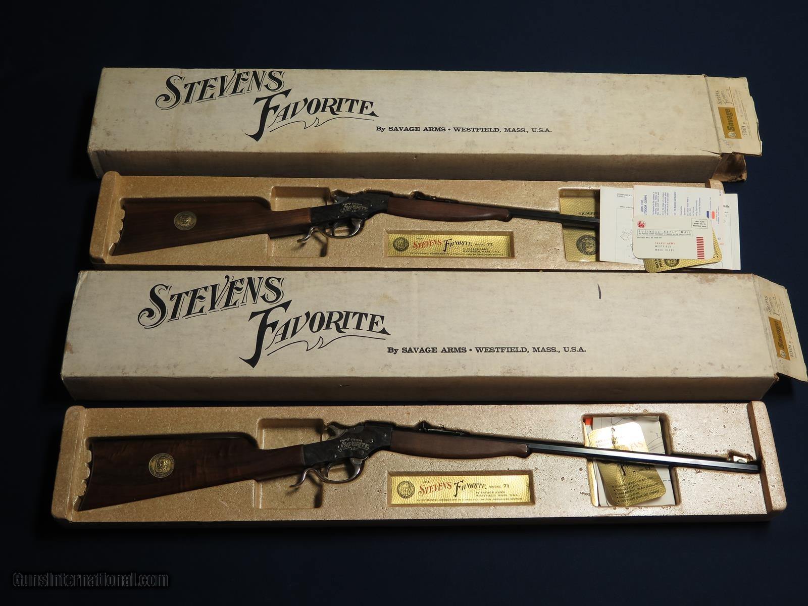 Description: 2 Stevens Favorite 71 22 S,L,LR by Savage Arms Co. Guns have consecutive serial numbers. 99% in box's with papers. SOLD |
