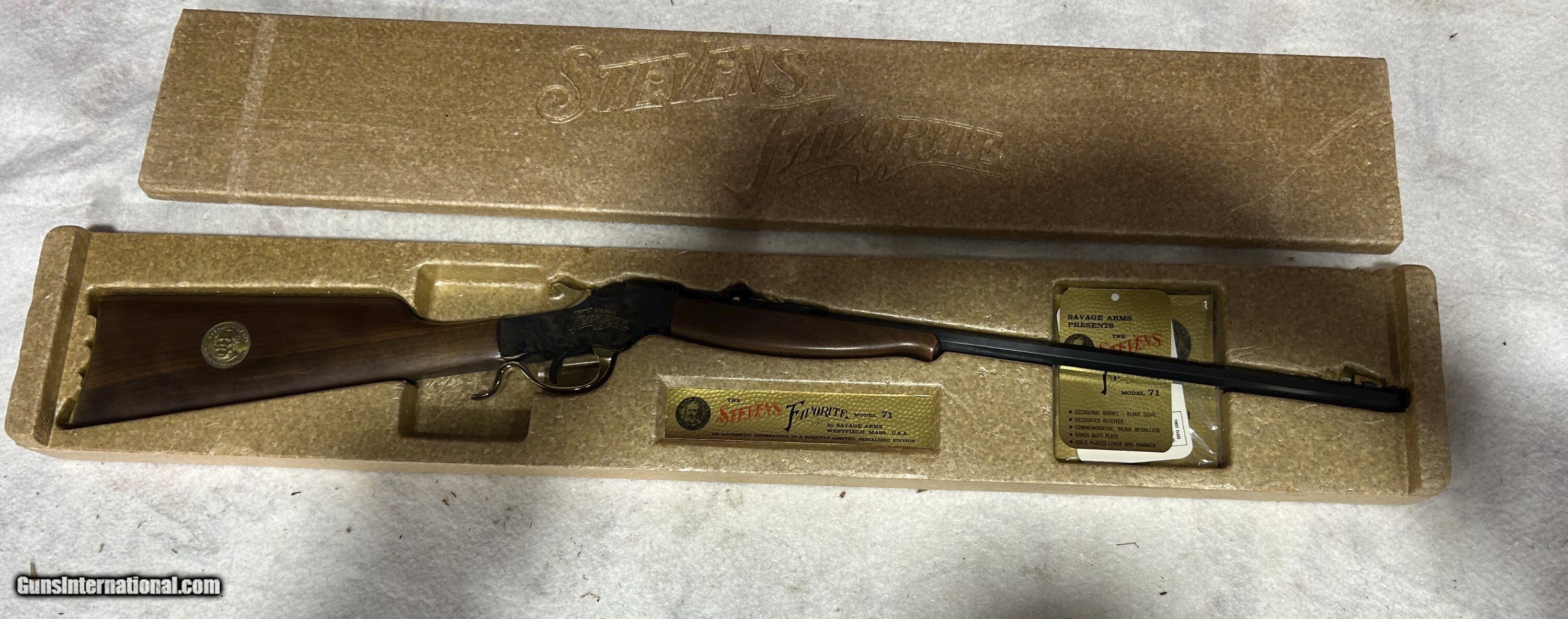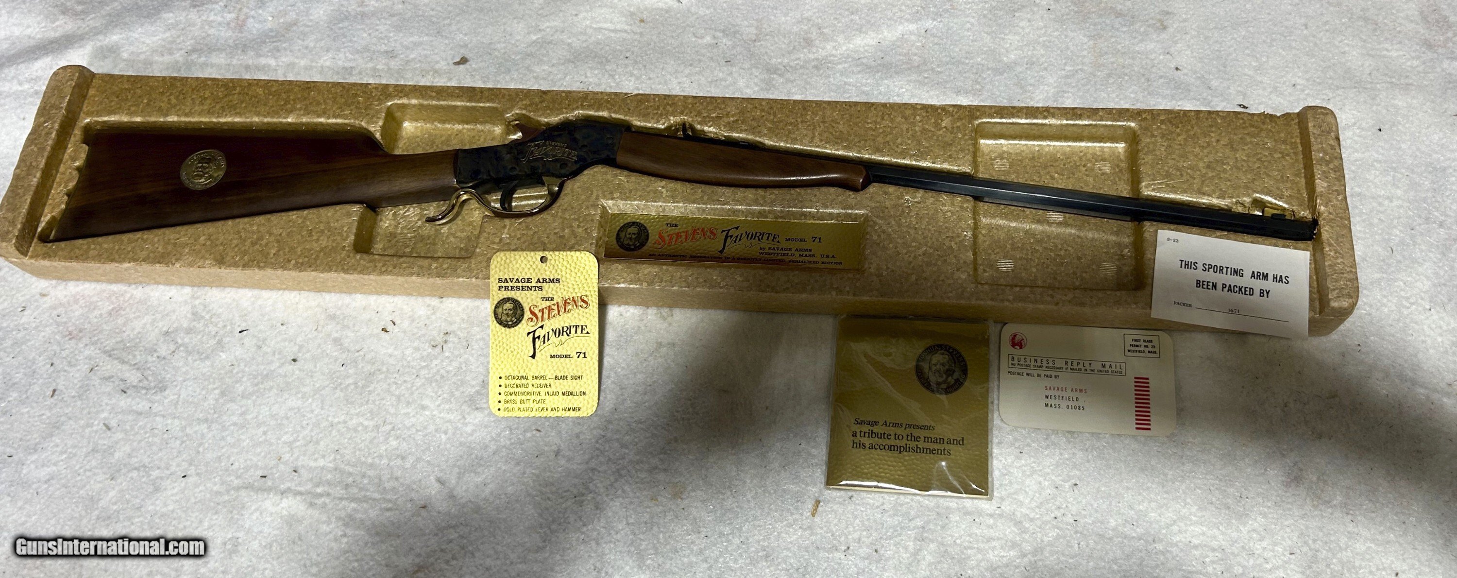 Description: NIB STEVENS FAVORITE MODEL 71 COMMEMORITIVE , 22Lr. , I did not get the outer sleve for this box , you will not get it ither $650.00 + $65 Shipped to your FFL, or C&R for payment iaccept: Posatl moeny orders , Ships next day Pesonal checks, my bank requires 11 buisness dats to guarante me funds for checks , i will ship day 12 Price: $650.00 Shipping: $65.00 Contact Seller |