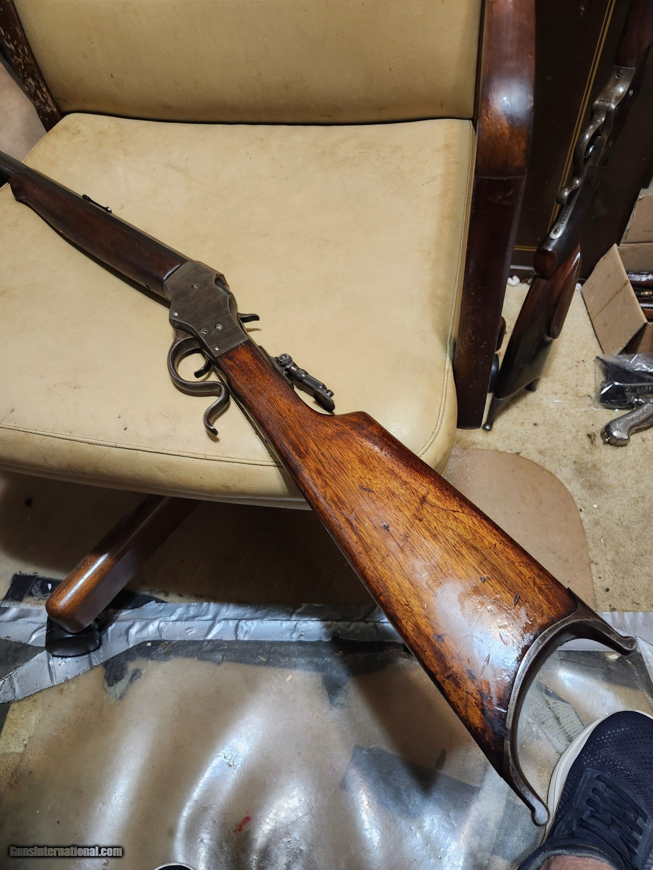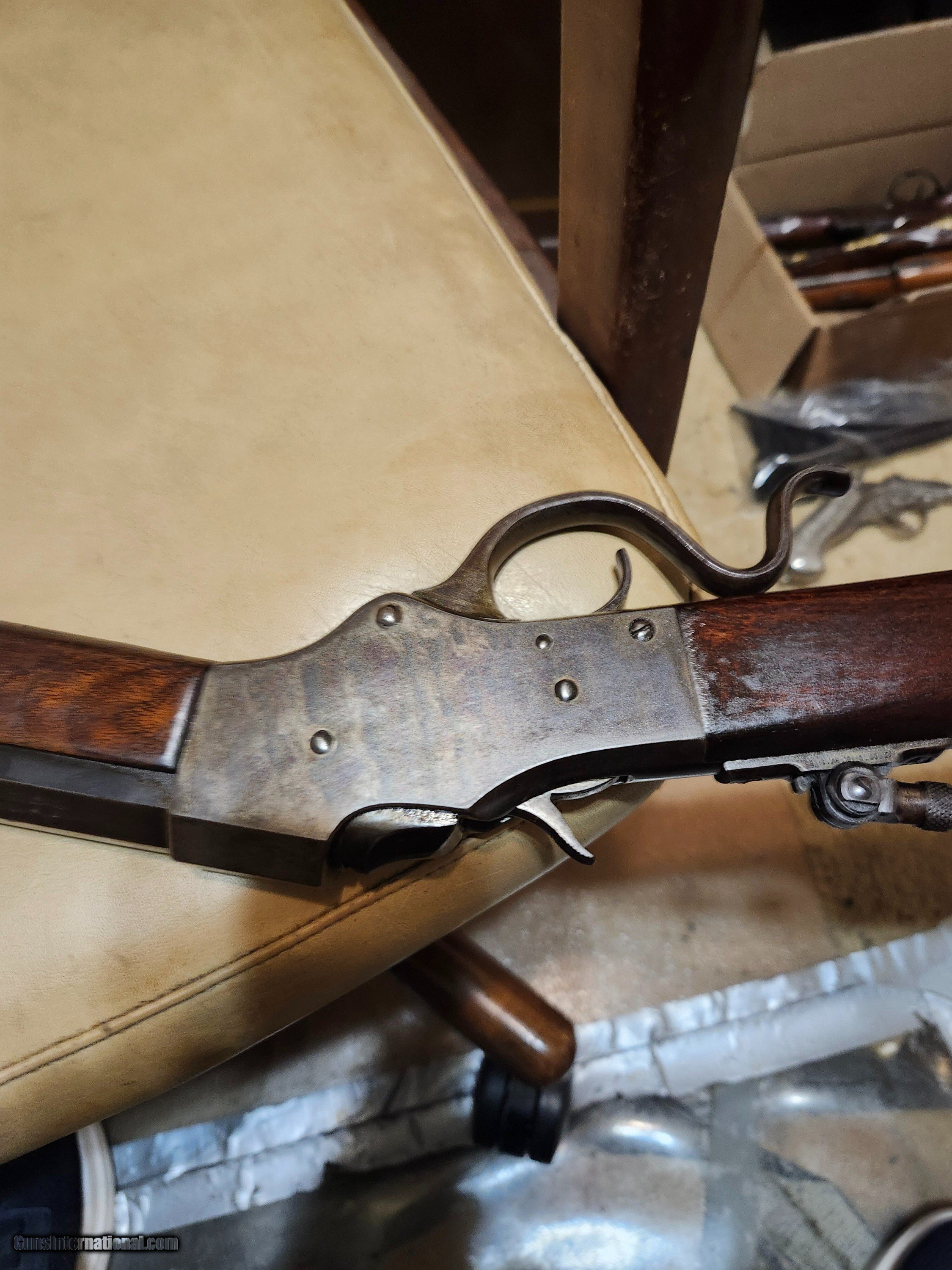 Description: standard model with exception barrel is 30 inches long // has lots of dull case on receiver / barrel about 80 % dull blue / shots fine/ about a 9 0f 10 bore / no chips or cracks in stock / has lots of original varnish// marbles tang sight and marbles rear barrel sight that has fold down leaf // beach front sight ivory insert///44 1/2 action / matching serial numbers 11124// $67 sh Curio/Relic: Yes Manufacturer: stevens Model: 45 Serial Number: 11124 Barrel Length: 30 Price: $1,495.00 Contact Seller |