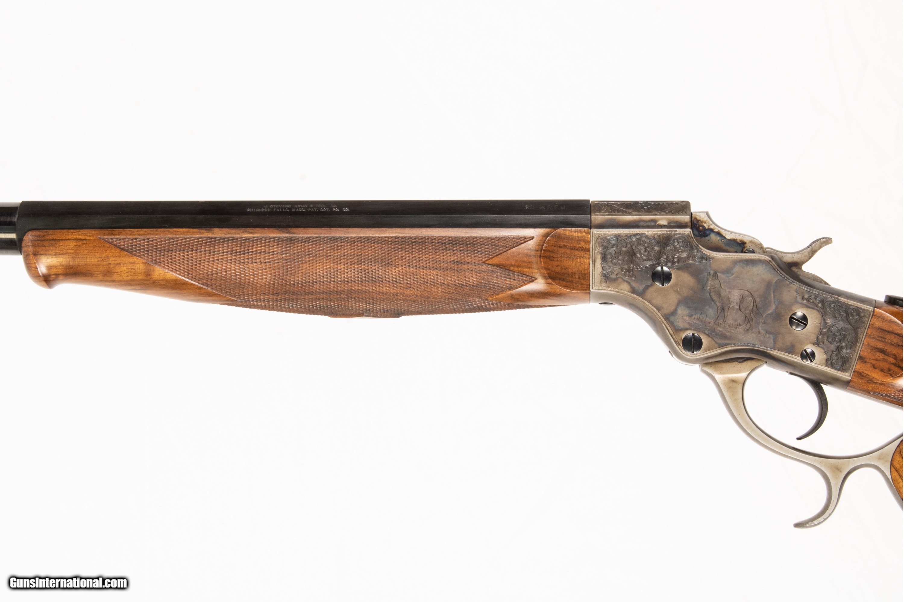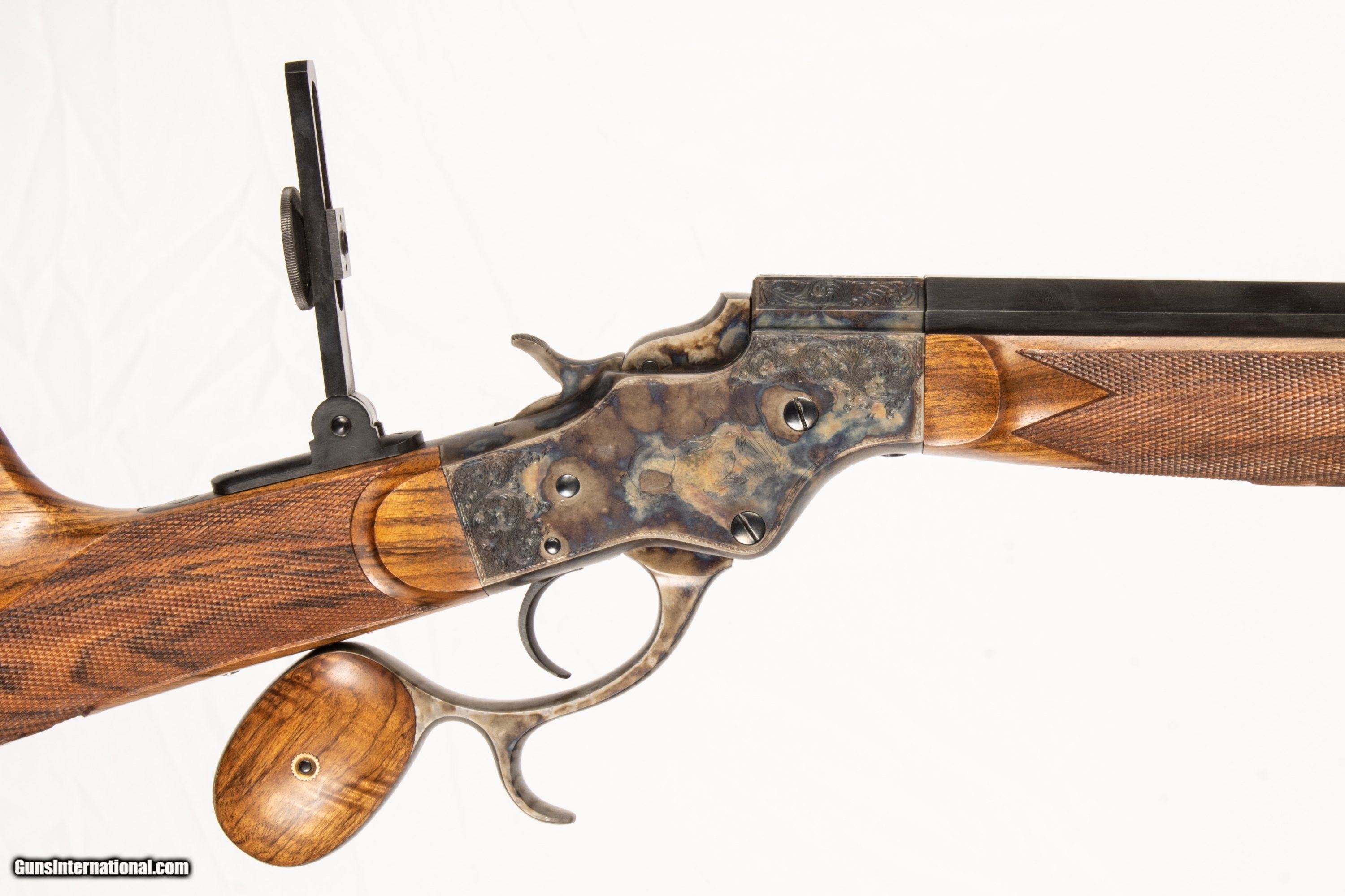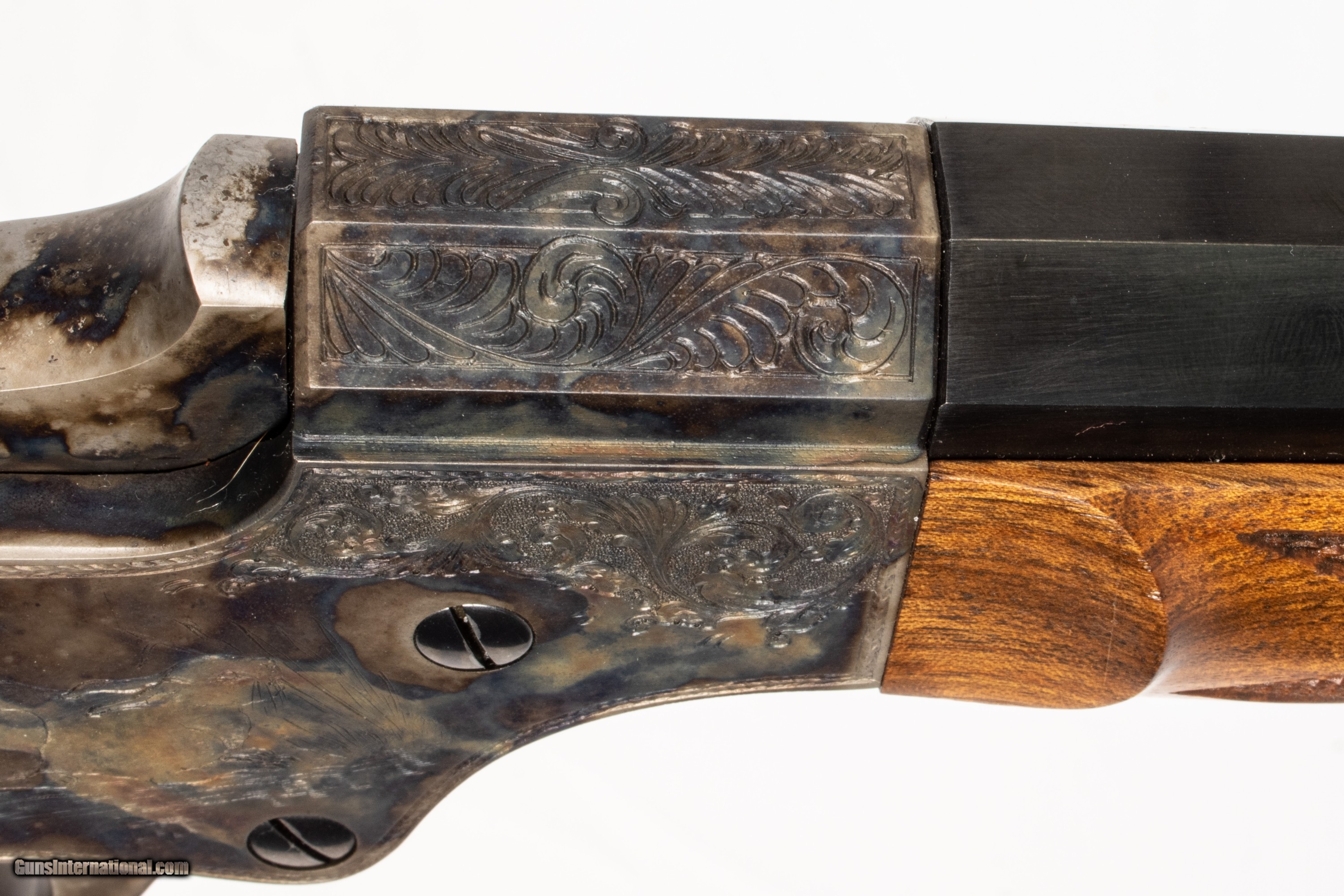 Stevens Model 44 chambered in 22 WRF with a 26 inch barrel and a bright & shiny bore. This firearm was custom made using the original frame of a Stevens Model 51. The frame was restored and the barrel was manufactured by A.K.'s Gun Shop by gunsmith Jim Baiar of Columbia Falls Montana. The caliber was changed to be more modern and usable. This firearm has engraving on both sides of the frame sporting a rabbit on the right and a fox on the left. This firearm is in good to very good condition and is covered by Dury's Lifetime Warranty.