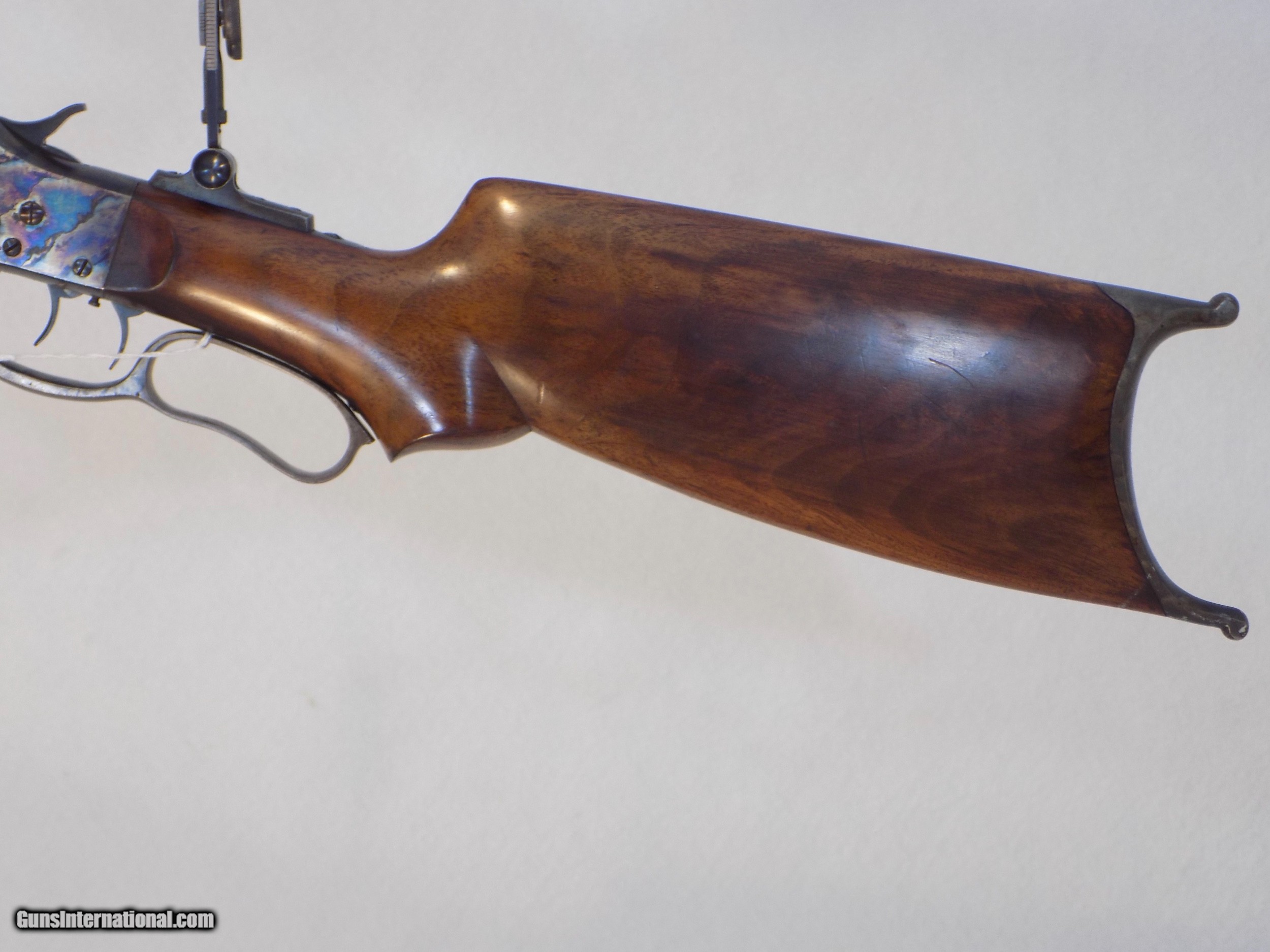 Description: #1034A STEVENS MODEL 47-44 1/2, 32-40, SN 103XX, extra heavy 32” 1/2 oct. bbl. with factory markings off to the side to allow for scope blocks, also P in a circle stamped on left side, Stevens vernier tang sight, windage adjustable globe front sight, provision for rear sight, scope blocks, PG stock with Swiss buttplate, 2 screw forend, extra fine grade wood in exc. condition, DST, 99% casehardening, 95% bbl. blue, exc. bore. $2750 SOLD Antique: Yes |