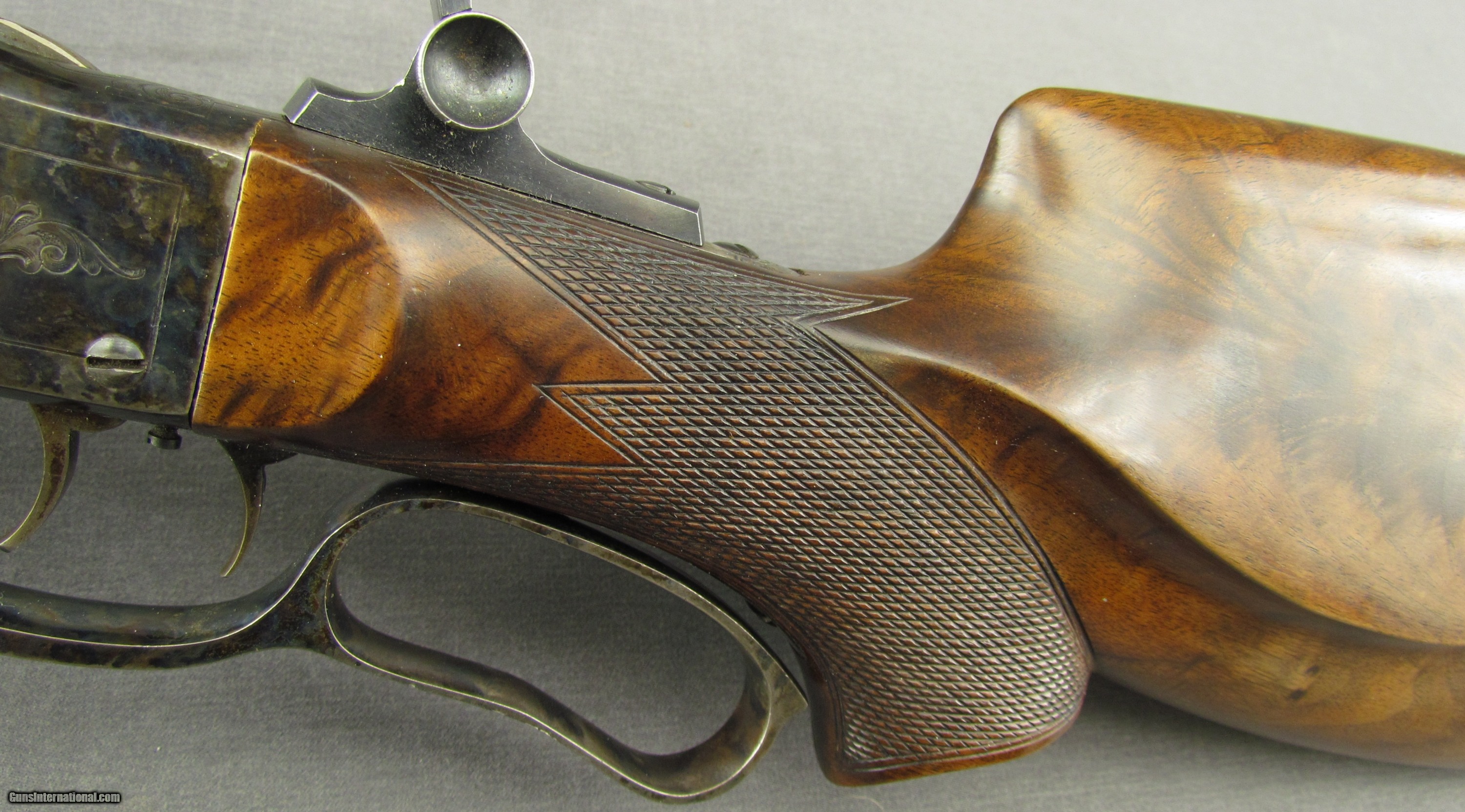 Description: Serial #10743, .28-30, 29" part octagon barrel with an excellent, bright bore. This is a fine looking rifle, built on a 44 1/2 action, that has retained 90-92% of the original blue finish on the barrel with the balance aged to a mellow plum-brown, and some silvering at the muzzle and edges of the barrel facets. Crisp Stevens markings are present at the breech, and a small and unobtrusive import mark is present on the underside just ahead of the forend tip. Two scope blocks have been fitted, but a target globe front sight, and Vernier tang sight are also installed. The frame has delicate floral scrollwork engraving and retains 97-98% of the original color case-hardening. The full-loop underlever retains a similar amount of color case-hardening. The mechanics are tight and functional, and the double-set triggers have a crisp let-off. The checkered walnut forend with schnabel tip is in fine shape with only a few minor handling marks in the lovely original oil finish, and the schutzen style buttstock has a checkered, pistol-grip, rounded cheek-piece, and case-hardened hooked butt. The buttstock is a well-made modern replacement, and the hooked buttplate needs some further fitting as there is a small, but noticeable gap between the wood and metal at the heel. Included with the rifle is a 1999 dated certificate from The Worshipful Company of Gunmakers that declares that the rifle was presented to them for examination, but not proof-fired due to its antique status. This is a splendid Stevens “schutzen Junior" and would make a wonderful addition to any collection. FFL or C&R SOLD Curio/Relic: Yes Manufacturer: Stevens Model: 52 Serial Number: 10743 Caliber Info: .28-30 Gauge Info: .28-30 |
