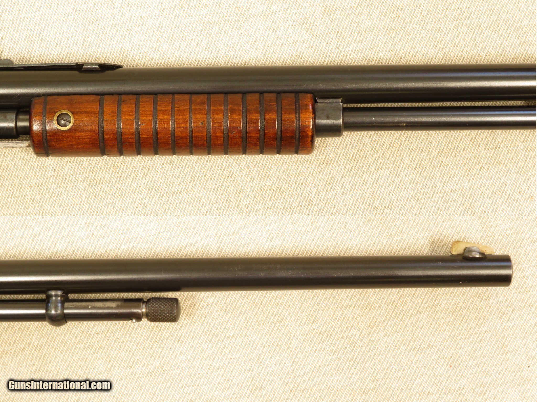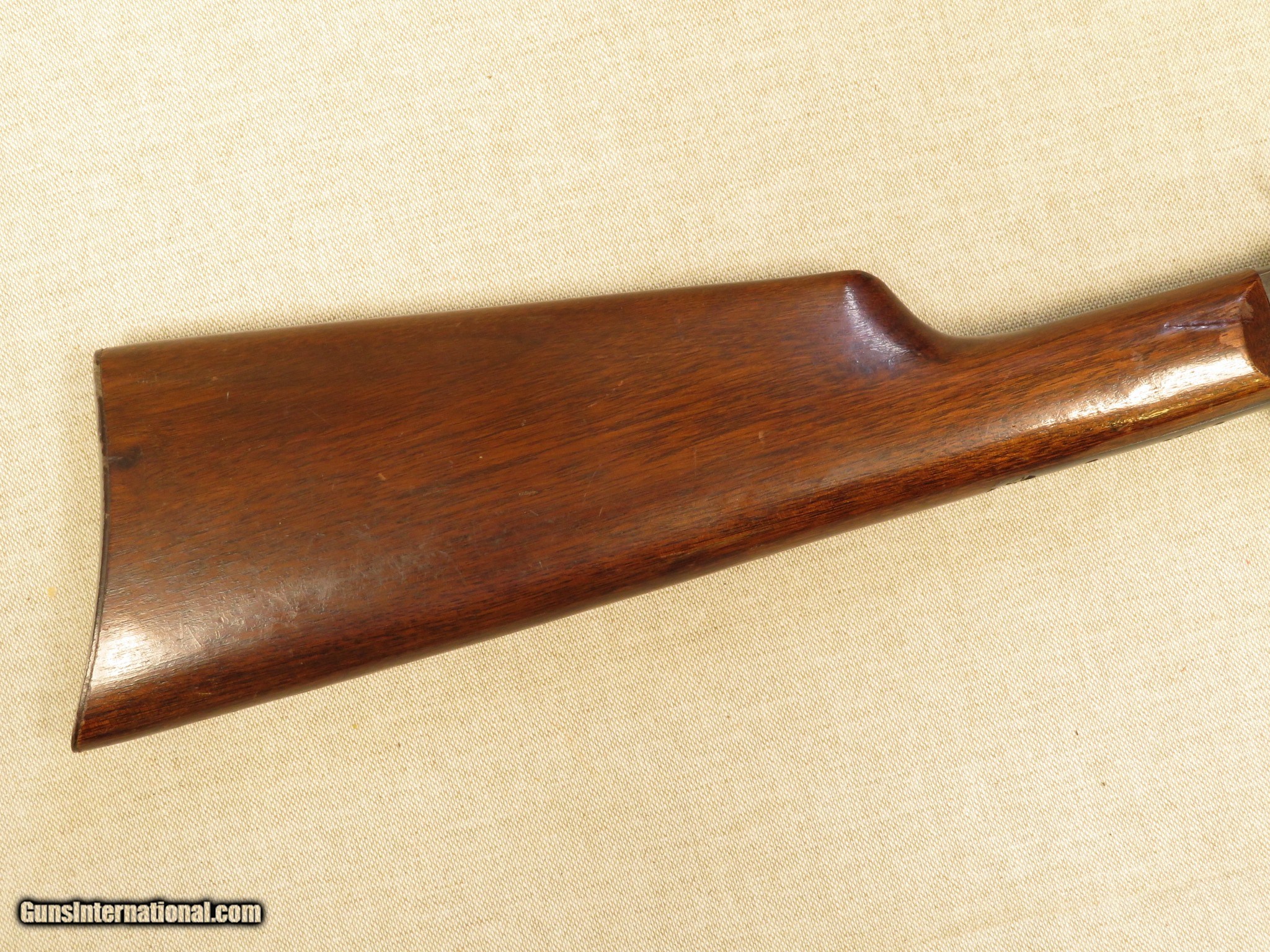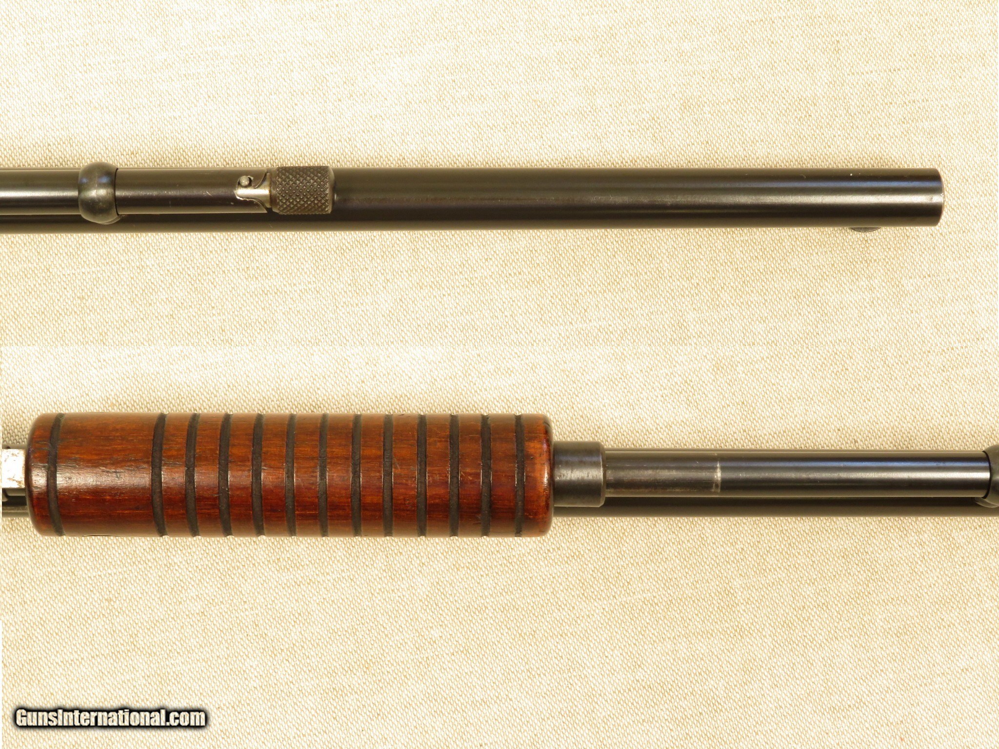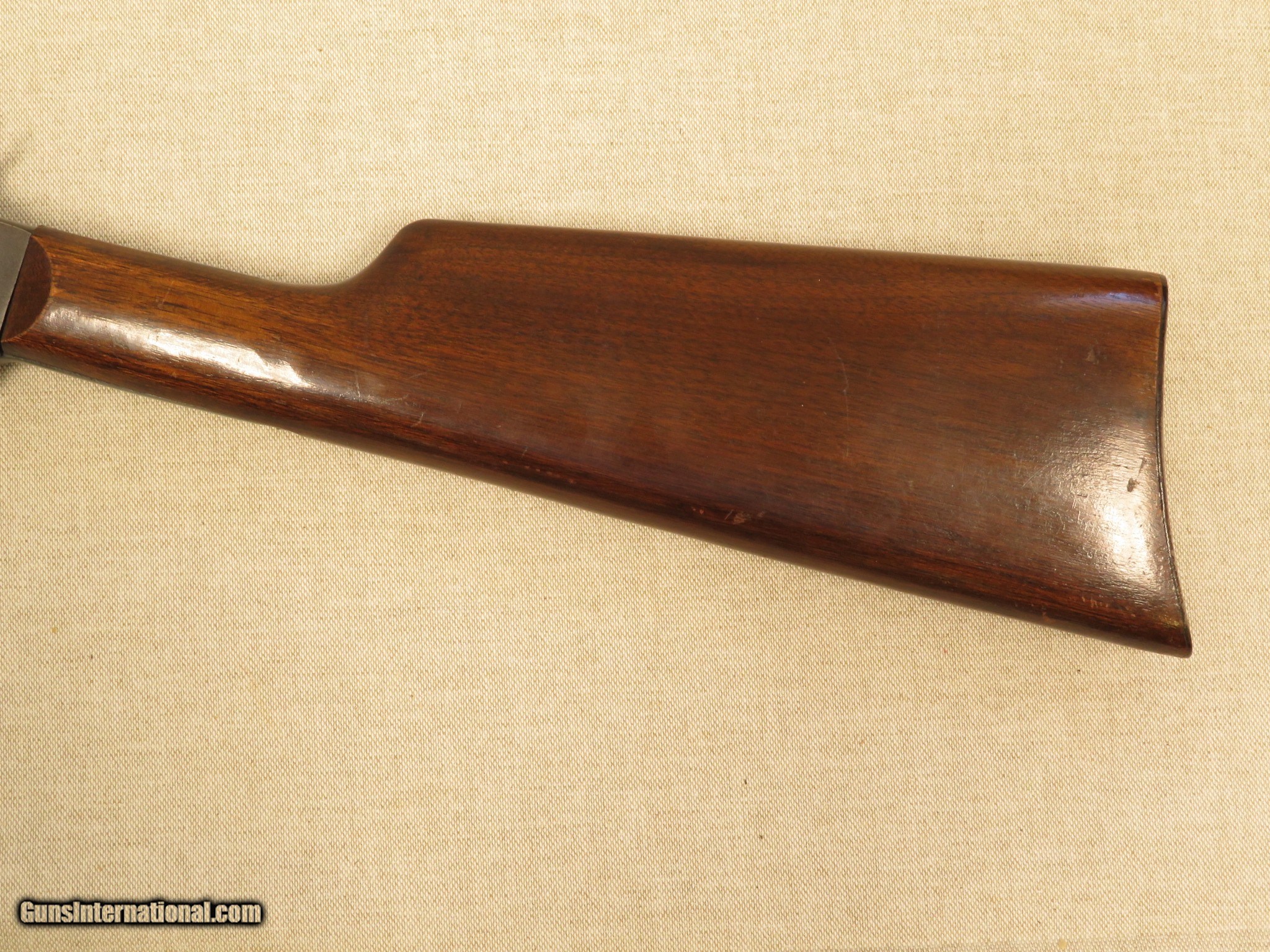 Description: Stevens No. 70 "Visible Loading Repeater" Slide Action Rifle fitted with a 22 inch barrel, exposed hammer, walnut straight grip stock, grooved walnut slide handle, open sights, is tube magazine fed, and chambered in .22 LR. The rifle is in excellent original condition, retaining 95% blue on the barrel, 80% blue on the magazine tube (most loss due to cycling the action), 30% on the frame/lower tang (most loss due to flaking), and 90% on the butt-plate. The slide handle (forearm) retains most all of its original finish, with a few very minor handling marks, and the stock retains 98% of its original finish, with assorted handling marks/dings/dents. The bore is bright, with sharp rifling, and the action is tight and functions perfectly. PRICE: $650 We are Antique & Modern Firearms in Lexington, KY, dealer of fine firearms since 1974. PH. 859-276-1419 We Buy, Sell and Trade Firearms & Knives. Have a Individual Firearm, Firearms Collection, or Firearms Estate to sell, let us know, we can buy or consignment sell it for you. NOTE: No additional fee for a Credit Card payment. SOLD Curio/Relic: Yes Manufacturer: Stevens Model: Visible Loader Caliber Info: .22 LR |