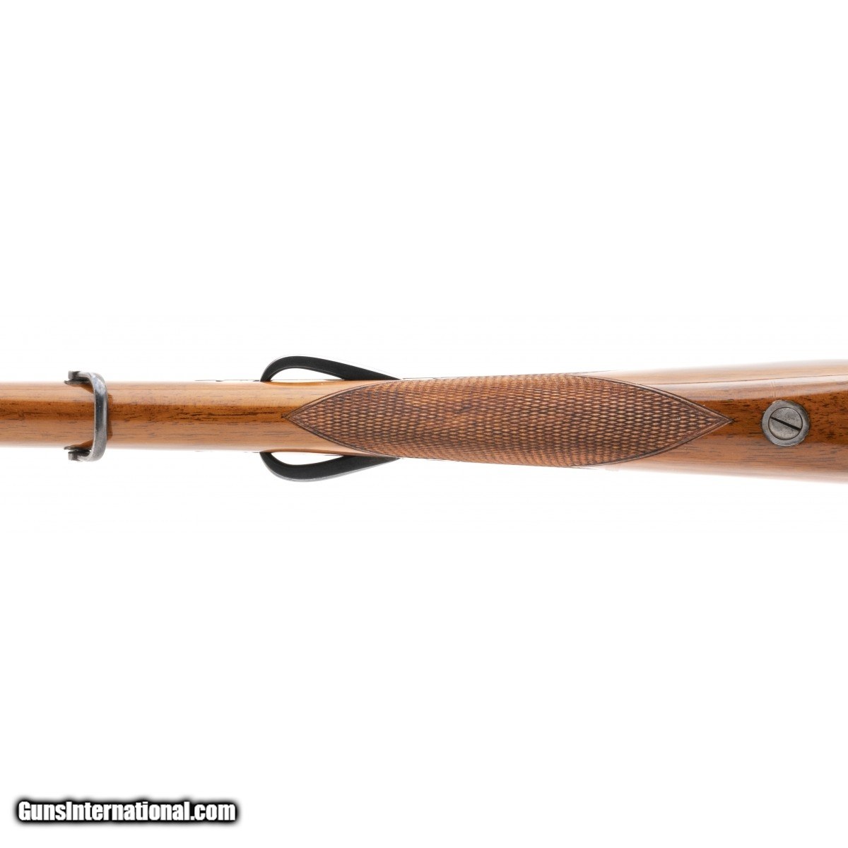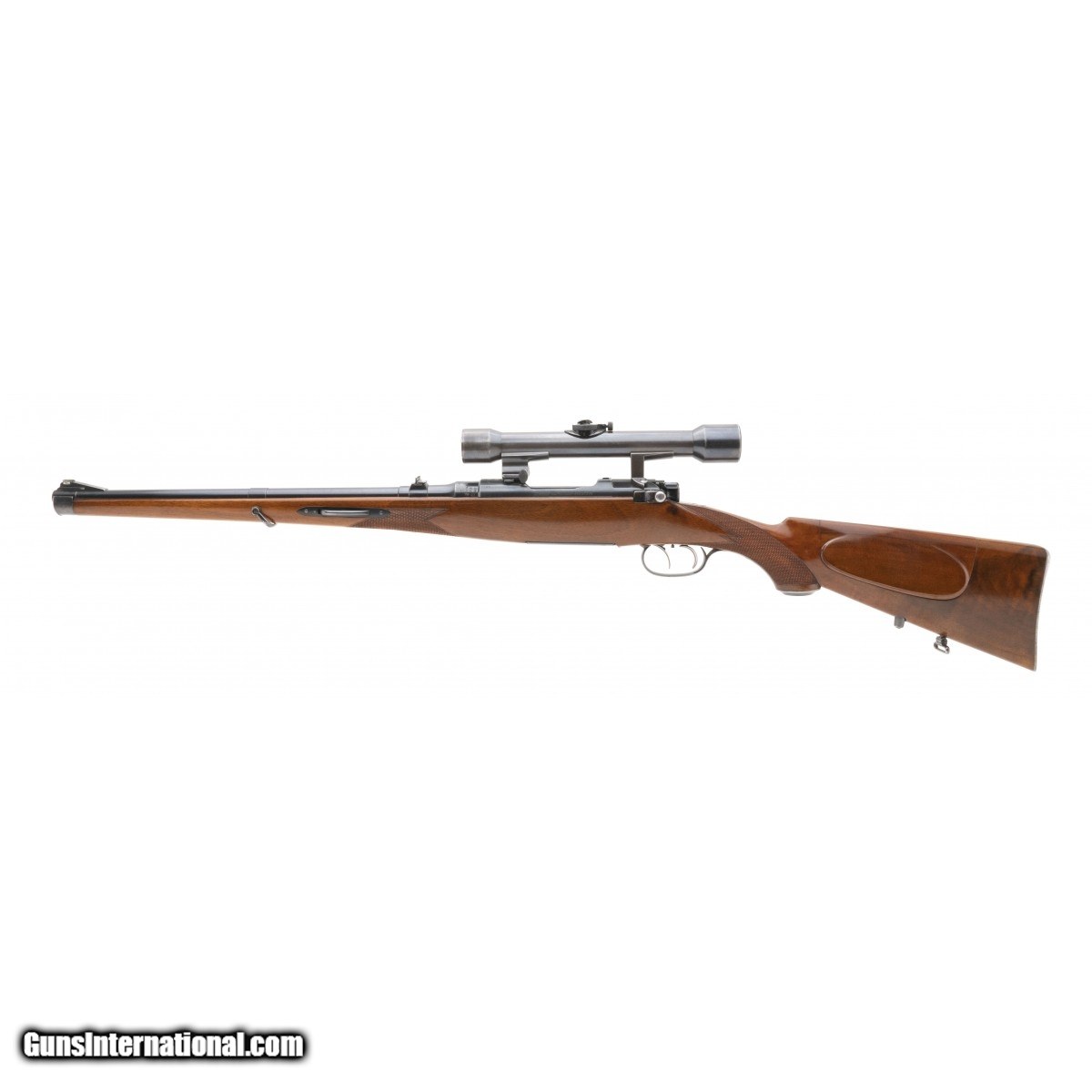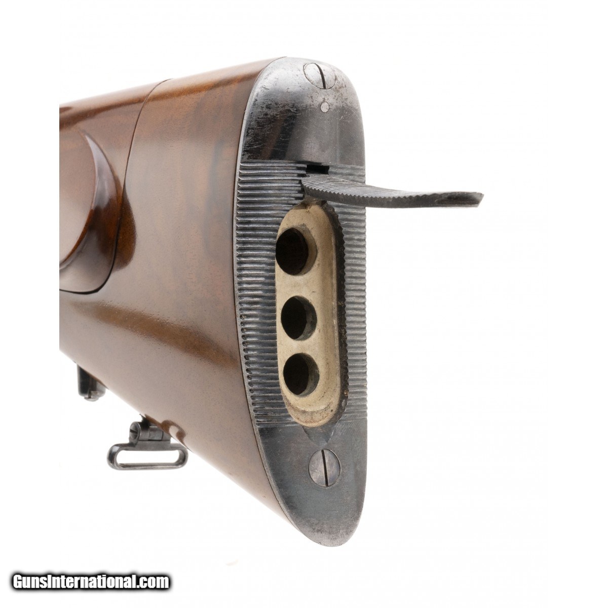 Description: " This superb full stocked Steyr Mannlicher Schoenauer hunting carbine has several unusual features. The overall length is approximately 38.75 inch. The 18 inch barrel has an excellent bore with bright, strong rifling. There is a ramped blade front sight and two leaf rear sight with the second leaf marked 300. The gun has approximately 98% blue with light high point wear. The chamber has German (crown over B, U, G and N) and Austrian eagle proofs. In addition, the chamber area is marked Stm.G. over 10 gr. and 6.4mm over 53 1/2 over 1/27 (probably the date of manufacture). The top of the receiver is marked in an arc MADE IN AUSTRIA over Patent over Mannlicher and the left side is marked (OESTERR/ WAFFENFABR/ -GES/ STEYR). The serial number, 16392, is on the barrel. The stock, numbered 36111, is excellent. It is sharply checkered at the wrist and forearm, has a metal grip cap and serrated metal buttplate. It also features an adjustable comb that pops up at the push of a button for correct sight alignment when using the installed telescopic sight. Another rarely seen feature is the presence of left and right tree braces that are pulled out for use against a tree or post. Finally, the trap under the buttplate provides storage for three additional cartridges. The quick detach Zielvier scope is by Carl Seise Jena. It is retailer marked in script Joh. Springer Erben Wein. The optics are very good with a little cloudiness. The quick detach mounts are see through so that iron sights can be used with the scope mounted. The action, including the double set trigger mechanism, functions correctly. If you collect fine European hinting rifles, this superb Steyr Mannlicher carbine in a great caliber and with a combination of great features is ready for the finest collection. SOLD |
