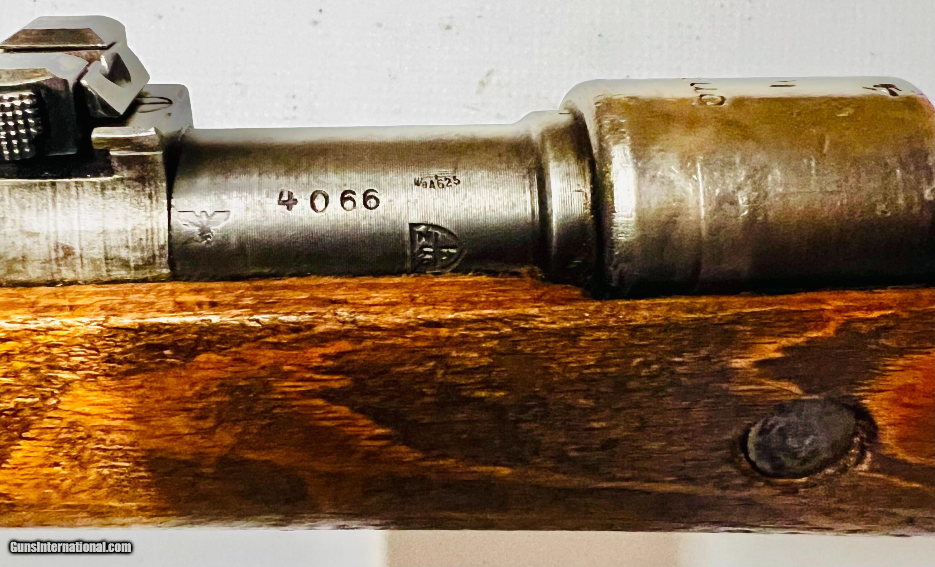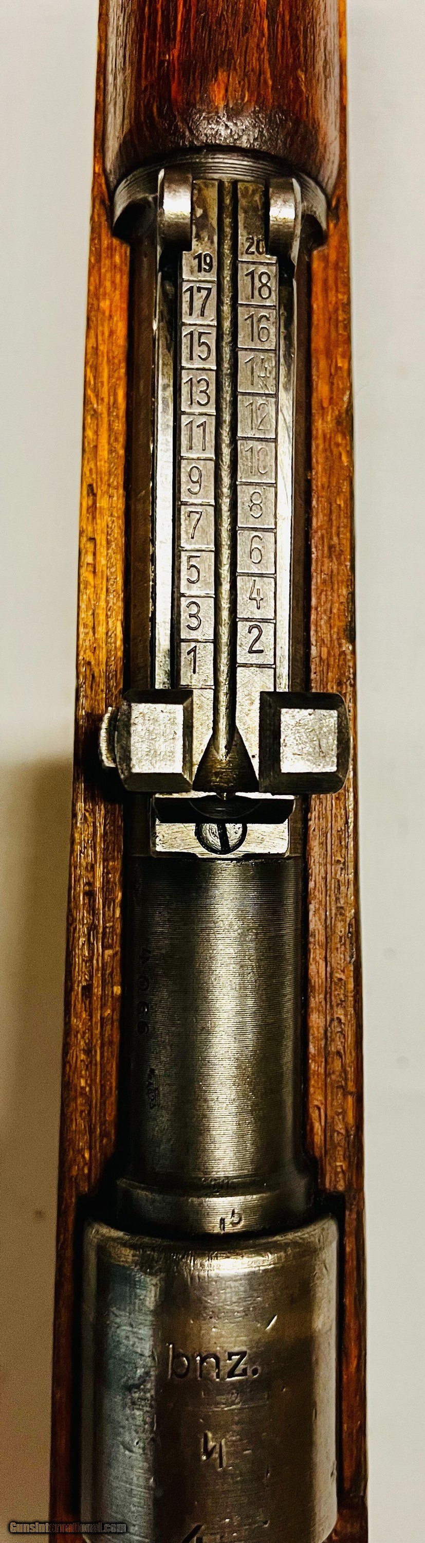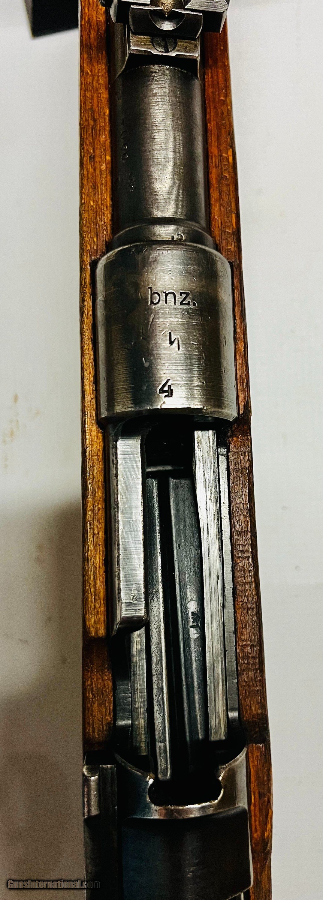 Description: Description: For sale: Wartime Steyr-produced Mauser Karabiner 98k (K98) chambered in 8×57mm Mauser. Receiver marked BNZ, dated 1944, serial number 4066. Barrel measures approximately 23½ inches. Receiver bears a single rune marking associated with SS acceptance — presented strictly as a historical collectible from WWII. This example shows typical period wear; see photos for full condition. Ideal addition for a serious military arms collector. Details / Specs: