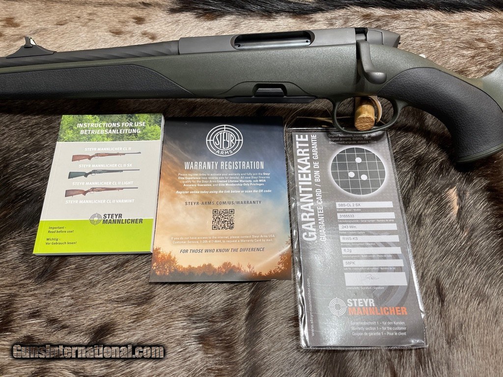 SOLD Rifle Caliber: .243 Winchester Manufacturer: Steyr Mannlicher of Austria Model: CL II SX Left Hand Serial Number: 3165533 Barrel Length: 22 Condition: New |