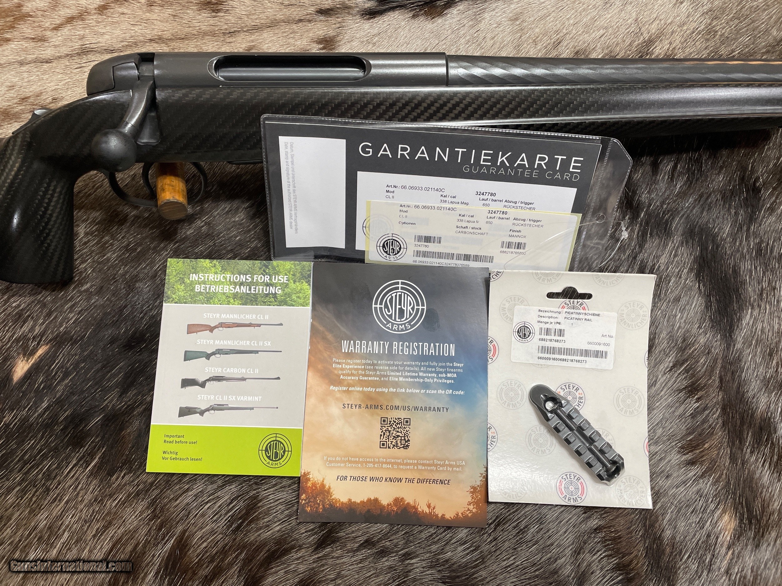 Description: NEW, RARE STEYR ARMS CARBON CLII HALF STOCK RIFLE IN 338 LAPUA MAGNUM WITH UPGRADED SM12 TRIGGER GROUP - LAYAWAY AVAILABLE. THIS IS ONE OF ONLY TWO CARBON 338 LAPUA RIFLES IMPORTED INTO THE U.S. AT THIS TIME. FREE AFRICAN SAFARI WITH KUCHE SAFARIS (: KUCHE.CO.ZA) INCLUDED WITH THIS RIFLE! SAFARI IS FOR 1-HUNTER / 5-DAYS / 3-ANIMALS (IMPALA, BLESBUCK, WARTHOG). SAFARI IS CUSTOMIZABLE WITH ADDITIONAL DAYS AND ANIMALS AVAILABLE. THE CERTIFICATE IS GOOD FOR 3-YEARS FROM DATE OF PURCHASE AND WILL BE EMAILED TO YOU. NOTE: THE SAFARI IS FREE AND DOES NOT ADD ANY COST TO THE RIFLE. BUY A SCOPE AND RINGS/BASES FROM JD OUTFITTERS AND RECEIVE FREE MOUNTING. Features Of This BEAUTIFUL CARBON STEYR Rifle Include:
