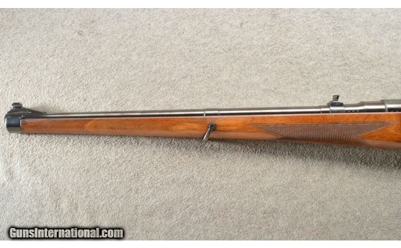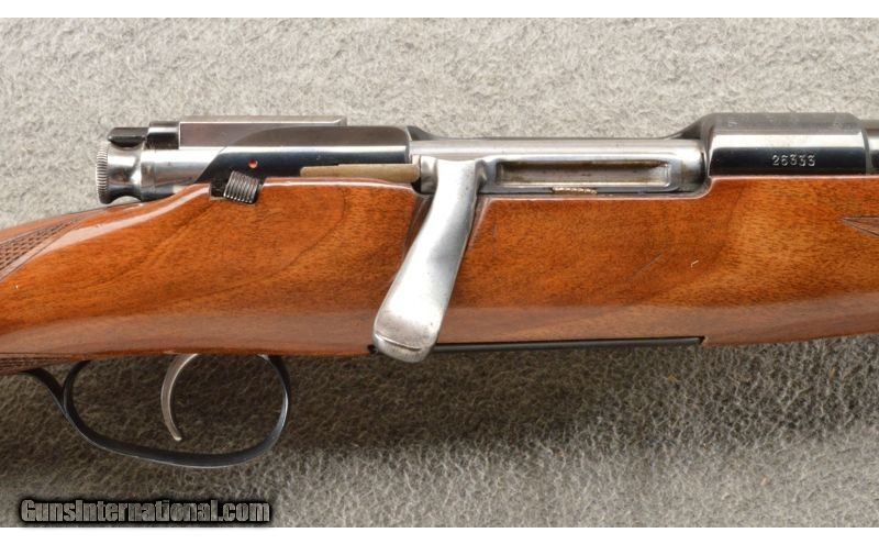 Description: Ramped blade front and flip up adjustable rear notch sights, standard proofs and "59" date stamp on the barrel and receiver, standard maker and model markings on the ring, turned down bolt handle, box magazine with Stoeger marking. Checkered Mannlicher style full length pistol grip stock with sling swivels, large dished cheek piece, and serrated synthetic butt plate. .30-06 Springfield SOLD Chambers: Bolt action repeater. Metal Condition: Excellent. Wood Condition: Very nice with a couple of tiny dings and dents. Bore Condition: Bright and shiny. Barrels: 20 1/2 inch blue with sights. Triggers: Single silver color trigger. Stock Dimensions: 13 1/2 inch LOP. Fore End: Checkered Mannlicher style with a steel cap and sling mount. Butt Pad: Black butt plate. Weight: 7 Lbs. 4 Oz. Sights: Ramped blade front and flip up adjustable rear notch sights. Item Location: Owatonna, MN |
