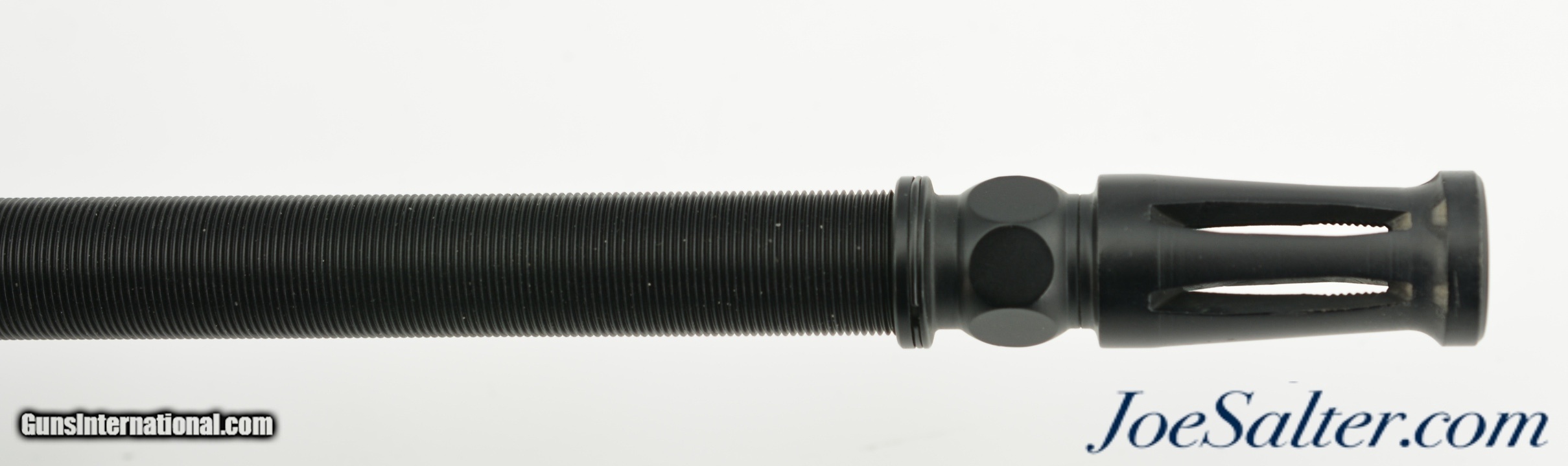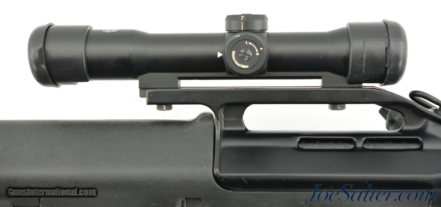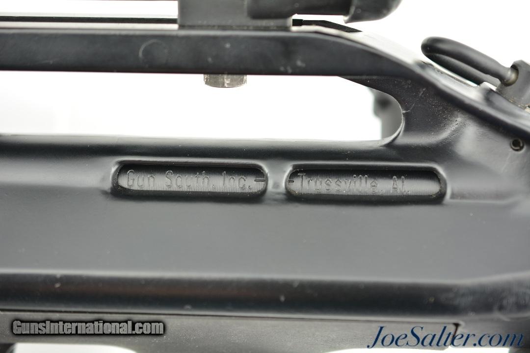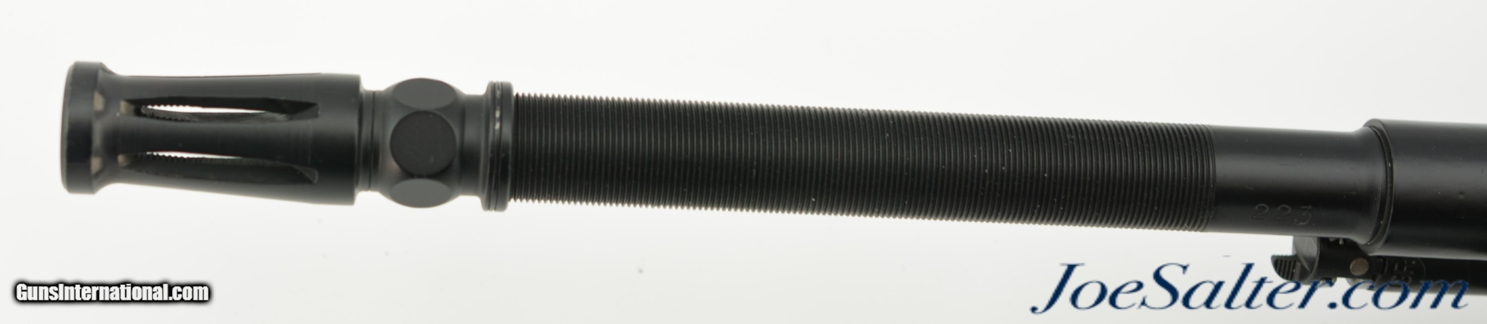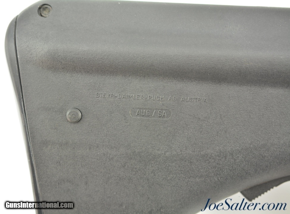 Description: Serial #E1208, .223 Rem. (5.56mm NATO), 20" barrel with an excellent, bright bore. This is a Gun South-imported rifle with mixed numbers on the barrel and bolt (905SA687 and 907SA519 respectively). The receiver has an "SDO" date code (May, 1990), the bolt has "NDO" (March, 1990), and the barrel has "ATT" (December, 1988). The rifle retains retains practically all of the original black anodized finish on the metal with only some very minor handling marks on the rare black "Police" stock and folding foregrip. The cleaning kit is still present inside the buttstock. The rifle has the Special Receiver with optic rail and has a "WEST GERMANY"-marked, Hensoldt 4x scope with clear optics and circle with triangle reticle. A single 30 rd. magazine is included. This is a splendid pre-’94 AUG, with the rare Special Receiver, and desirable black stock set. It would make a great addition to any collection. FFL SOLD |
