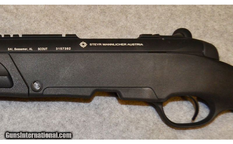 Description: This is the Steyr Scout bolt action rifle chambered in .308 Win. It features a matte black finish, black synthetic stock with integral folding bipod, forward mounted scope rail, and 20-inch fluted barrel. It has a detachable box magazine with an extra being held in reserve in the buttstock. Includes the box, 2 mags, and manual. .308 Winchester SOLD Chambers: Bolt action. Metal Condition: As new in the box. Wood Condition: As new in the box. Barrels: 20" threaded and fluted barrel. Triggers: Single trigger. Butt Pad: Black rubber. Sights: Picatinny rail. Item Location: Acworth, GA |