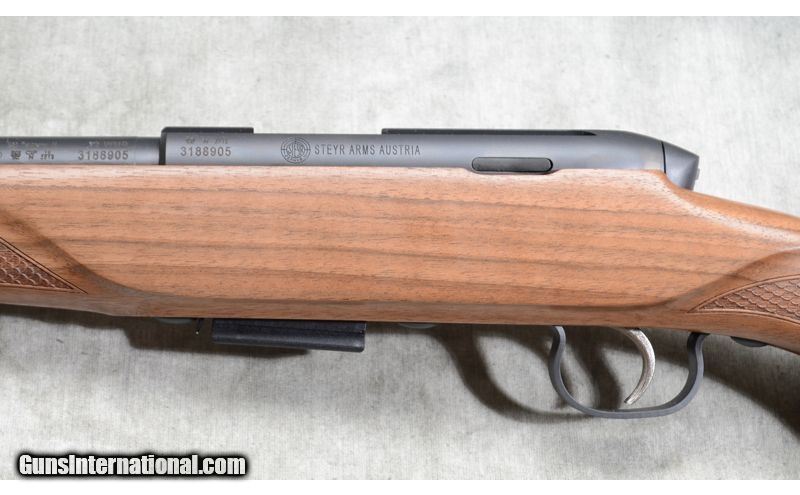 Description: This like new in the box Steyr features European walnut stock with pistol grip and cheek piece, barrel with threaded muzzle and muzzle cap, Schnabel tip, flat bolt and grooved for scope. .22 MAG SOLD Chambers: 5 round detachable magazine. Metal Condition: Like new. Wood Condition: Like new. Barrels: 20 inch, blue, with no sights. Triggers: Factory grooved trigger. Stock Dimensions: 14 - 1/2 Inch LOP. Fore End: Thin pattern with Schnabel. Butt Pad: Soft rubber pad. Sights: Grooved for your choice of scope. Item Location: Rogers |