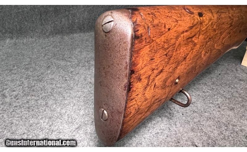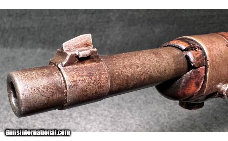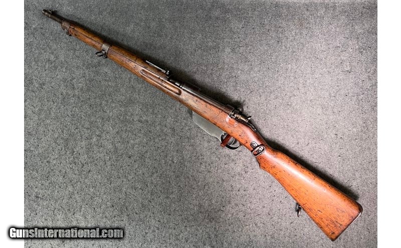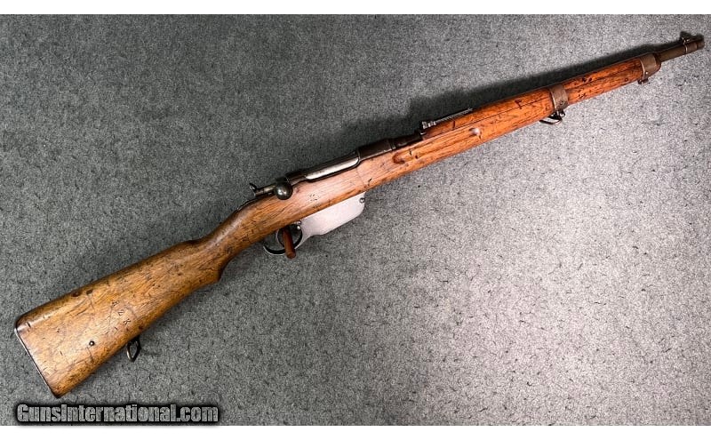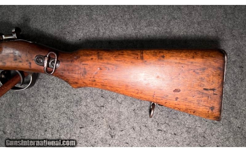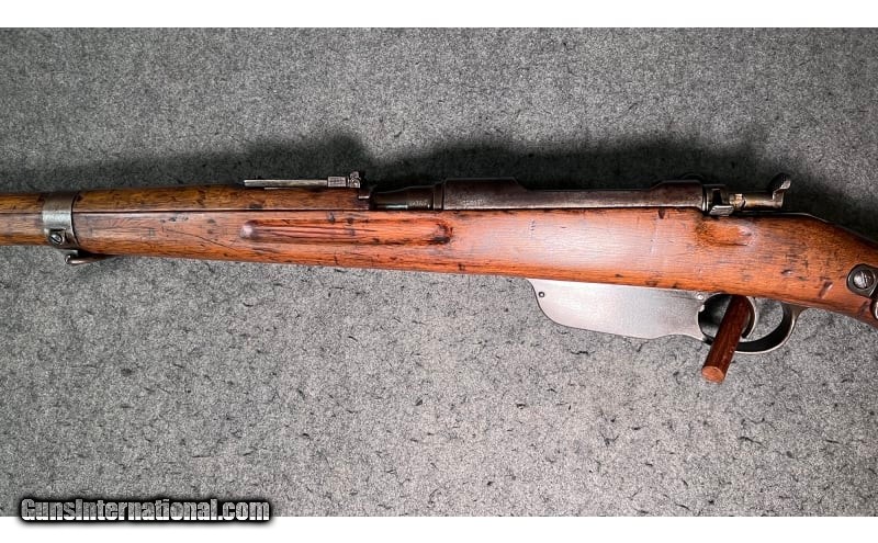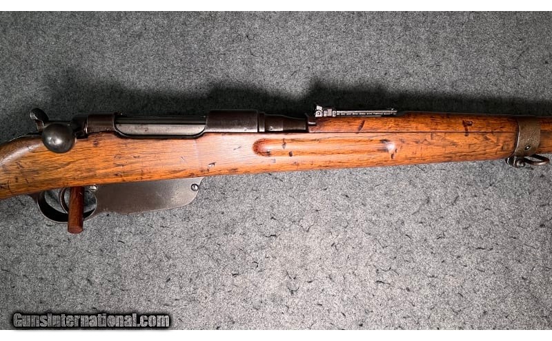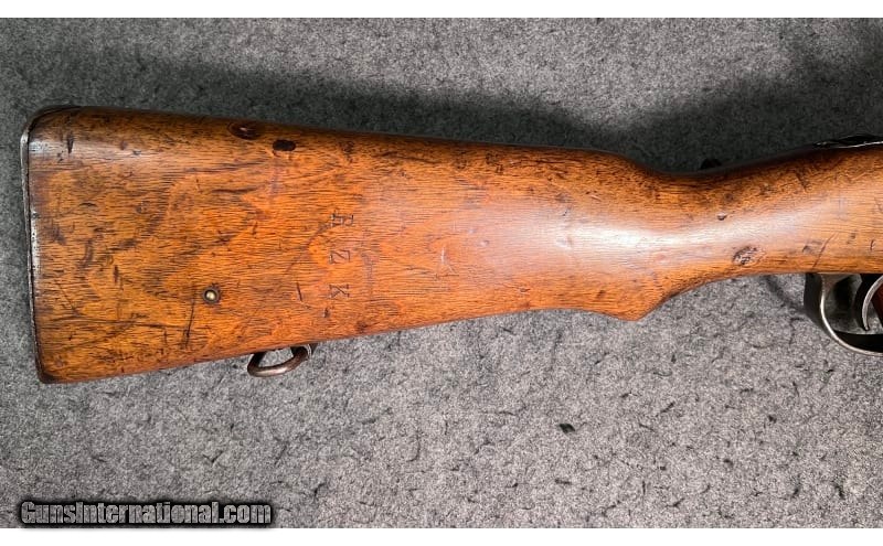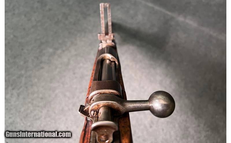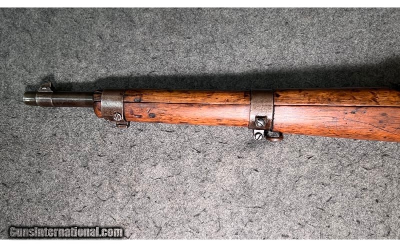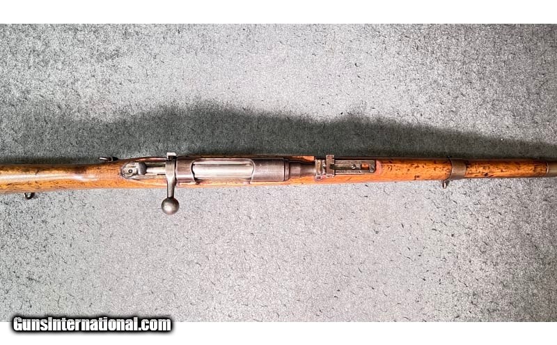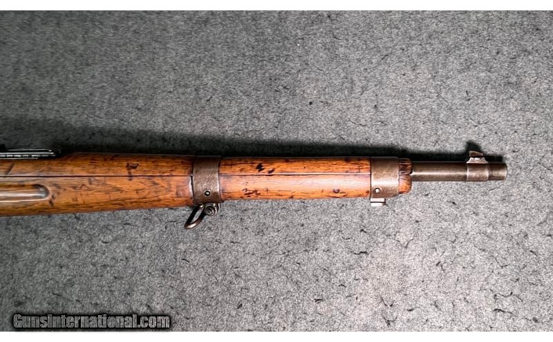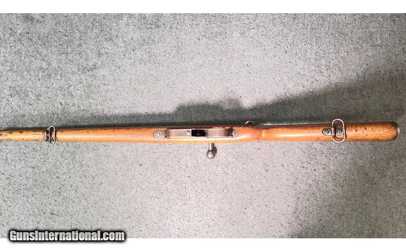 Description: This WW I era bolt action rifle is a Steyr M.95 with no marked caliber. The likely caliber is either 8X56R or 8X50R. It has a blade front sight, 2200 meter ladder rear sight. 'Steyr / M.95' marked receiver ring. The finish shows significant handling marks and storage wear. The receiver and barrel are both marked with s/n 3236F. This rifle is unusual in employing a straight-pull bolt action, as opposed to the more common rotating bolt-handle of other rifles. It combines a two lug rotating bolt head, similar in construction to that found on a Mauser rifle with a pair of helical grooves cut in the bolt body to turn the back and forth movement of the bolt handle and body into the rotational movement of the bolt head. The extractor performs both the usual function, and also has a tail attached which interfaces with slots on the cam surfaces of the bolt head to prevent the bolt head from rotating as a result of the striker's spring pressure once it has been unlocked. The metal has a great patina with no observable rust spots. The finish on the wood of this firearm shows numerous dings and marks throughout. None SOLD Metal Condition: Great patina with no observable rust spots Wood Condition: Numerous dings and marks throughout Barrels: 19½" barrel with bayonet mount Stock Dimensions: 39½" overall length Butt Pad: Steel butt plate Weight: 6 LB 15 OZ Sights: Ladder rear sight Item Location: Wichita, KS |