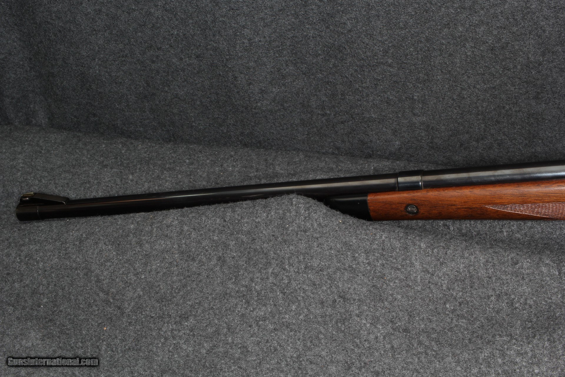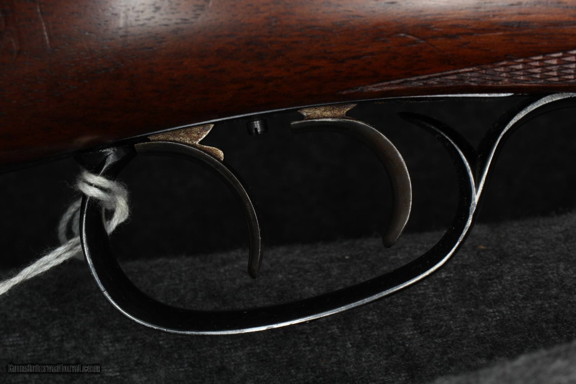 Description: 30-06, serial number 50XX. 24" barrel. Classic sporter configuration. Nicely figured walnut, stock cut and recoil pad added. 12 1/4" LOP to wood, 13 1/4" LOP to pad. Wood show minor marring/handling wear. Front and back sling swivel holes filled. Metal retains 95% original blue. Action shows 25% scroll engraving with upgraded trigger guard and floorplate. Trigger guard shows medium to high relief Roe deer, floorplate shows high relief European stag, nicely executed. Bore is excellent. Early Leupold scope base added with Weaver K3 scope. Scope is delaminating and lenses are yellowing. Set trigger is functioning correctly. Trigger safety works with double set trigger. Wing safety works, will not slear scope. 1951 proofed. More photos on request. Please add $45.00 for shipping and insurance. SOLD Curio/Relic: Yes Rifle Caliber: .30-06 Springfield |