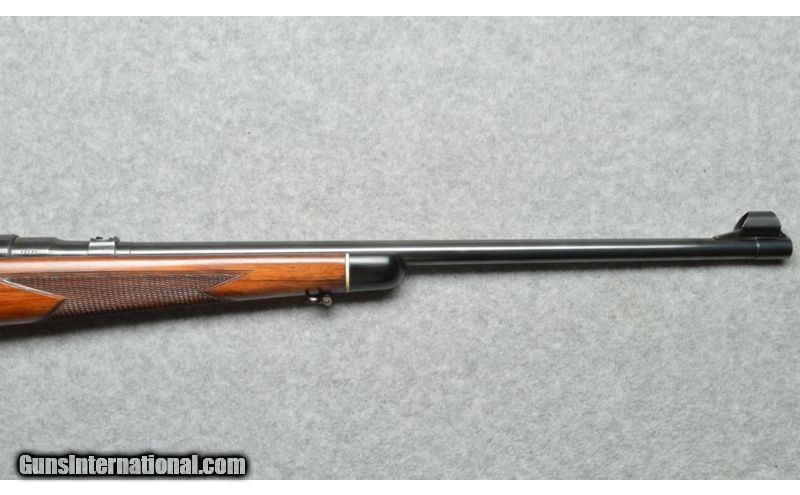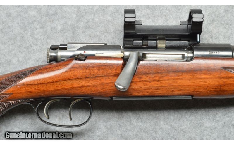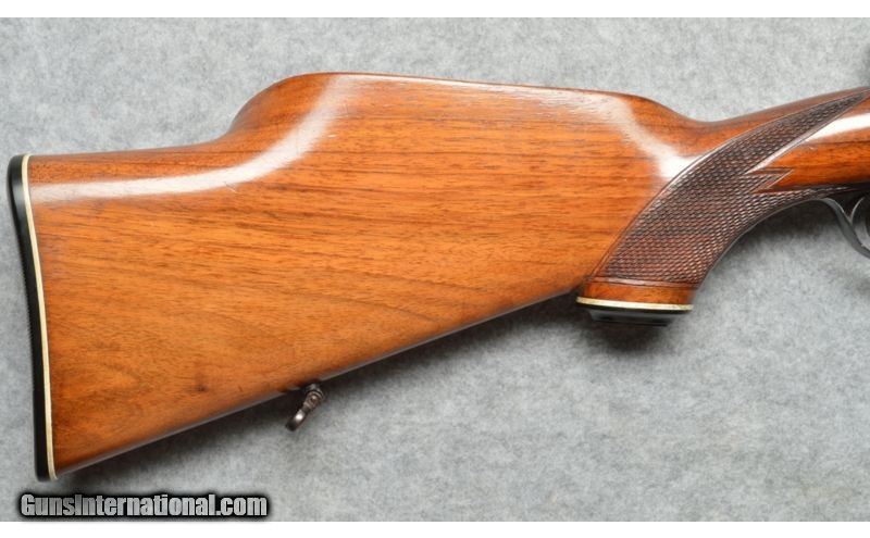 Description: SOLD Curio/Relic: Yes Manufacturer: 1956 to 1961. Caliber Info: .30-06 Springfield Chambers: Bolt action with four round internal magazine. Metal Condition: High gloss blued barrel and receiver, very good condition. Wood Condition: Checkered pistol grip, Monte Carlo stock, very good condition. Bore Condition: Bright and shiny clean bore. Barrels: 22 inch round blue barrel. Triggers: Double set trigger. Stock: Checkered pistol grip, Monte Carlo, wood stock. Stock Dimensions: 14 inch LOP. Fore End: Checkered fore-end matches the checkered pistol grip, Monte Carlo, wood stock. Butt Pad: Synthetic butt pad. Weight: 7.7 pounds. Sights: Blade front sight, rear sight removed. Pachmayr tilt scope mount. Item Location: Berlin, MA |