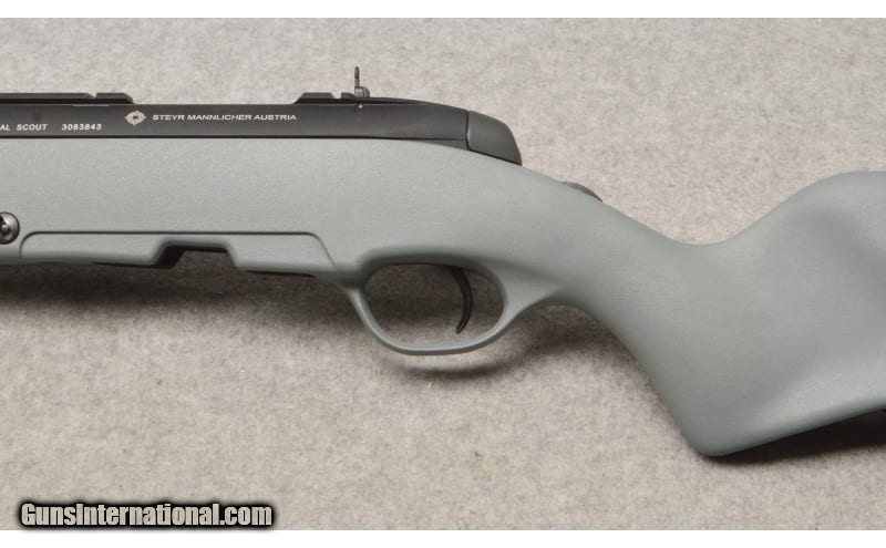 Description: This Steyr-Mannlicher Scout Model bolt action rifle in .308 Winchester is in excellent condition. The black matte receiver frame and barrel are excellent. The black matte fluted 19" barrel is excellent with sharp clear rifling in its bore. The factory trigger is smooth and light with a crisp release. The grey polymer stock with black grip inserts, extra mag storage and folding bipod legs is in excellent condition. This Steyr rifle almost looks unused. This Steyr-Mannlicher bolt action rifle comes with a sling and five(5) total magazines but does not have a box or any other accessories. .308 Winchester SOLD Metal Condition: Excellent Bore Condition: Excellent Barrels: Black Matte Fluted 19 Triggers: Factory Black Curved Smooth Stock Dimensions: LOP 13 1/4" Height 7 1/4" Length 39 1/4 Fore End: Matching Grey Polymer with Black Grip Inserts Butt Pad: Factory Black 1 3/4" Rubber Pad Weight: 7 Lbs 0 Oz. Sights: Flip-Up Front Post with Rear Flip-Up Peep Item Location: West Chester, OH |