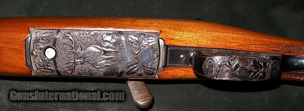 Description: STEYR RARE PREMIER GRADE M56 MANNLICHER CARBINE 270 CAL RIFLE, MFG 1957, BEAUTIFUL DEEP CHISEL GAME SCENES OF ELK, PRONGHORN, BEAR WITH OAK LEAVES, 20" BBL, EJECTORS, DBL SET TRIGGERS, DARK HONEY COLORED WALNUT, M/C CHEEKPIECE, LOP 14 1/8, 7LBS 3OZ, 1 FX 1 FOLDING, HOODED RAMP FRONT, AS NEW, APPEARS UNFIRED! SOLD |