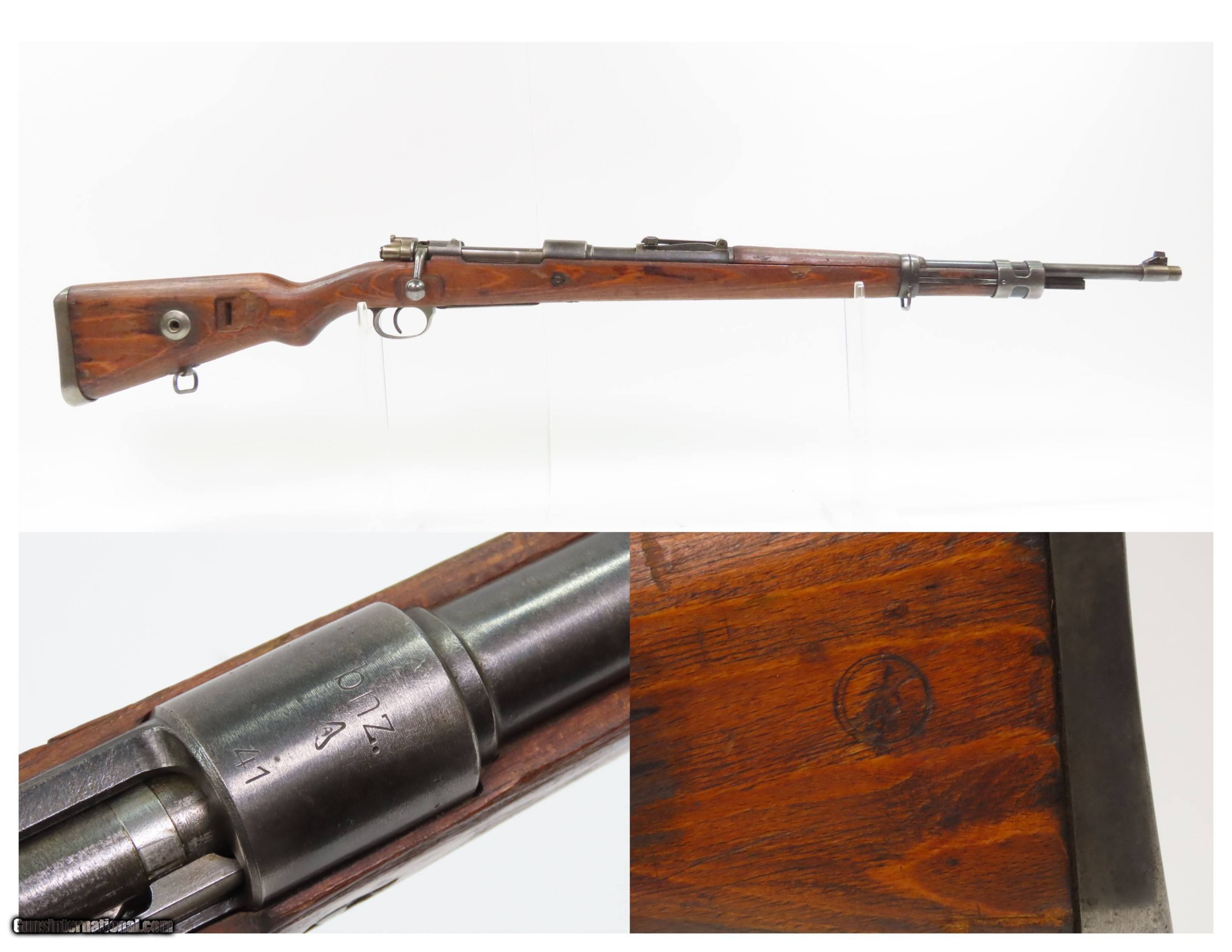 Description: World War II THIRD REICH German STEYR “bnz./41” Code K98 MILITARY Rifle C&R GERMAN OCCUPATION 1941 Third Reich MAUSER Rifle Here we present a C&R Third Reich German Waffenfabrik Steyr “bnz./41” Code K98 Mauser Rifle manufactured in 1941 in Steyr, Austria. The forced Union between Austria and Germany in 1938 provided Hitler's Third Reich with the huge small arms and vehicle plants at Steyr and the heavy weapons factories at Skoda. These two industrial complexes nearly doubled Germany’s available weapons production facilities. Steyr produced nearly 1,000,000 K98k rifles between 1938 and May of 1945 as well as hundreds of thousands of Radom pistols, MP-40's, MG-42's, tank chassis, trucks, and tiger tank turrets. During the war Steyr only used two manufacturing codes, which were “660” and “bnz”. Waffenamt “623” was used for parts made at Steyr and Waffenamt “77” was used for parts made at Radom under Steyr supervision. Steyr was one of only two manufacturers of K98k rifles who put a period after their code on the receivers they made (“bnz.”). This was discontinued mid-1944. While Steyr made K98k's for all three branches of the German military, they were also the sole K98k contractor for the SS. In 1898 the German Army purchased a Mauser design, the Model 98, which incorporated improvements introduced in earlier models. The weapon was originally chambered for the Patrone 88 and officially entered German service as the Gew. 98 on April 5, 1898. This remains by far the most successful of the Mauser designs, helped by the onset of two world wars that demanded vast numbers of rifles. The overall condition is good. The stock shows expected wear and remains solid. Mostly bright bore with good rifling. Robust action. Gray patina throughout the metal components. Serial numbers on the receiver and barrel are obfuscated while other markings remain legible. Collectors’ markings on the triggerguard. Own the original! This firearm is classified as a Curio & Relic. Barrel is 23-3/4 inches. Caliber: 7.92mm Mauser Overall condition as seen in photos. Very Fast. Very Safe. FREE SHIPPING. Will need to be sent to your local FFL or C&R licensee. This firearm is classified as a Curio & Relic. Guaranteed AUTHENTIC & Includes CERTIFICATE OF AUTHENTICITY. ancestryguns $1650 #250454 SOLD Curio/Relic: Yes |