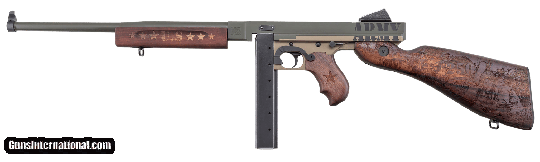 Description: Guns Listing ID: 577043 Thompson TM1C4 Army .45 ACP 30+1 16.5\" OD Green Cerakote Steel Barrel, Coyote Tan/OD Green Cerakote Steel Receiver w/Engraving, Custom Engraved w/Horizontal Foregrip Walnut Wood Stock The commemorative TM1C4 Army rifle is crafted to honor the 250th Anniversary of the founding of the Army on June 14, 1775. It serves as a tribute to the dedication and sacrifice of the many men and women who have served in the Army. The rifle showcases a two-tone finish, the barrel and upper receiver is coated in OD Green Cerakote, while the lower frame is finished in a contrasting Coyote Tan Cerakote. The controls are in a black Oxide. The American Walnut furniture is custom engraved, with artwork containing images throughout the Army‚s history. This is a visual narrative, chronicling the evolution of the Army soldier with figures from the Revolutionary War, through World War I, World War II, Vietnam and into modern times. Both sides feature a distinctive \"250th Anniversary\" banner. The horizontal foregrip is engraved on both sides with \"U.S.\" surrounded by stars. The steel receiver and frame also are adorned with commemorative markings. On the left side \"ARMY\" lettering is CNC engraved on both the upper receiver and lower frame and then black Cerakoted. The right side of the receiver features a \"250 Anniversary Banner\" which is FX Gold Cerakoted. The top of the receiver showcases a design depicting the layout of the Army dress uniform accented with black Cerakote lines FX Gold Cerakote buttons. Manufacturer: THOMPSON/CENTER ARMS Model: TM1C4 ARMY Caliber Info: .45 ACP Condition: new Barrels: 16.5" BARREL Action: SEMI AUTOMATIC Finish: walnut Weight: 11.50 LBS. Price: $1,953.85 Contact Seller |