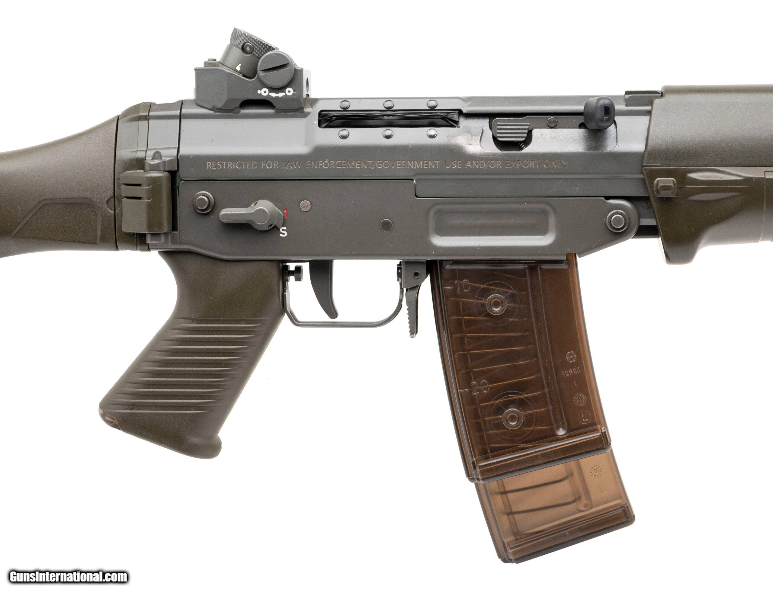 Description: "Serial Number 48263. Made in Switzerland in 1988 with an 18-inch barrel that has a a built-in flash suppressor & a bright bore with strong visible rifling. Features an ambidextrous safety, adjustable diopter rear sight assembly & a side-folding green polymer stock with matching pistol grip & handguard. Overall condition is excellent with only light surface wear at the rear end of the ejection port. A semi-automatic version of one of the finest 20th Century service rifles, this firearm sets a high standard for quality fit & finish. Comes with two translucent polymer magazines. Price: $12,500.00 Contact Seller |