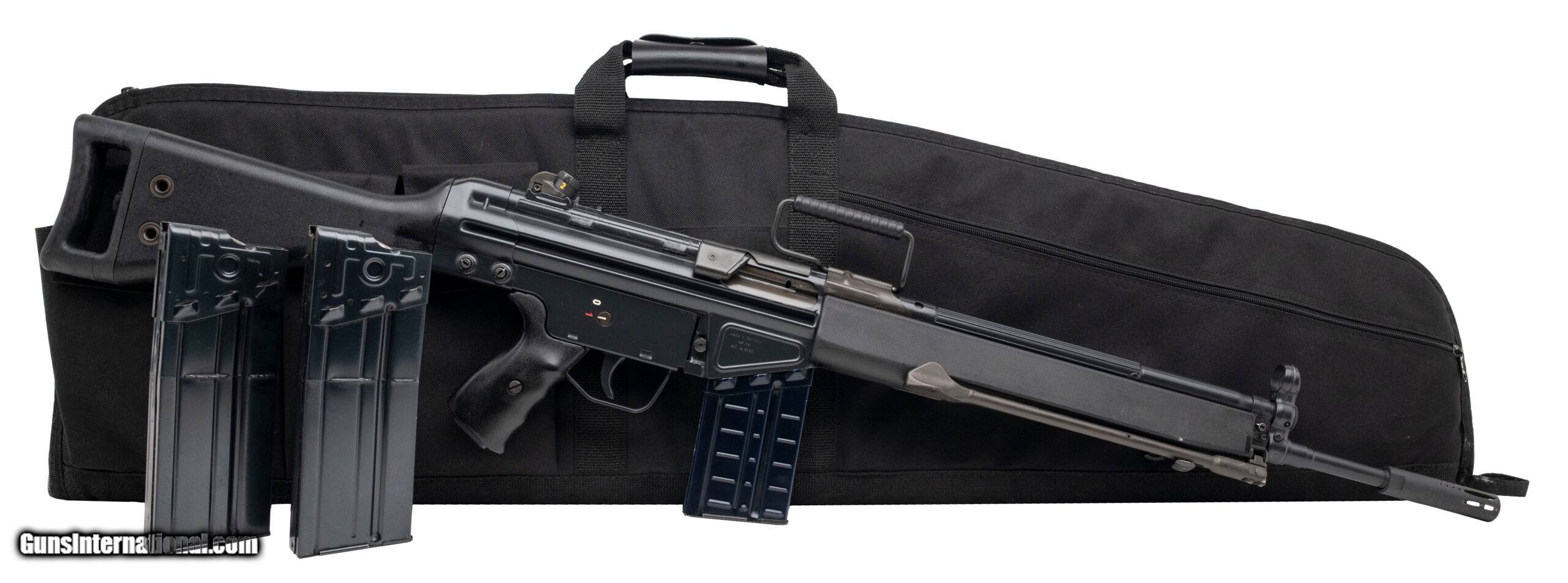 Description: "Serial number A035731. Made in 1981 with an 18-inch barrel that has a bright bore with strong visible rifling. Overall condition is excellent with original factory finish across the metallic parts & synthetic furniture that is likewise in excellent shape. Rifle is equipped with a Fabian Brothers muzzle stabilizer, a shell deflector, a carry handle, a stock extender & bipod. A fine example of the glory days of the pre-ban roller delayed blowback HK sporting rifles. Comes with an April 1984 dated 20-round aluminum G3 factory magazine & 2 unmarked HK factory steel 30-round magazines and a range bag. Price: $5,750.00 Contact Seller |