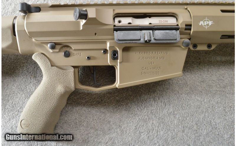 Description: Started in 2014, by Tom and Kathy Wilkins, Alex Pro Firearms strives to offer the best quality product on the market, but at a fair price. With 30 plus years of machining knowledge they focus on quality with great attention to detail.This is a new in the box Alex Pro Firearms 22-250 FDE Target Field in .22-250 Rem. This rifle comes to us straight from the maker in Alexandria MN. Alex Pro Firearms are made from only the best materials and are CNC machined from single billets for strength and light weight. Alex Pro Firearms are high grade firearm at a modest price. SOLD Manufacturer: 2018 Caliber Info: .22-250 Rem. Chambers: Semi-Auto 8+1. Metal Condition: New In Box. Wood Condition: New In Box. Bore Condition: New In Box. Barrels: 24 inch 416 SS 1/14 Twist medium heavy fluted. Triggers: CMC 3.5 LB Single stage flat blade. Stock: MAGPUL PRS in desert sand. Stock Dimensions: 15 1/4 inch LOP (adjustable) and an adjustable comb. Fore End: APF 15.5 inch MLOK Butt Pad: Black rubber butt pad. Weight: 11 Lbs. 6 Oz. Sights: 22 inch top rail. Extras: Comes with the factory box, 8 round mag with 5 round compliance plug (not installed), manual and warrantee card. Item Location: Owatonna, MN |