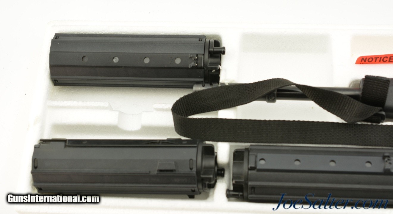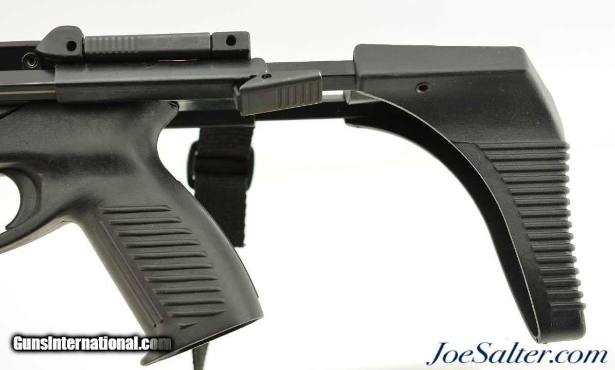 Description: Serial # J000122, 9mm Luger, 16 inch barrel with an excellent bore. This is the Calico Model 951 semi-automatic carbine featuring a collapsible stock, adjustable verticle grip, fixed muzzle break and unique magazines that give it a futuristic / sci-fi look. In excellent condition the metal surfaces retain virtually all, 98-99% of the original blue finish and the composite stock is likewise excellent. It comes in the original box with the manual, one & 100 round magazine, and two & 50 round magazines. Price: $995.00 Contact Seller |