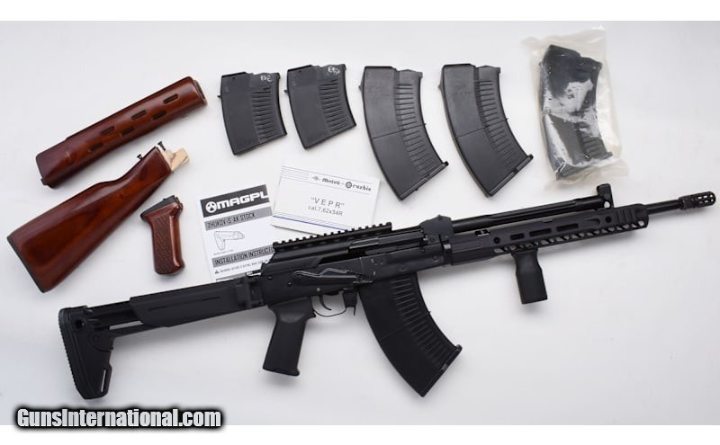 Description: Exceptional pre-owned High Condition Molot-Oruzhi-Russia VEPR chambered in 7.62x54R. Mechanisms are crisp. Bore presents excellent; bright with sharp rifling. Finish is well-preserved. Includes factory box, factory literature, (4) 10 rd magazines, (2) 5 rd magazines, and factory wood furniture kit. 7.62 54R Metal Condition: Matte Black Wood Condition: Magpul Zhukov-S Bore Condition: Bright and Sharp Barrels: 16.5 Triggers: Single Stage Stock Dimensions: LOP 12.75"-14.5 Adjustable Weight: 8 lb - 6 oz Sights: Bladed Front Post / Picatinny Rail Item Location: Buda, TX Price: $2,499.99 Contact Seller |