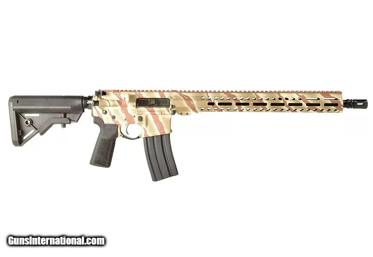 Description: Manufacturer: Son's of Liberty Gun Works - San Antonio, Texas Model: M4-EX03 Rifle SKU: M4-EX03-16-DTS Caliber: 5.56 NATO / .223 Remington Capacity: (3) 30 Round Magazines Barrel: 16" 4150 CrMOV 1:7 MPI HPT Muzzle Device: A2 Birdcage, Threaded 1/2x28 Barrel Extension: QPQ coated M4 Feed Ramp Extension Barrel Finish: QPQ Corrosion Resistant Finish: Desert Tiger Stripe Cerakote Upper Receiver: Mil-Spec 7075-T6 aluminum forgings, Engraved T-Marks, Flat Black Finish Lower Receiver: SOLGW Forged Lower Receiver – Angry Patriot Gas System: Mid-Length Trigger: Liberty Fighting Trigger Receiver Extension: 6 Position Mil-Spec Rail System: Sons of Liberty EXO 3 MLOK Rail Buffer: H Buffer Charging Handle: SOLGW Billet Ambi Stock & Pistol Grip: B5 System Sights: None Weight: 6.6 lbs All items are factory new in box unless otherwise stated. Based on the information available to us, the above specifications describe this item to the best of our knowledge. For further information, please contact or visit the manufacturer's . SOLD |