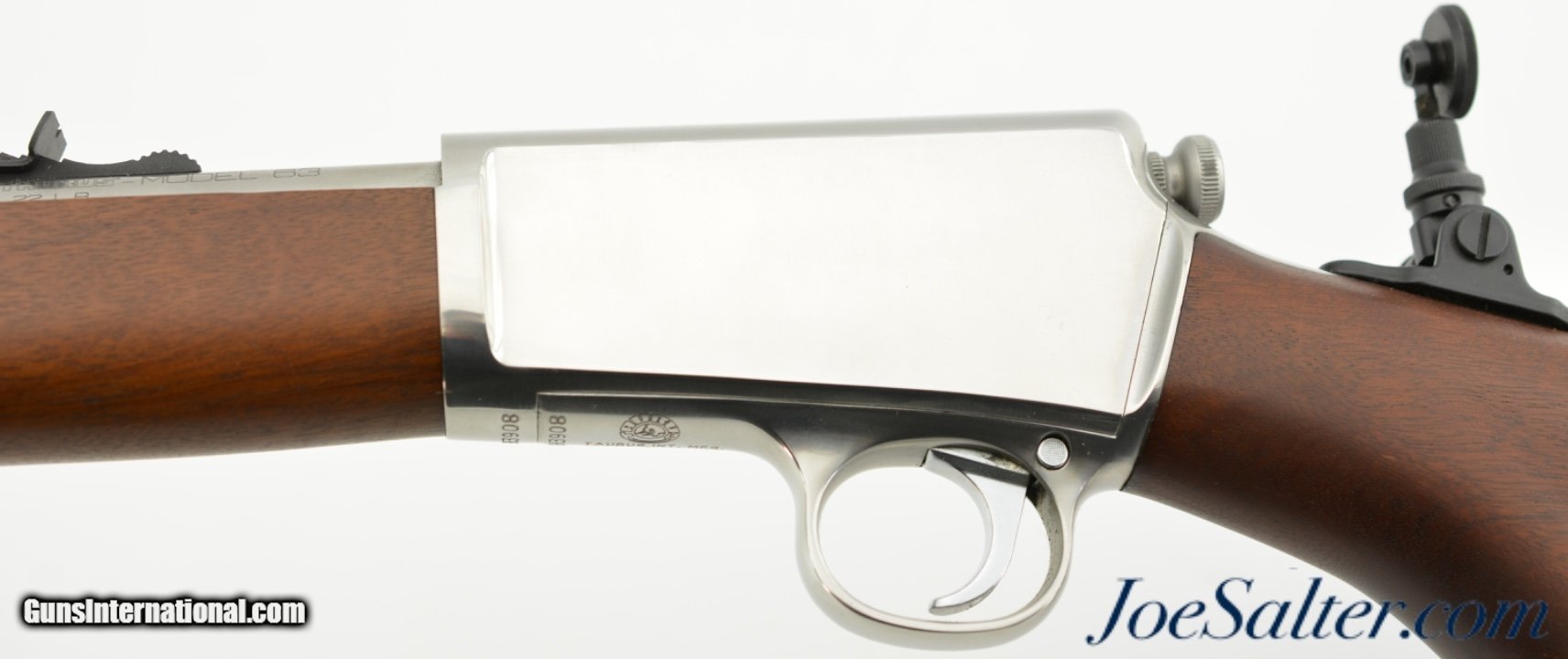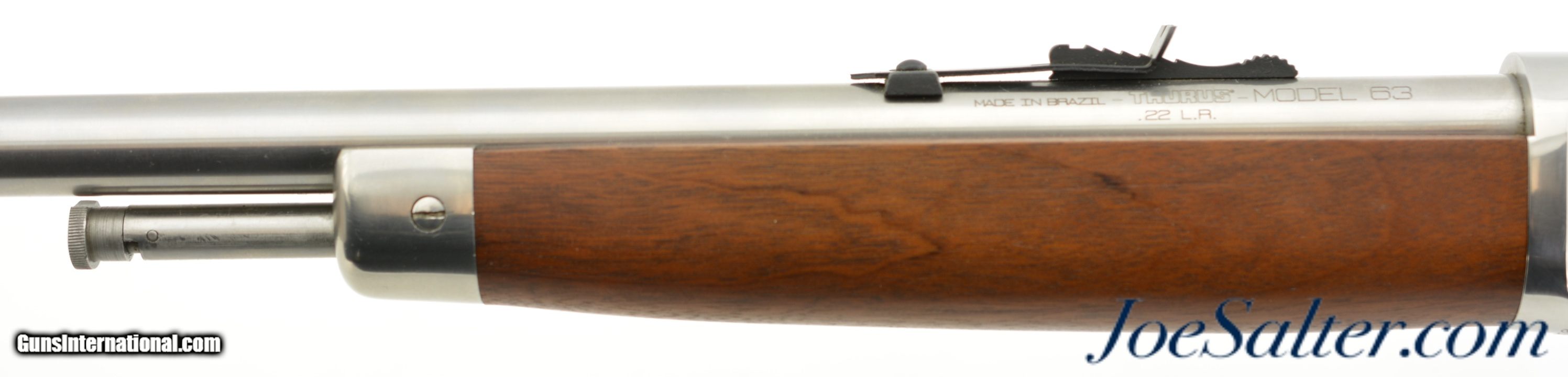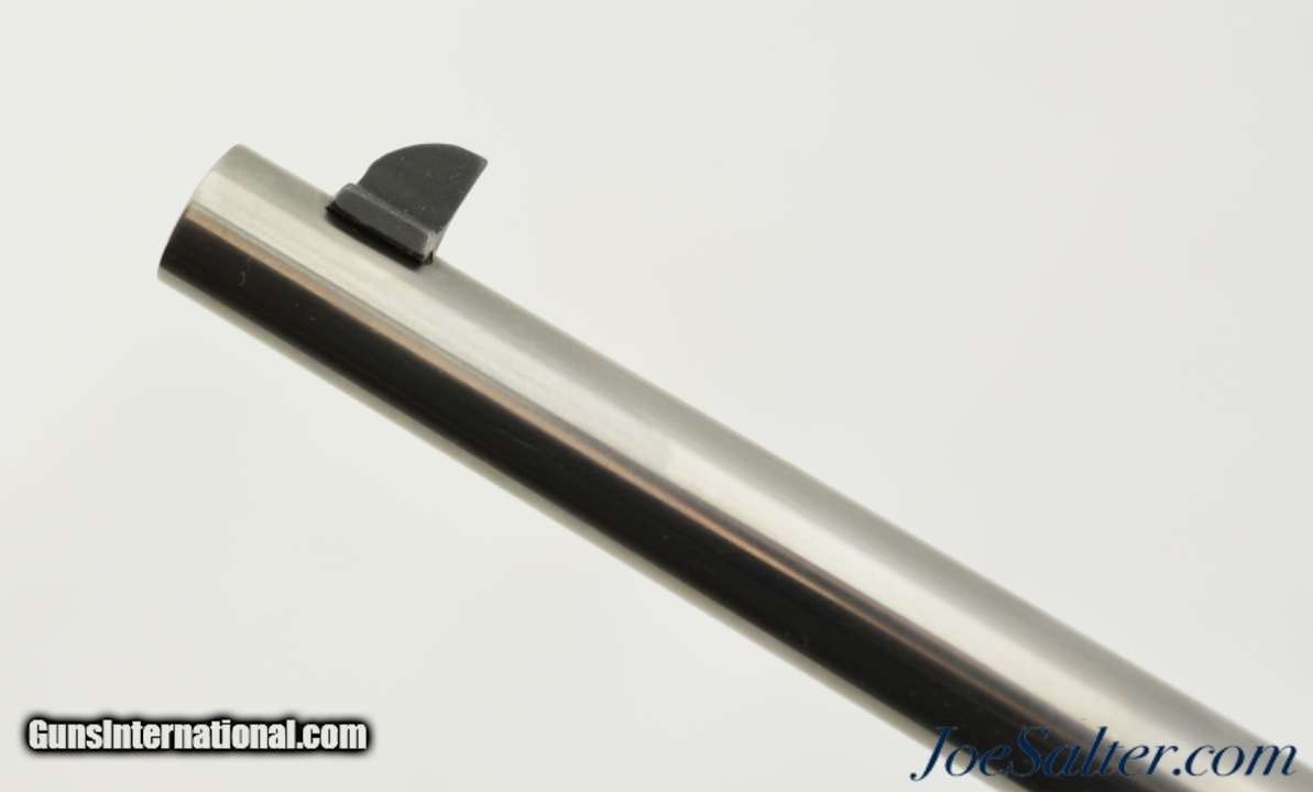 Description: Serial #XH3908, .22 LR, 23 inch barrel with an excellent bore. This is the Taurus Model 63 semi-automatic rifle patterned after the Winchester Model 63. Imported from 2003-2007 this stainless model featured a combination tang peep sight. In excellent, like new condition the metal surfaces retain virtually all, 99% plus original bright stainless. The hardwood stock is likewise excellent. It comes in the original cardboard box numbered to the gun with manual, and paperwork. A great Winchester copy that was built for a short time and getting harder to find. FFL SOLD |