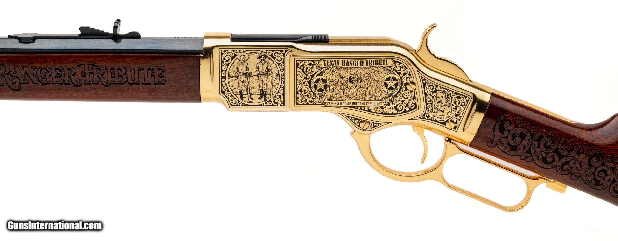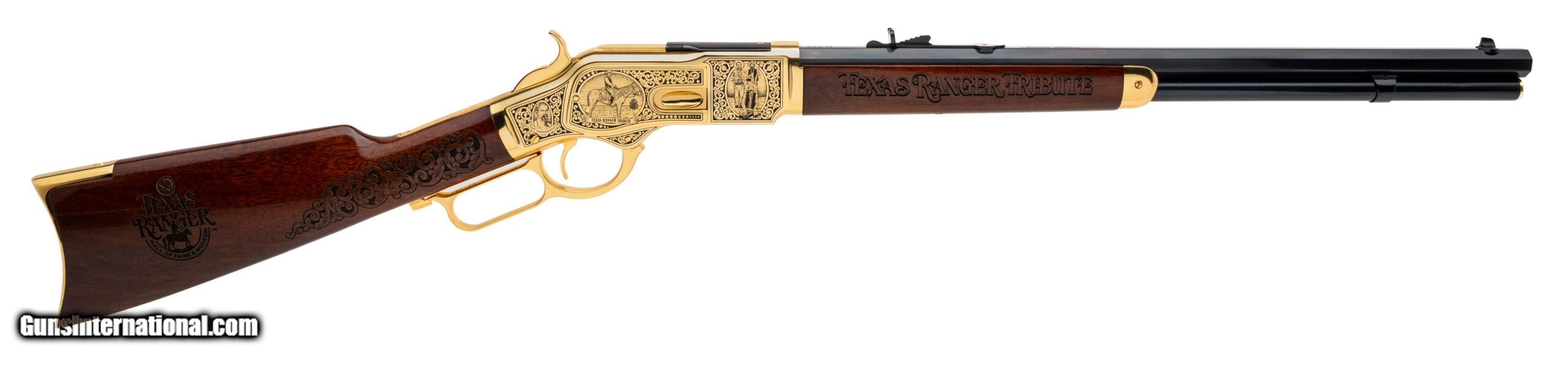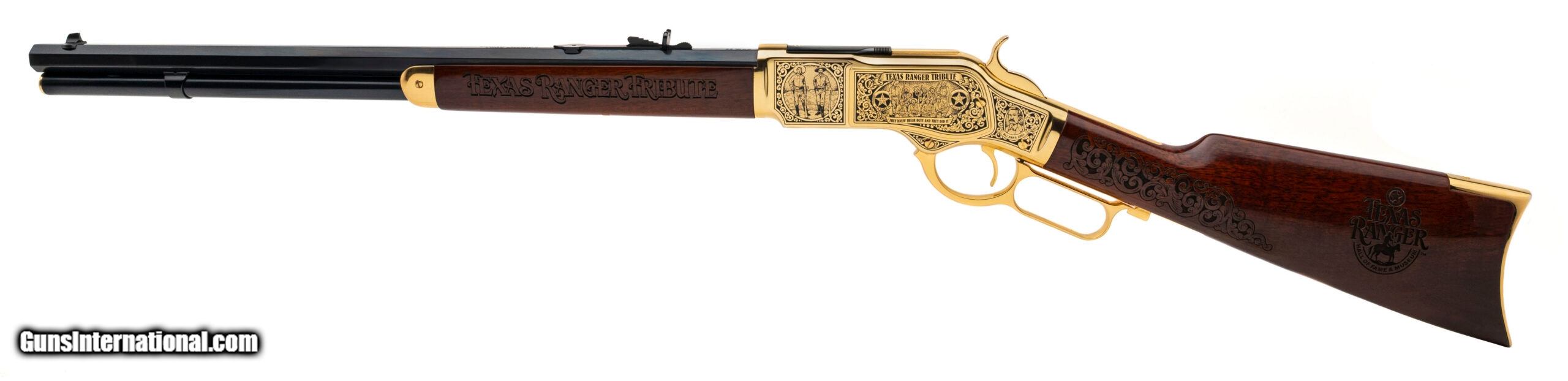 Description: "SN: W26731. Modern production, .44 WCF with a 20"" blued finish octagon barrel. Bore is bright with strong rifling. One of 300 made Texas Ranger Commemorative lever action rifle with a gold plated receiver & accents w/etchings, wood furniture w/engravings, and a lever lock. Near excellent condition overall. Price: $2,250.00 Contact Seller |