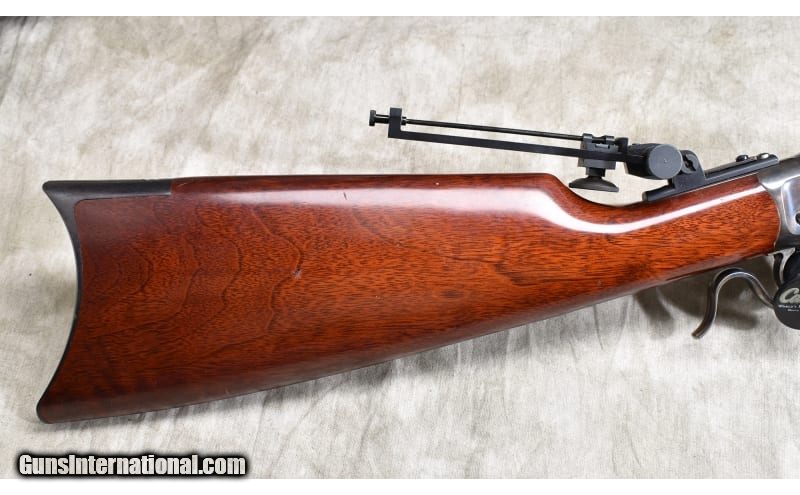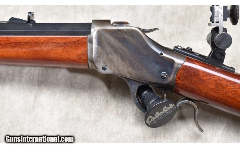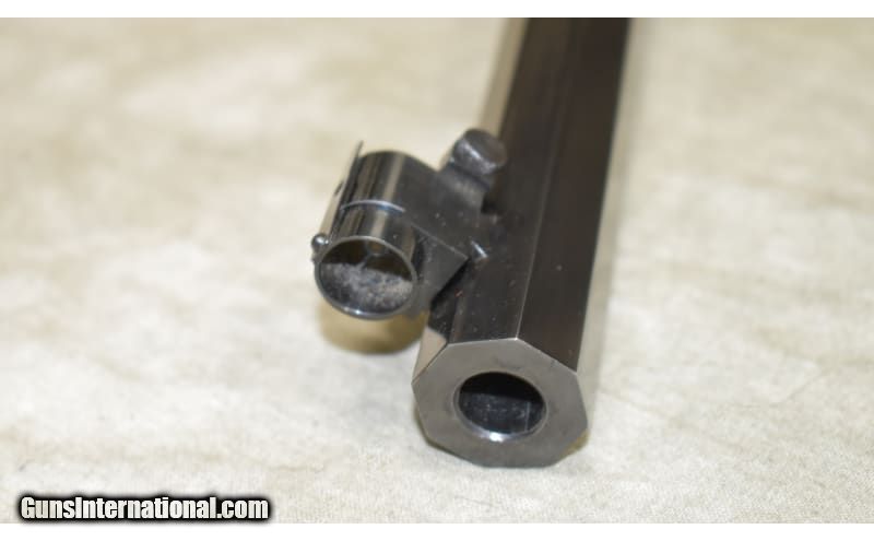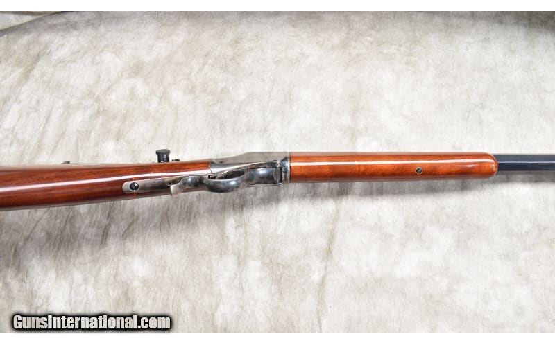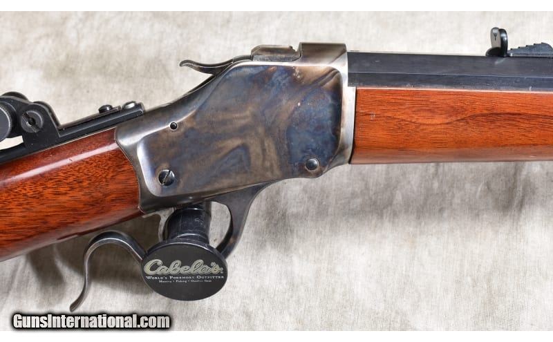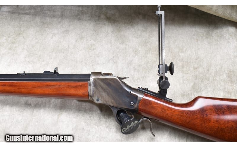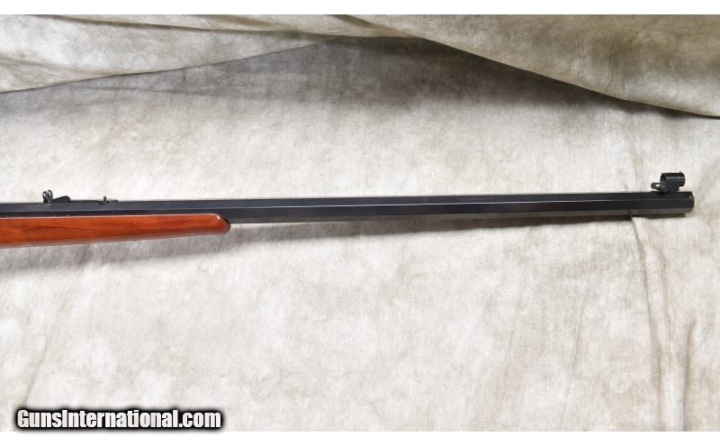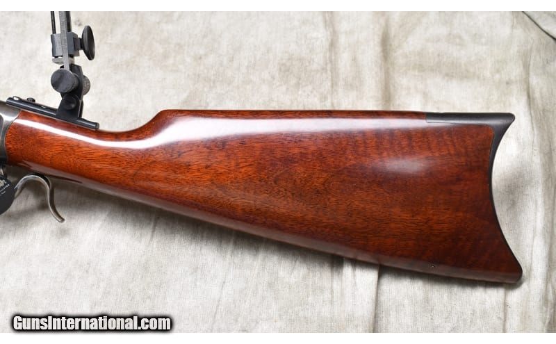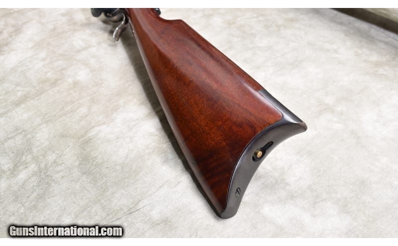Description: Very nice target and hunting rifle featuring matching fore end and "perch belly" stock, heavy 30-inch octagonal barrel, and target sights. It has good adherence to the Winchester 1885 standard plus the benefit of modern materials and engineering. .45-70 Government SOLD Chambers: Single Shot Metal Condition: Very good. A few pits showing on the receiver flats. Wood Condition: Very good. There a few handling marks. Bore Condition: Shiny and bright Barrels: "30-inch, heavy contour, hexagonal Triggers: Factory single trigger. Stock Dimensions: 14-inch LOP. Fore End: Well-matched walnut. Butt Pad: Curved steel plate. Weight: 9 lb Sights: Hooded Globe front sight with bubble level. Buckhorn notch rear sight. Vernier peep tang sight. Item Location: Rogers |