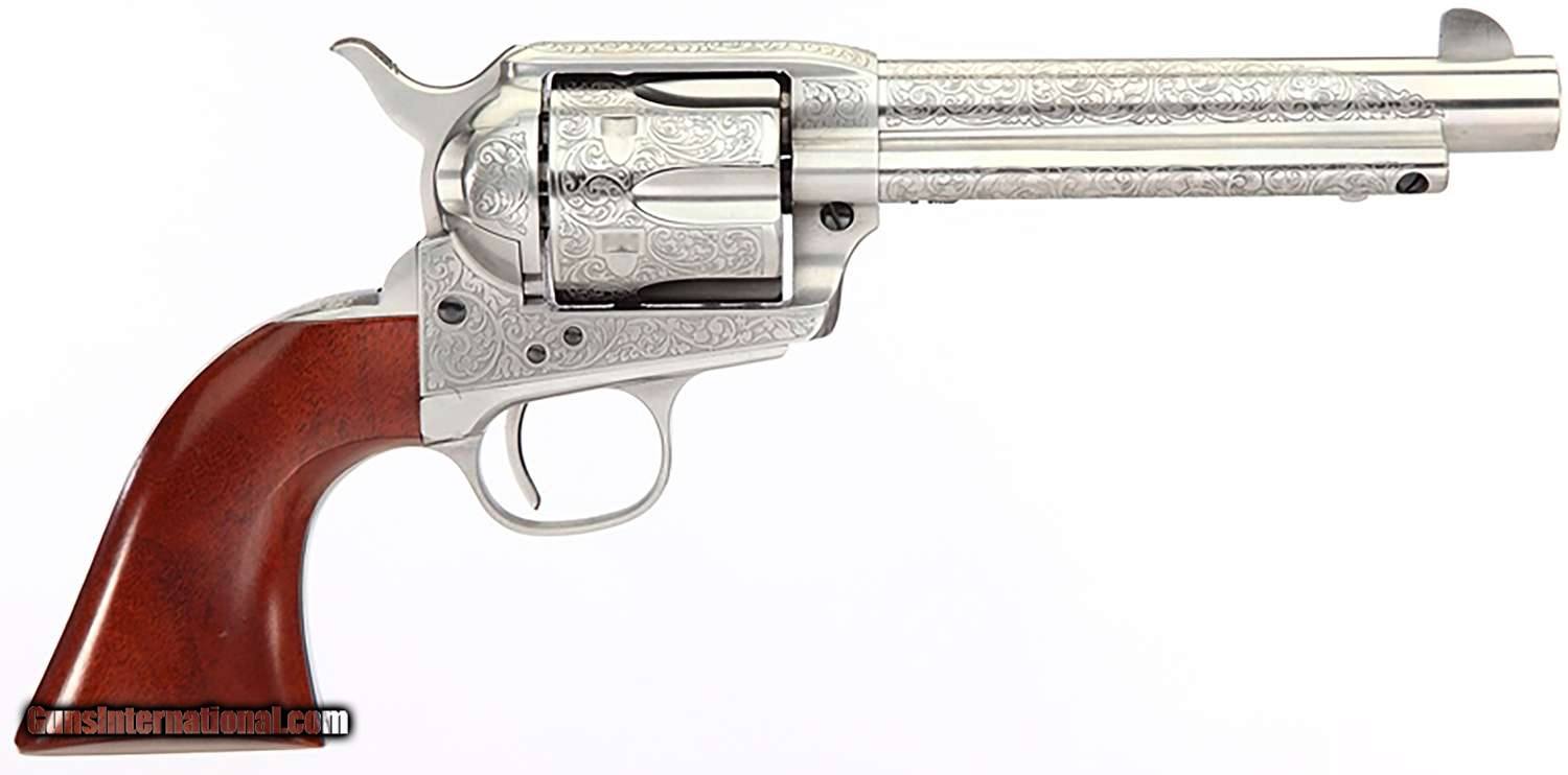 Description: Guns Listing ID: 153644 A Taylors exclusive this revolver is laserengraved in an all floral pattern and hand chased to give depth to the engraving. The Floral engraved Cattleman is built on a new model forged steel frame in a white heattreated finish cared for like blued steel. With a simpler engraving pattern this model is an great economical option while still offering excellent engraving. Features a fixed front sight blade with rear frame notch and a Navy size walnut grip. SOLD Manufacturer: TAYLOR‚‚S & CO Model: 1873 Caliber Info: .45 LC Condition: new Barrels: 5.5 BARREL Action: REVOLVER Finish: NICKEL Weight: 2.5 LBS. |