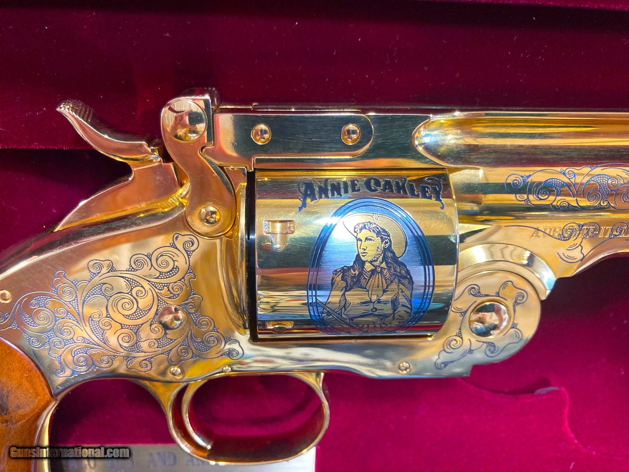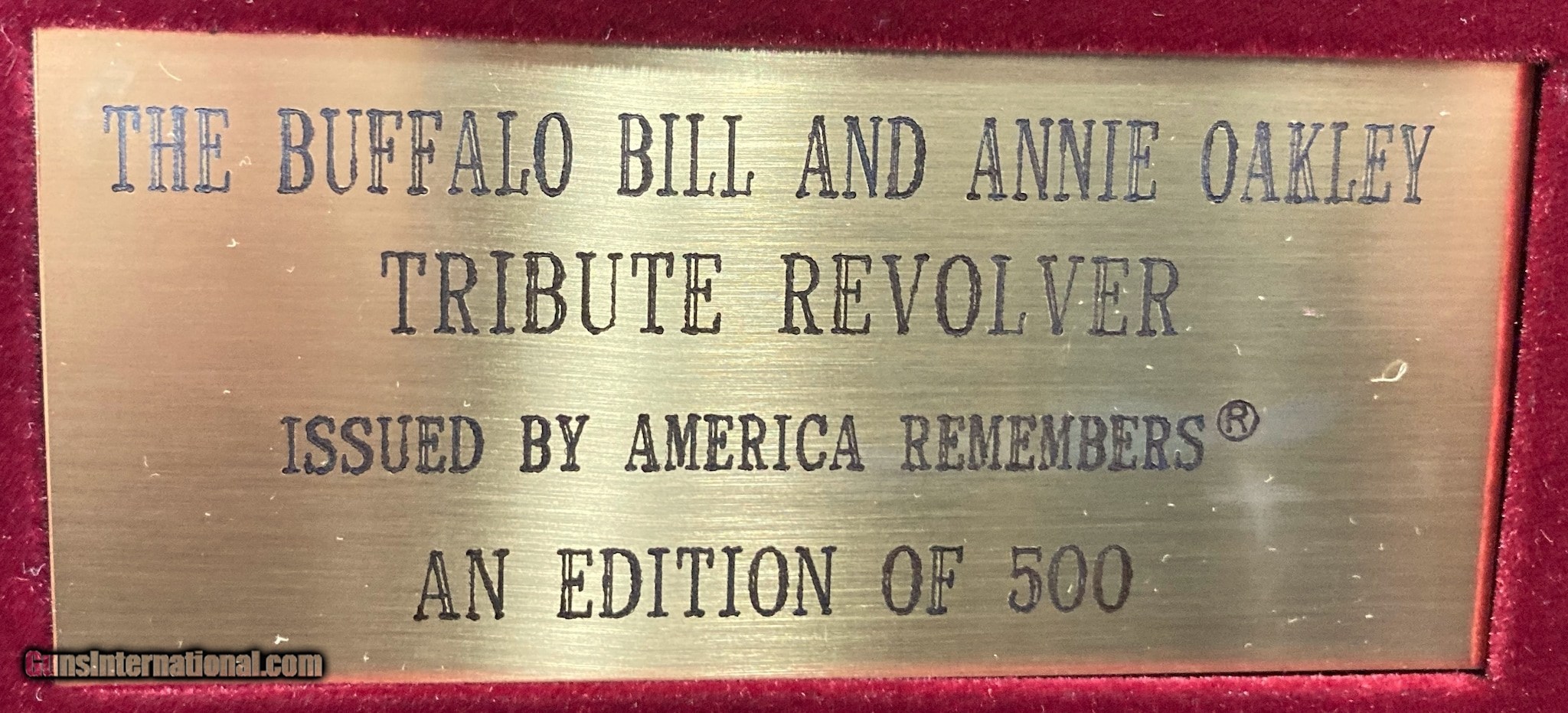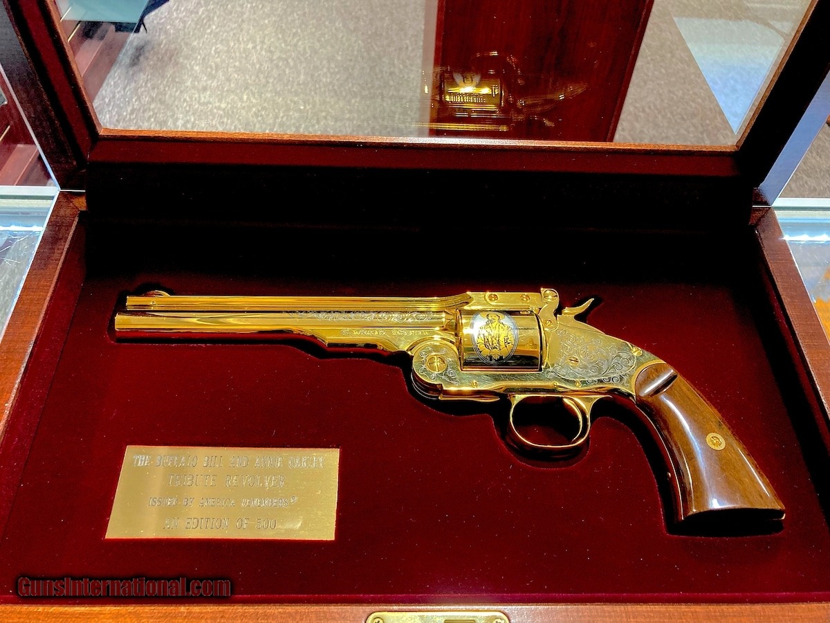 Description: Guns Listing ID: 842726 The Buffalo Bill and Annie Oakley Tribute is a working top-break revolver, No. 3 2nd Model revolver, in caliber .44-40. Craftsmen commissioned specifically for this project by America Remembers polish and decorate each working revolver in sparkling 24-karat gold, and the unfluted cylinder features classic images of Buffalo Bill and Annie Oakley with a nickel background. In magnificent detail, this Tribute captures the excitement and thrill of the Wild West extravaganzas that made Buffalo Bill and Annie Oakley famous around the world. This Tribute is available exclusively from America Remembers, with an edition that is strictly limited to only 500 Tribute revolvers. “A love of the gun was just born in me.” – ANNIE OAKLEY With Original Order Papers. SOLD Manufacturer: TAYLOR‚‚S & CO Model: 1875 S.A. SCHOFIELD Caliber Info: .44-40 WIN Condition: Used - Non-Certified Barrels: 7 BARREL Finish: GOLD PLATED |
