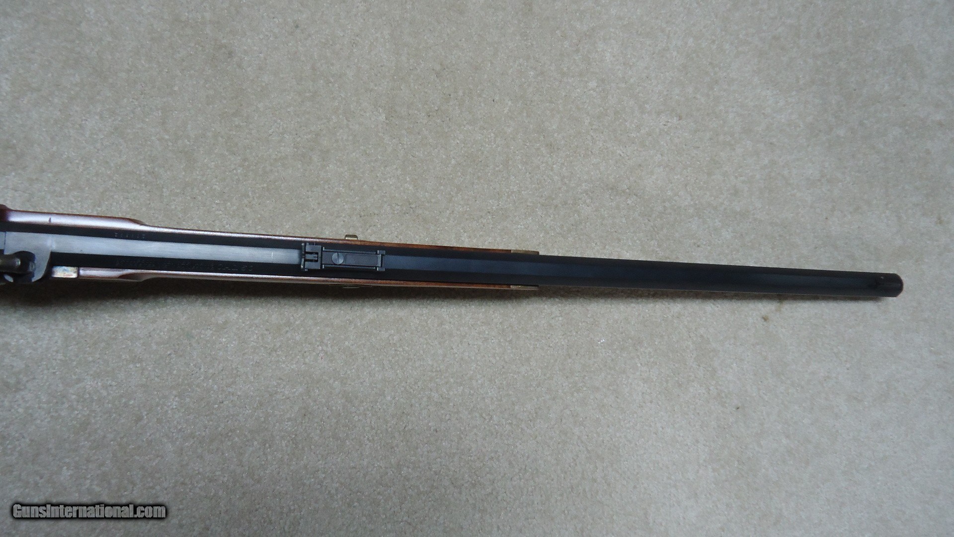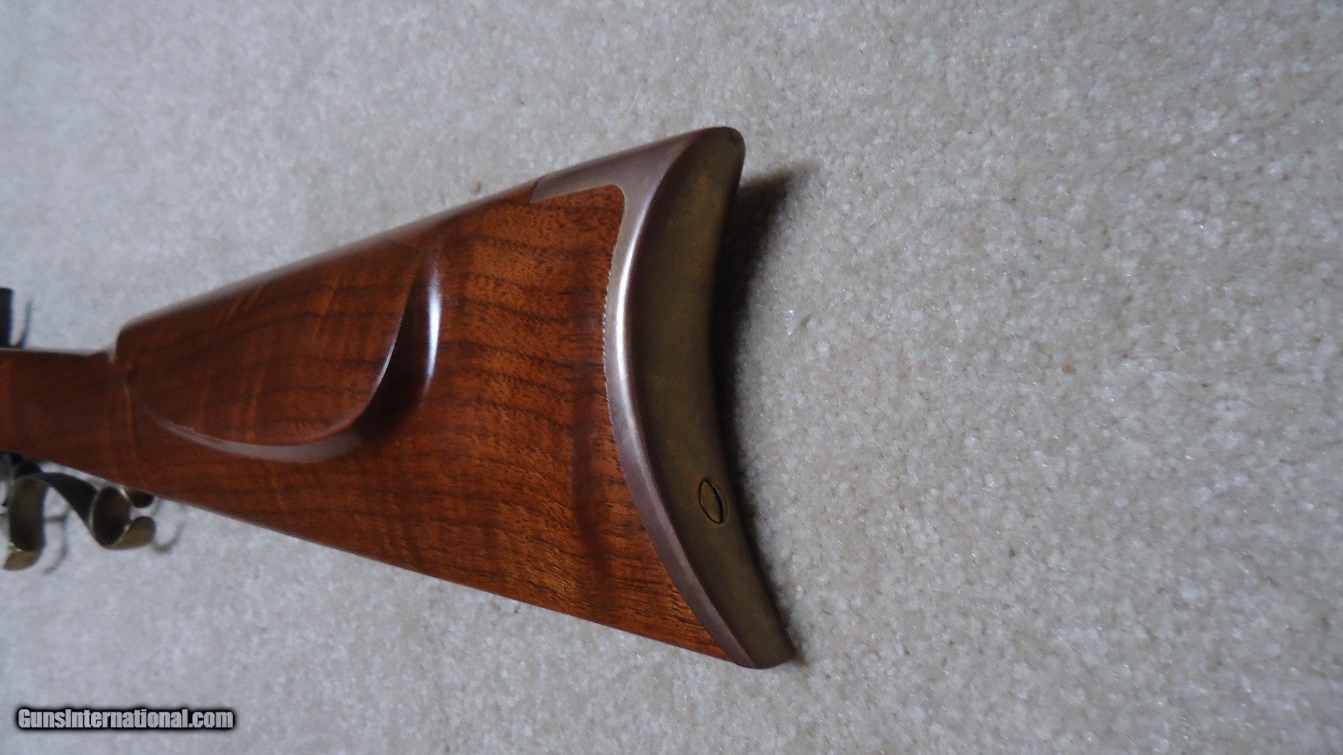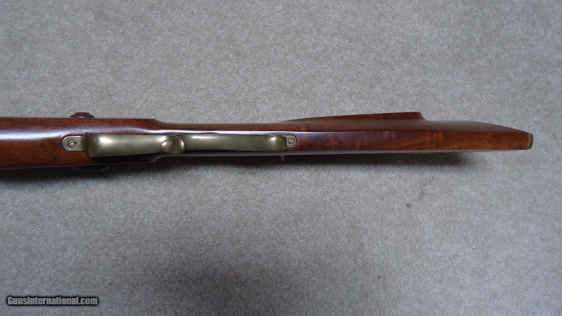 Description: DISCONTINUED THOMPSON-CENTER .50 CALIBER PERCUSSION HAWKEN RIFLE. These made in the U.S. muzzle loaders were among the best of the Hawken reproductions. They were introduced in 1970 and discontinued about ten years ago. They feature double set triggers, brass furniture and patchbox (with cleaning jag inside), color case hardened engraved lock and hammer, walnut stock, stout 28" octagon barrels and an adjustable rear sight. These are no longer manufactured, which is too bad as the quality in these American made rifles is hard to beat. This example shows a really nice fairly fancy walnut stock and is in excellent condition overall, having seen limited to no use. Aside from a few handling marks in the wood that you'd have to look for, it is in near new condition with uncleaned/unpolished brass. These are still a bargain (if you can find one) compared to the prices of new Italian replicas of lesser quality. I've been shooting T/C muzzle loaders for years and they are fine shooting guns. Loaded with a light powder charge and a round ball, they make great target/plinking guns. Loaded with a T/C Maxi bullet and 90 or 100 grains of black powder make it the equivalent in power of the big Sharps buffalo guns of the 1870s. Nice ones like this are getting hard to find. SOLD Antique: Yes Manufacturer: Thompson-Center Model: HAWKEN Serial Number: 239XXX Barrel Length: 28" OCTAGON Condition: EXCELLENT |