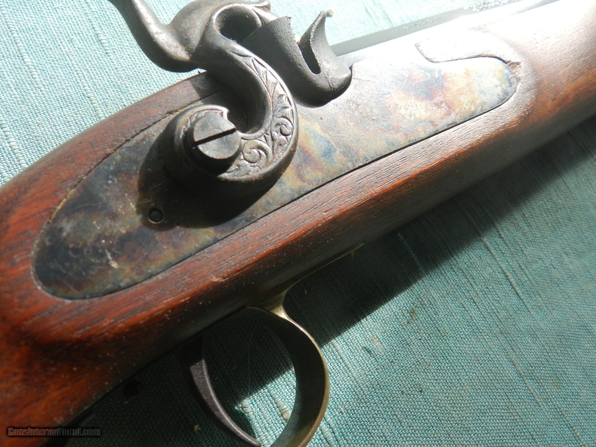 Description: SOLD With a serial number of #54860,[ossible an early Sharon or Freen Mountain barrel of .45 cal., 28” octagon barrel with a bright very good plus bore showing an area of light oxidation in the strong rifling. The barrel retains about 96-97% original blue with some scattered spots of light pitting and oxidation. The lockplate and hammer retain most of their original case-hardened finish also showing some spots of light oxidation. The brass mountings have aged to a lightly-tarnished warm goldenrod patina. The svelte smooth American walnut straight grip stock with left side cheekpiece rates very good plus to near excellent with a tiny chip ahead of the lockplate and a small filled hole on the toeline just ahead of the toeplate.This being a smaller form and lighter weight than the .50 cal Hawken. The original sights and brass-tipped ramrod are intact and the double set triggers and action appear to function well mechanically. And comes with a brass patch box. When buying a gun always have it examined by a competent gunsmith before shooting. To buy a gun from me you must get a direct email for me, with details, and shipping cost. We don’t have a web site .I prefer money orders or a check. Item ships when funds come in. I try to keep guns affordable, which means I make less money than most dealers. You won’t get altitude sickness, or nose bleed, with my prices! I consistently have the best selection of older guns If you attempt to buy, you must still contact us for details . Best to email to buy. Sometimes a local person can stop buy and purchase before the gun is removed. Sometimes not home to get calls. Some guns are required shipment to a gun dealer near you for a transfer to you when it arrives. Otherwise many older or black powder guns ship to your door. With the widest selection of older guns at great prices, We don’t have a store, and sell on the internet only. I’m easy to get along with. Thank You SOLD |