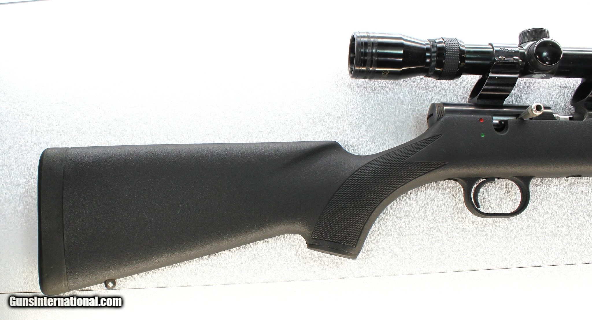 Description: Guns Listing ID: 1099587 SER#16289, .50 cal., 21” barrel with a good bore showing spots of light pitting throughout the strong rifling. The metal surfaces retain about 95% original blue with a couple spots of loss on each side of the barrel toning to gray, with those on the left side of the muzzle displaying some pinprick pitting, a few scattered tiny freckles of light oxidation, some fine scratches and light high edge silvering and a few tiny impact marks around the breech. The bolt is bright and the polymer pistolgrip stock rates about good with some scattered light handling from the field. The original sights and sling swivel studs are intact, an alloy ramrod with minor silvering on its tip is included and mounted to the receiver one Tasco 3-9x40 optic retaining about 96% original black anodized finish with some light high edge wear. A fair example of these early inline black powder rifles. SOLD Manufacturer: THOMPSON/CENTER ARMS Model: 50 CAL muzzle loader THUNDER HAWK BLACK POWDER wood stock Caliber Info: .50 BPM Condition: Used - Non-Certified Barrels: 21 BARREL Finish: BLUE AND BLACK |