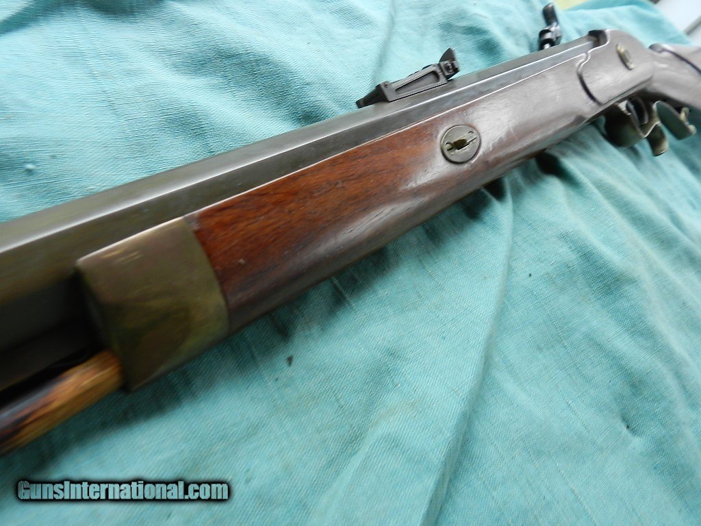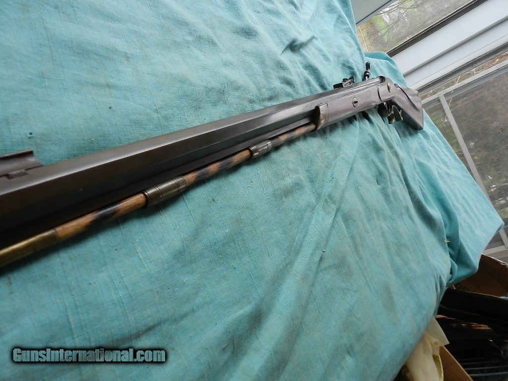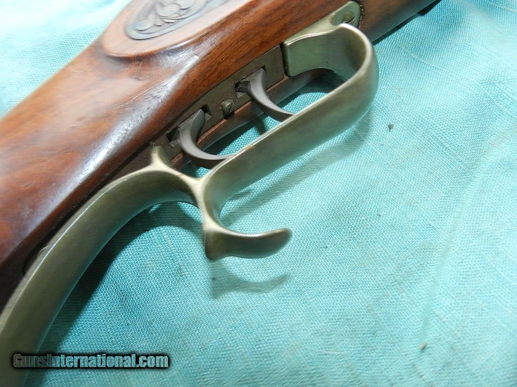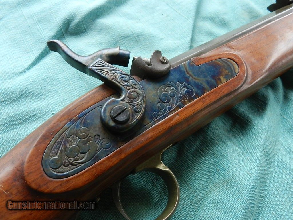 Description: <<<<SOLD>>>>A very good shooter this .45 cal.,T.C with a 28'' octagon barrel with a mostly bright about very good plus bore showing some light oxidation in the grooves of the strong rifling. The barrel and barrel tang of this attractive rifle retain about 95-96% custom applied brown finish with some light high edge silvering, a couple small spots on the top of the barrel toning to gunmetal gray, some scattered small areas of light oxidation staining and a few light handling marks overall. The lockplate and hammer retain 99% original case-hardened colors with a few speckles of light oxidation and the brass furniture have aged to a very lightly-tarnished ochre patina. The smooth walnut halfstock with left side cheekpiece rates very fine to near excellent with a few scattered light handling marks from field use. The barrel is sighted with a beaded blade front and fully-adjustable ''U'' notch rear, a brass tipped hardwood ramrod is included which is difficult to remove with the barrel wedge in place, the edges of the nipple are lightly flared, the rifle is equipped with double set triggers and the action is strong and crisp. A nicely-finished Thompson/Center Hawken rifle.When buying a gun always have it examined by a competent gunsmith before shooting. To buy a gun from me you must get a direct email for me, with details, and shipping cost. We don’t have a web site .I prefer money orders or a check. Item ships when funds come in. I try to keep guns affordable, which means I make less money than most dealers. You won’t get altitude sickness, or nose bleed, with my prices! I consistently have the best selection of older guns If you attempt to buy, you must still contact us for details . Best to email to buy. Sometimes a local person can stop buy and purchase before the gun is removed. Sometimes not home to get calls. Some guns are required shipment to a gun dealer near you for a transfer to you when it arrives. Otherwise many older or black powder guns ship to your door. With the widest selection of older guns at great prices, We don’t have a store, and sell on the internet only. I’m easy to get along with. Thank You SOLD |