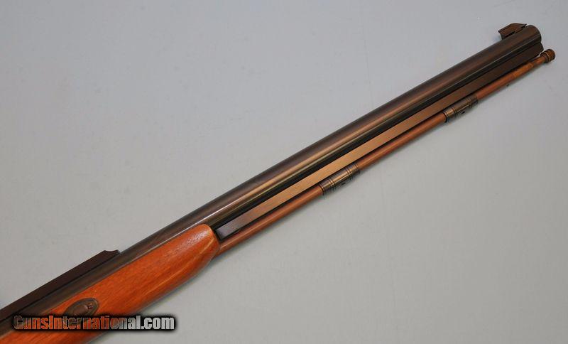 Description: .50 cal. Serial number 85899. 26" round barrel. Bead front sight with T/C scope base & rings. Case colored lock. Walnut stock with iron buttplate & fitting. Brass tipped nylon ramrod. 98% original blue & case colors. Stock shows some scratches & marks. Very good bright bore. Sound mechanics. Priority mail $25. SOLD |