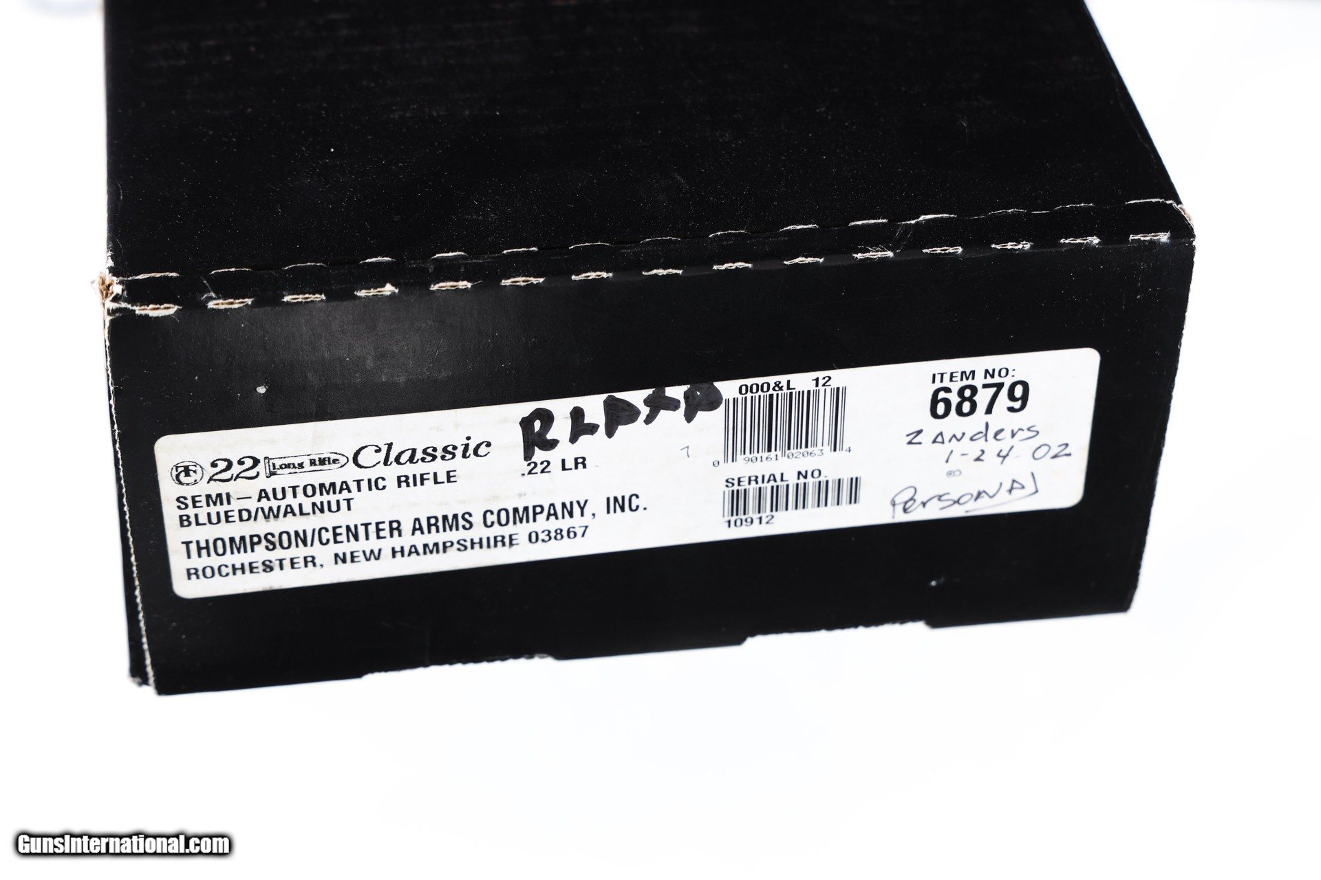Description: Like new with factory box numbered to gun. The Thompson Center Classic semi-automatic .22 lr is a high-accuracy, low-recoil rifle with performance among the best in its class. This model can be tough to find, as its production is now discontinued. Great for small-game, varmints, and target shooting, this design incorporates a detachable magazine, a 1-piece smooth walnut pistol-grip stock, black TC grip cap and buttplate, a raised red bar high visibility front sight paired with an adjustable notch high visibility green ramp middle sight, sling loops, stainless-steel bolt, and a blued finish. • Free Shipping, No Credit Card Fees. • Lay-a-way available for this firearm. • 1/3 Down, a 1/3 in 30 Days 1/3 in 60 Days. SOLD Manufacturer: Thompson Center Model: Classic Serial Number: 10912 Barrel Length: 22 |