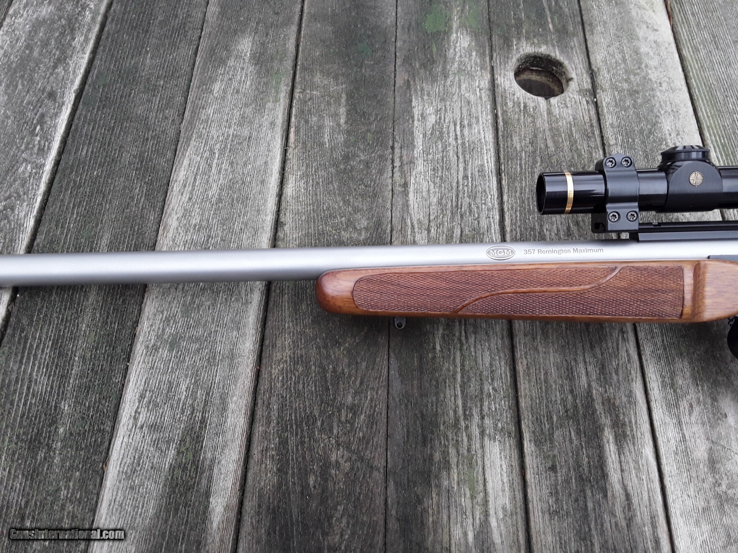 Description: TC G2 carbine with 20" stainless bull MGM 357 max barrel with 1 in 16 twist. 33 3/4" overall length. Bellm trigger kit professionally installed by gunsmith, 2 pounds and crisp. Bellm oversized hinge pin. Comes with 1.5 x 5 Leopold Vari x III and Warne rings pictured. Custom checkered stocks. Very good plus overall condition. One small imperfection in the casting of frame (shown in pictures). Includes two full boxes of 200 gr ftx bullets and 96 XTP 180 gr bullets (not loaded ammo). 200 new Remington brass and 39 fired Remington brass. If you have a set of 357 mag dies you can use them to reload this cartridge, just run them out. This gun consistently shoots under 1" at 100 yards and would make a great mid western whitetail rig. I don't ship to California. Shipped and insured for $75 to your FFL. Bank check or USPS money orders. It is best to text me. I would be happy to answer any questions or talk to you about this gun. $1395 SOLD Rifle Caliber: .357 Magnum Manufacturer: Thompson center Model: G2 Barrel Length: 20 Condition: Very good plus Bore Condition: Excellent Barrel Type: Stainless steel Action: Break open Triggers: Bellm |