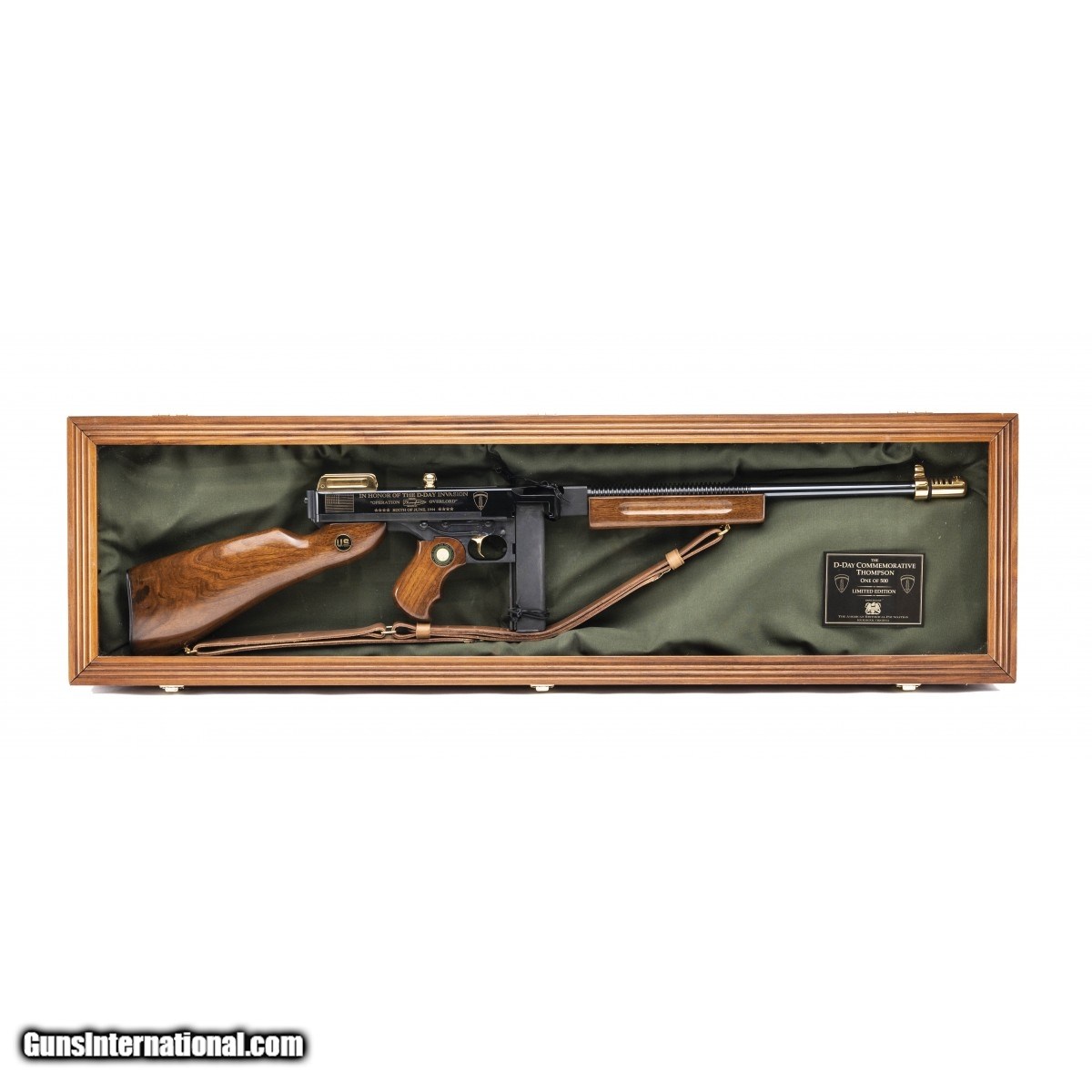 Description: " American Historical Foundation D-Day Commemorative Thompson semi-auto carbine. Beautifully done with polished blue finish and gold decorations. Comes in wood and glass presentation case. SOLD |
