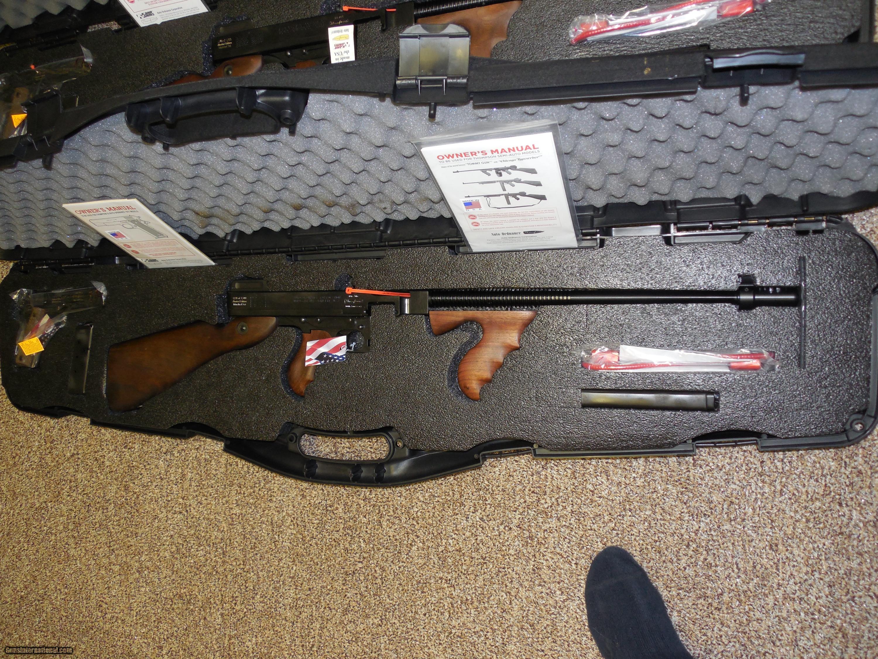Description: FACTORY NEW IN BOX CLICK ON PICTURES TO ENLARGE YOU GET MACHING NUMBERS: 1927- A1 THOMPSON & 1911- A1 THONPSON 45 ACP PISTOL FACTORY NEW IN BOX Product Description Thompson's limited edition 100th Anniversary 1927A-1 Deluxe Carbine is offered in .45 ACP and comes with one 20-round stick magazine. It features a 16.5" finned barrel (18" with compensator) and is prominently engraved with the classic Thompson logo, limited edition numbers, and displays the words "100th Anniversary" on the matte black steel frame. It weighs 13 lbs. and has an OAL of 41". Other features include a pinned in front blade sight and an open rear adjustable sight. The fixed buttstock, pistol grip, and vertical foregrip are made from luxurious American Walnut. NOTE: This item is sold as a matched set and must be purchased with 1911-A1 100th Anniversary pistol. These guns are shipped together in a polymer hard case with the yellow Thompson Bullet logo and the words "Chicago Typewriter" in white stamped on the black case cover. Specifications Action:Semi-Automatic Caliber:45 Automatic Colt Pistol (ACP) Barrel Length:16.5" 1927 A1= Capacity:20+1 1911 ACP PISTOL = 7+1 OAL:39" Weight:13 lbs Stock Description:Walnut Muzzle:Compensator Sights:Blade Front, Adjustable Rear Barrel Description:Finned YOU GET MACHING NUMBERS: 1927- AI THOMPSON & 1911-A1 THONPSON 45 ACP PISTOL WE HAVE NEW THOMPSON 50 ROUND DRUM FOR $ 251.99, FREE SHIP WITH GUNS HAVE ONE NEW 100 ROUND THOMPSON DRUM $ 579.99, FREE SHIP WITH GUNS PAYMENTS: WE TAKE: Money Orders, Certified Checks & Credit Cards, (we charge 3% on Credit Cards because that is what they charge us.) PERSONAL CHECKS HELD TILL CLEARED Postal Money Orders & Credit Cards are preferred and ships the Quickest SHIPPING FOR HAND GUNS $ 25.00 U.S. SALES ONLY SHIPPING FOR RIFLES $ 30.00 U.S. SALES ONLY LAYAWAYS AVAILABLE PLEASE BE SURE THIS GUN IS LEGAL IN YOUR STATE I WILL SHIP GUN TO YOUR FFL DEALER; YOU NEED TO SEND ME THE PHONE # OF YOUR DEALER SO I CAN CALL FOR HIS OR HER FFL LICENSE All firearms must be shipped to a FFL transfer dealer. We ship to the US ONLY. It is your responsibility to make sure you comply with the laws of your county, state, and city on ALL item. We may sometimes use file photos instead of the actual gun. WHEN E-MAILING ME I WILL REPLAY, IF YOU DO NOT SEE A REPLAY FROM ME, CHECK YOUR JUNK MAIL, IT MAY GO THERE SOMETIMES I HAVE BEEN ON THIS SIGHT FOR OVER 5 YEARS AND HAD OVER 4,000 ITEMS SOLD. YOU CAN REST EASY WITH US. WE HAVE A PLATINUM RATING & WE ARE ALSO A VERIFIED SELLER WITH GUNS INTERNATIONAL. WE ARE THE HONEST & TRUSTED STORE. THANK YOU AND GOD BLESS OUR TROOPS!!!! JOIN THE N R A; THE GUN OR AMMO YOU SAVE MIGHT BE THIS ONE!!! By purchasing this Gun you certify that you are at least 21 years of age, live in a state where this purchase is not prohibited, you are not under indictment for, and have not been convicted in any court of a crime punishable by imprisonment for a term exceeding 1 year, you are not a fugitive from justice, are not an unlawful user of or addicted to any controlled substance, have not been adjudicated as a mental defective nor have you been committed to any mental institution and you are not an alien illegally or unlawfully in the United States. SEE ALL OF AA GUNS & AMMO’S ITEMS AT aagunsandammo (GUNS, AMMO, HOLSTERS, SCOPES, RED-DOTS, MAG LOADERS, EXTRA MAGAZINES, BAYONETS & MUCH MORE) NEW STUFF ALWAYS COMING IN. "A gun is like a parachute. If you need one, and don't have one, you'll probably never need one again." SOLD |