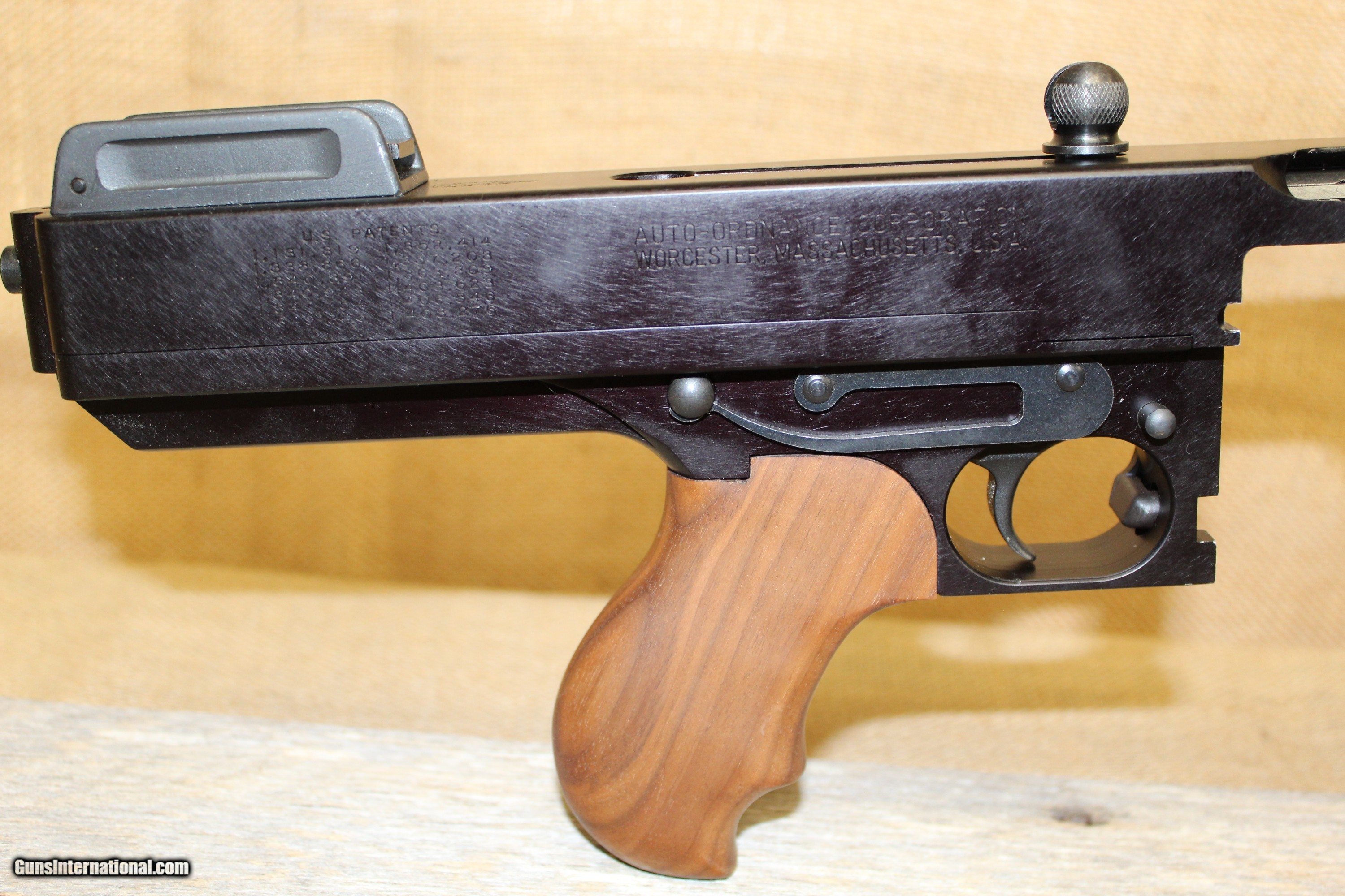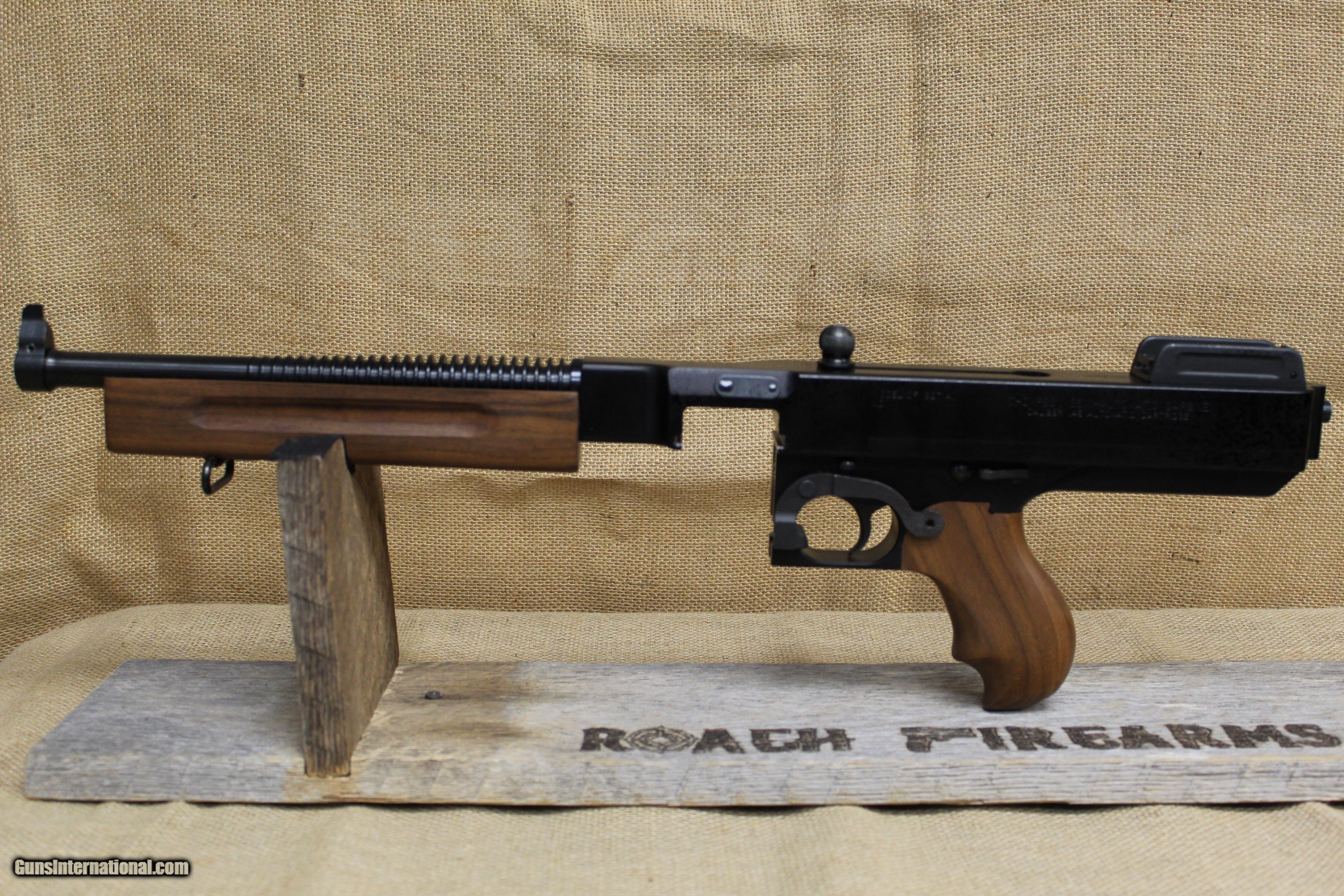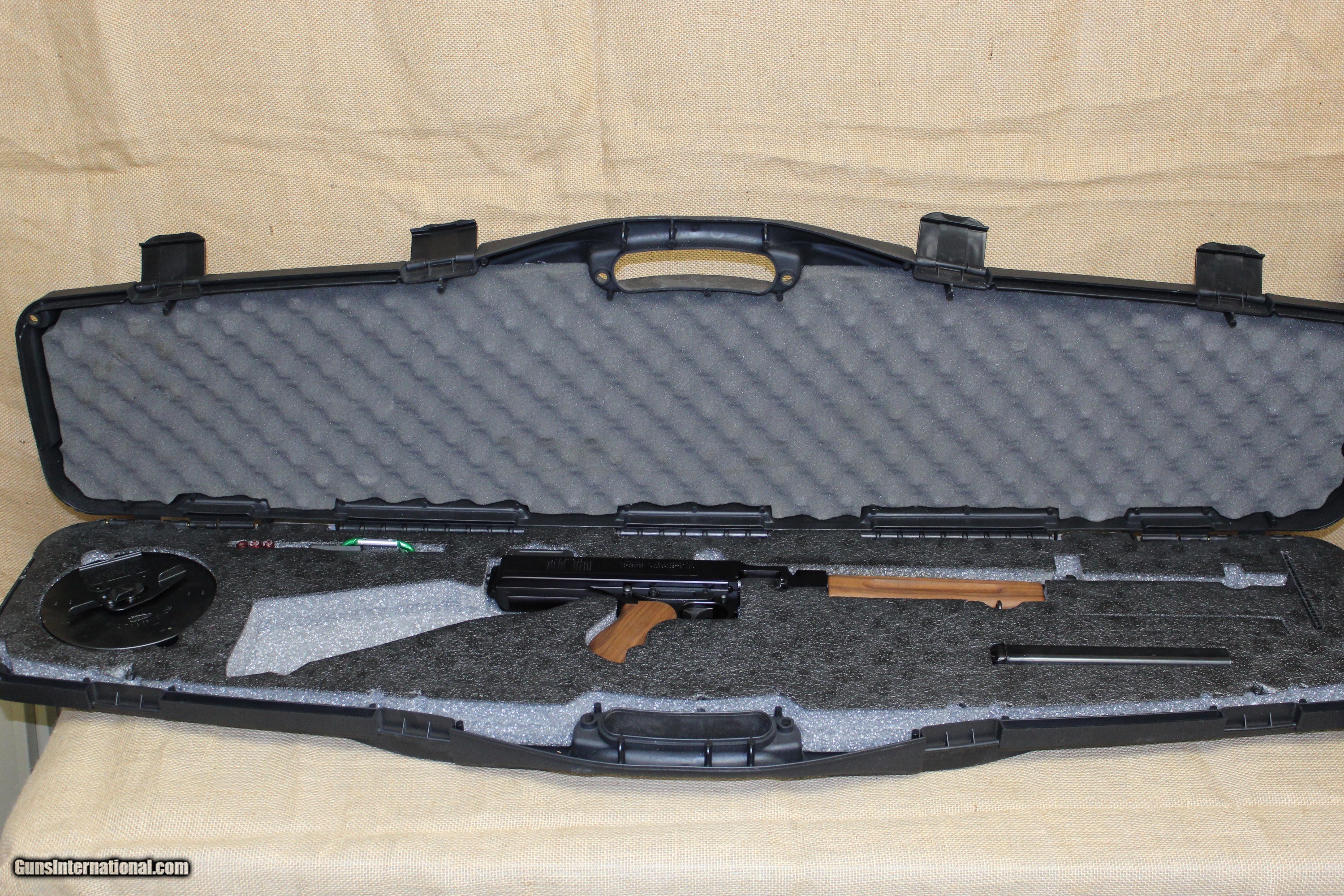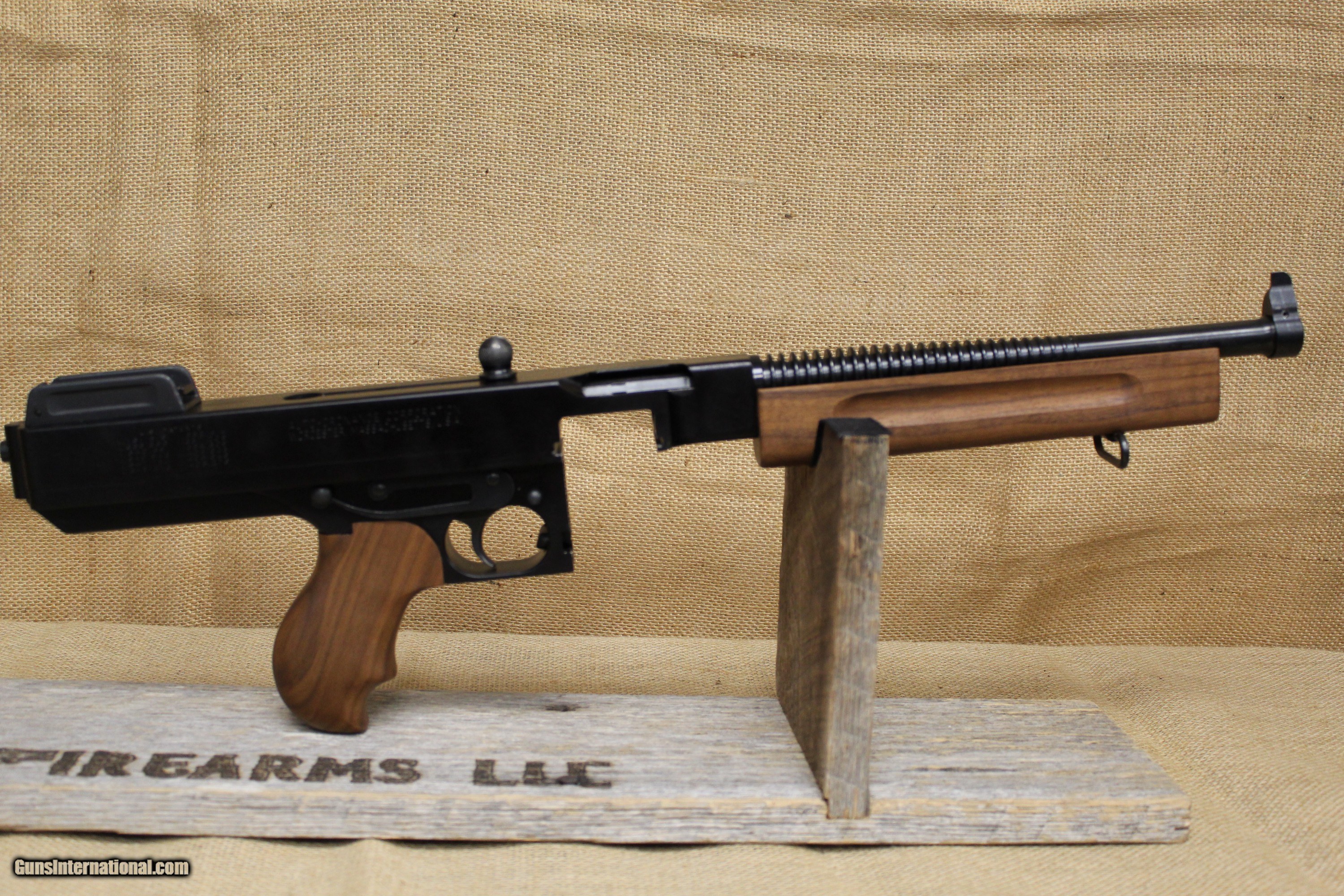 Description: Thompson model 1927 semi-auto 45ACP Pistol,11"barrel, 99% condition. 50 round drum mag, 1 stick mag, hard case. SOLD Handgun Caliber: .45 ACP (.45 Auto) Manufacturer: Thompson Model: 1927 Condition: excellent Metal Condition: excellent Wood Condition: excellent Bore Condition: excellent |