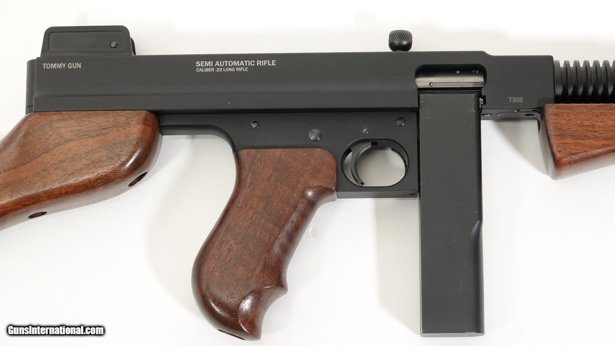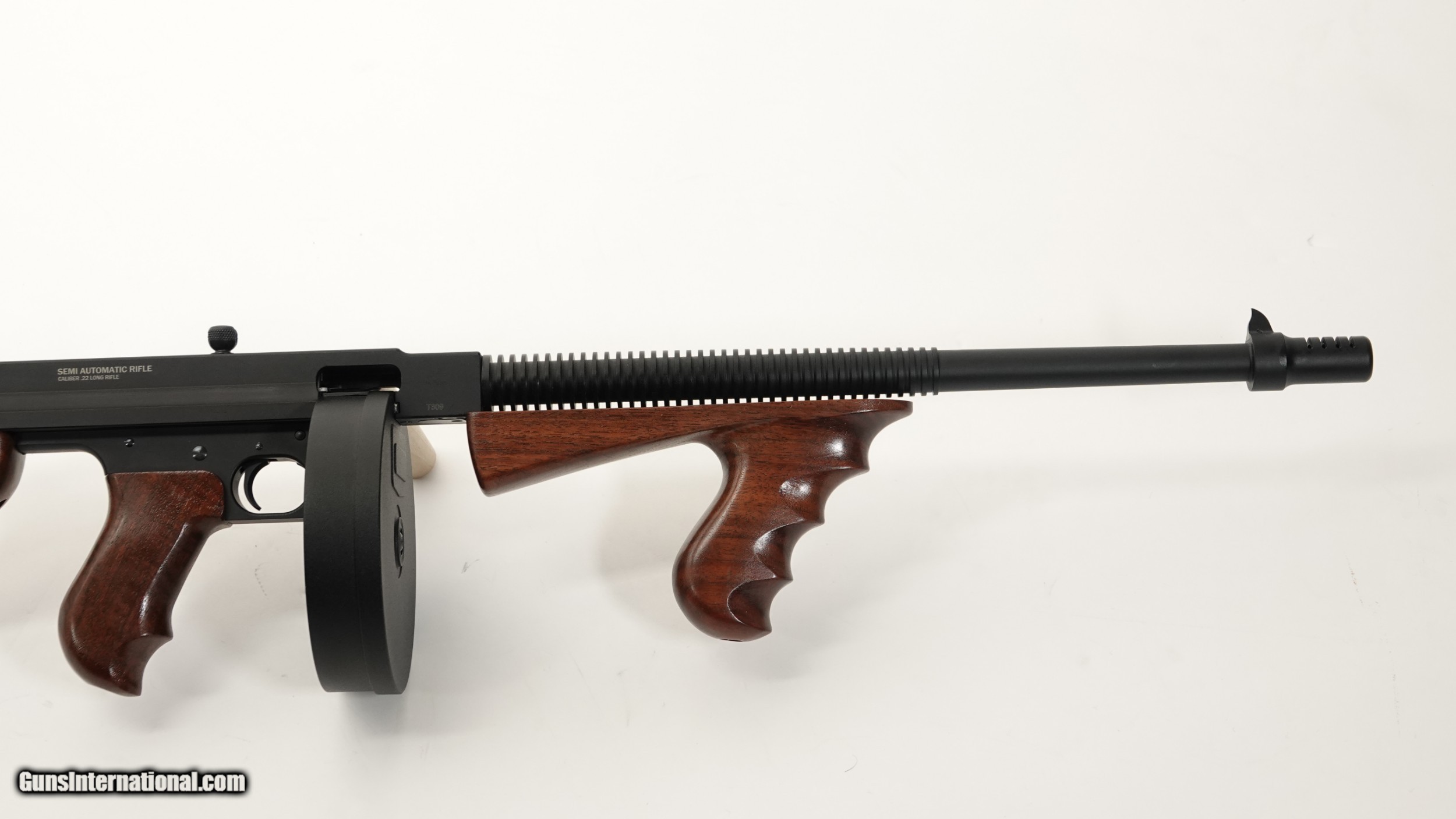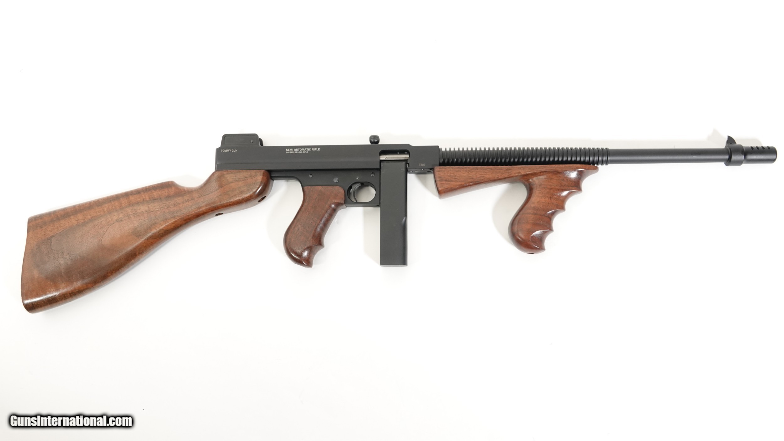 Description: Standard Manufacturing Company- Thompson Model 1922, .22 Long Rifle, Semi Automatic Rifle, 16.4” barrel, walnut stock and grips, 1/2 size frame, the gun is completely machined out of aircraft grade aluminum. Standard Manufacturing Company is proud to offer the Tommy Gun Semi Automatic Rifle in .22LR This is the first time in history that a Thompson product is offered on a true scaled frame according to its caliber. Don’t confuse this gun with a crude finished gun, these guns are built like a Swiss watch, all metal and wood finishes are superior to any other comparable guns on the market, this gun is a marvel of modern engineering, it will be the centerpiece of your gun collection. Barrel Length- 16.4” Overall Length- 34 ½” Weight with 10 round magazine- 4lbs. 10oz. Optional 50 round drum (as shown) magazines are available separately. $1,100.00 We have a limited number of guns available for immediate delivery SOLD |