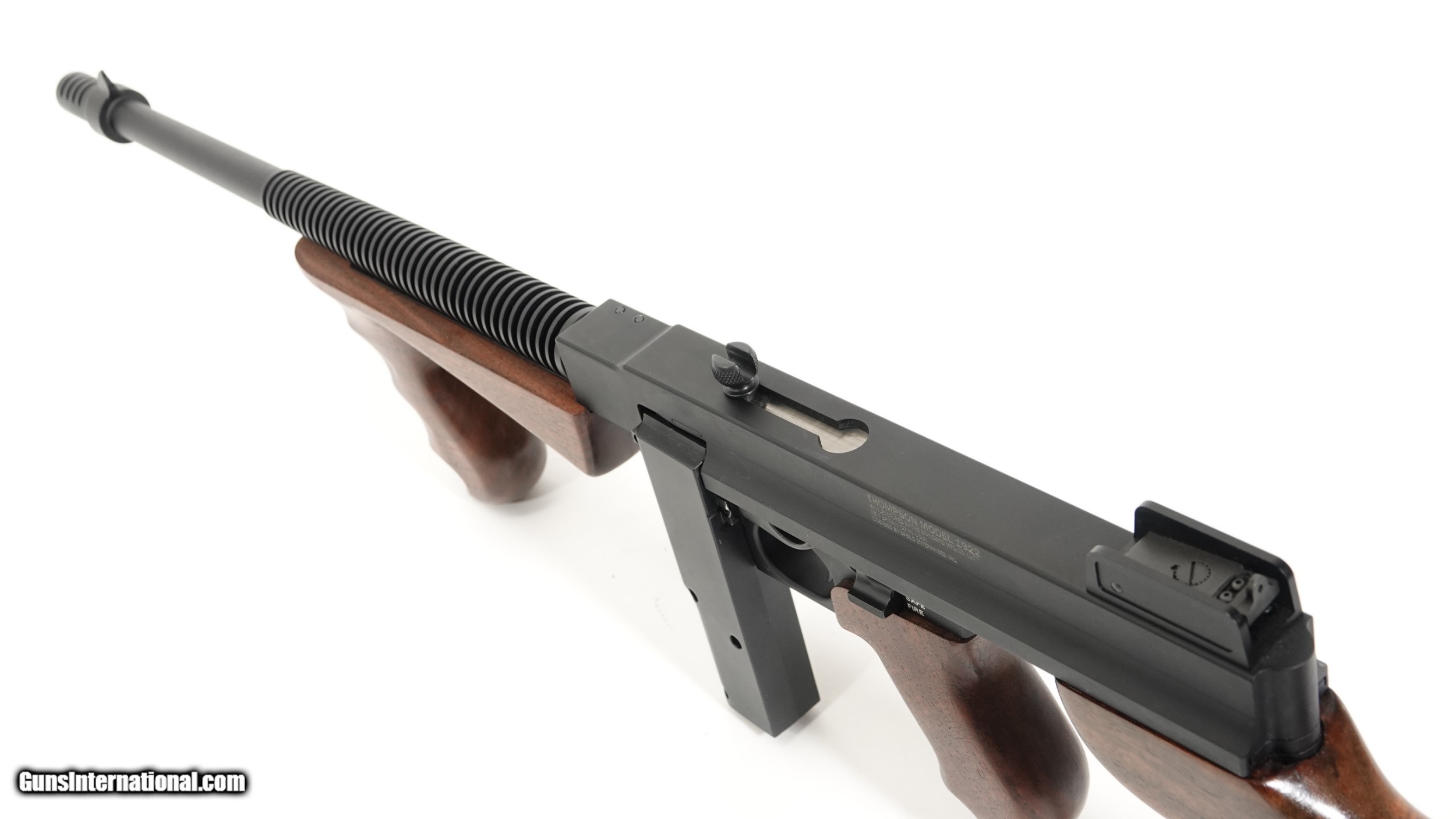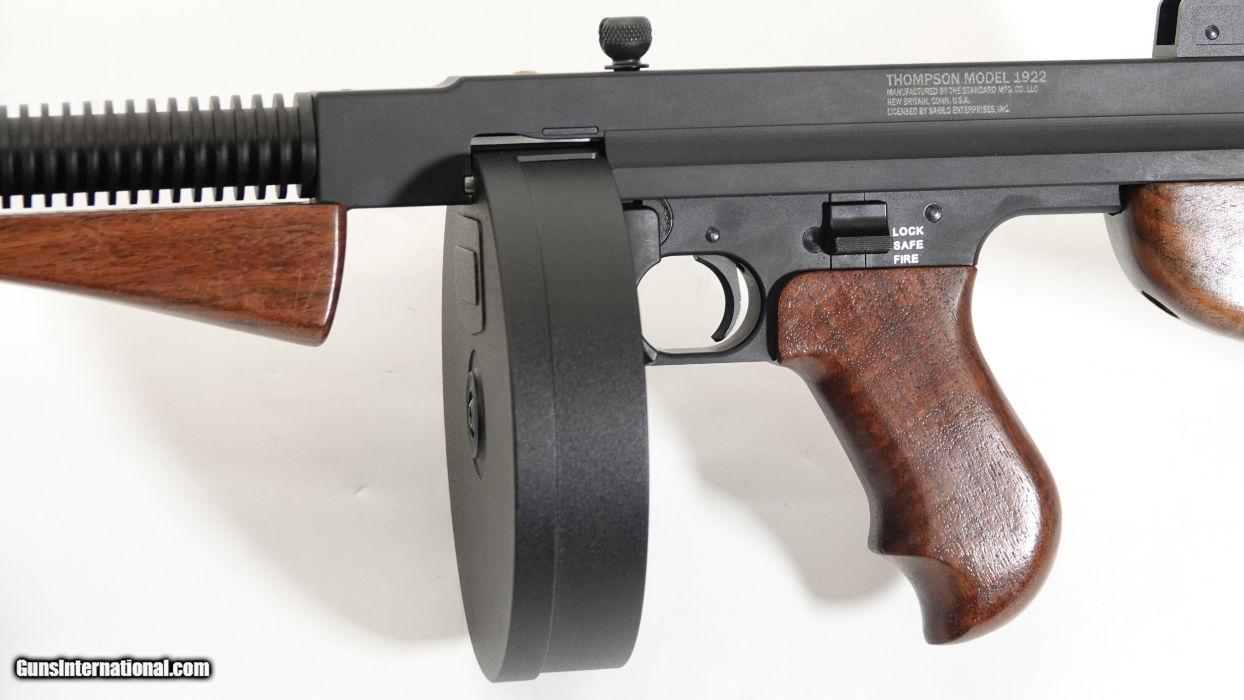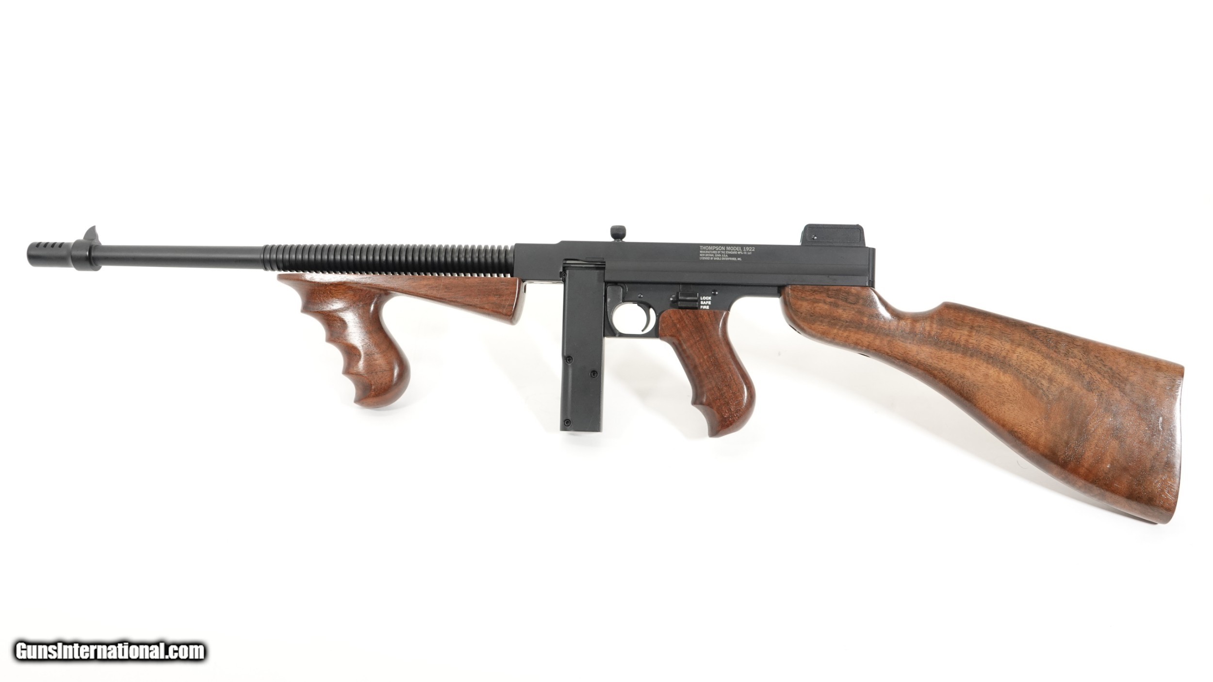 Description: Standard Manufacturing Company- Thompson Model 1922, .22 Long Rifle, Semi Automatic Rifle, 16.4” barrel, walnut stock and grips, 1/2 size frame, the gun is completely machined out of aircraft grade aluminum. Standard Manufacturing Company is proud to offer the Tommy Gun Semi Automatic Rifle in .22LR This is the first time in history that a Thompson product is offered on a true scaled frame according to its caliber. Don’t confuse this gun with a crude finished gun, these guns are built like a Swiss watch, all metal and wood finishes are superior to any other comparable guns on the market, this gun is a marvel of modern engineering, it will be the centerpiece of your gun collection. Barrel Length- 16.4” Overall Length- 34 ½” Weight with 10 round magazine- 4lbs. 10oz. Optional 50 round drum (as shown) magazines are available separately. $1,100.00 We have a limited number of guns available for immediate delivery SOLD |