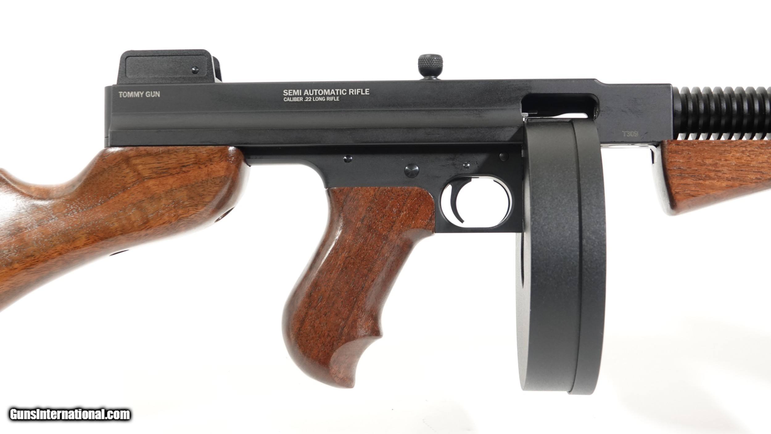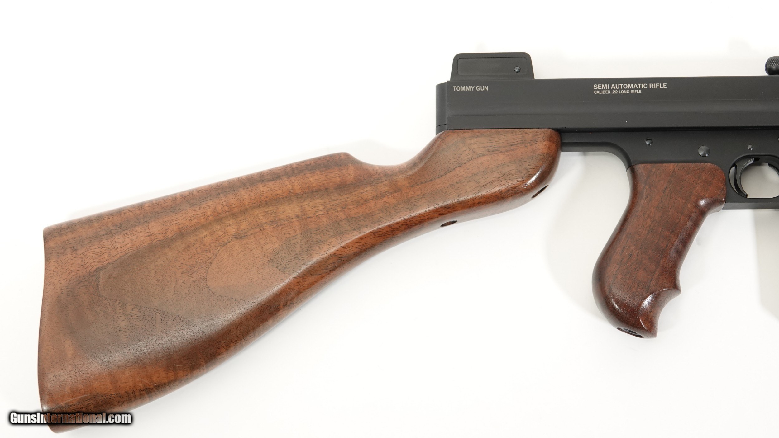 Description: Standard Manufacturing Company- Thompson Model 1922, .22 Long Rifle, Semi Automatic Rifle, 16.4” barrel, walnut stock and grips, 1/2 size frame, the gun is completely machined out of aircraft grade aluminum. Standard Manufacturing Company is proud to offer the Tommy Gun Semi Automatic Rifle in .22LR This is the first time in history that a Thompson product is offered on a true scaled frame according to its caliber. Don’t confuse this gun with a crude finished gun, these guns are built like a Swiss watch, all metal and wood finishes are superior to any other comparable guns on the market, this gun is a marvel of modern engineering, it will be the centerpiece of your gun collection. Barrel Length- 16.4” Overall Length- 34 ½” Weight with 10 round magazine- 4lbs. 10oz. Optional 50 round drum (as shown) magazines are available separately. $1,100.00 We have a limited number of guns available for immediate delivery SOLD |